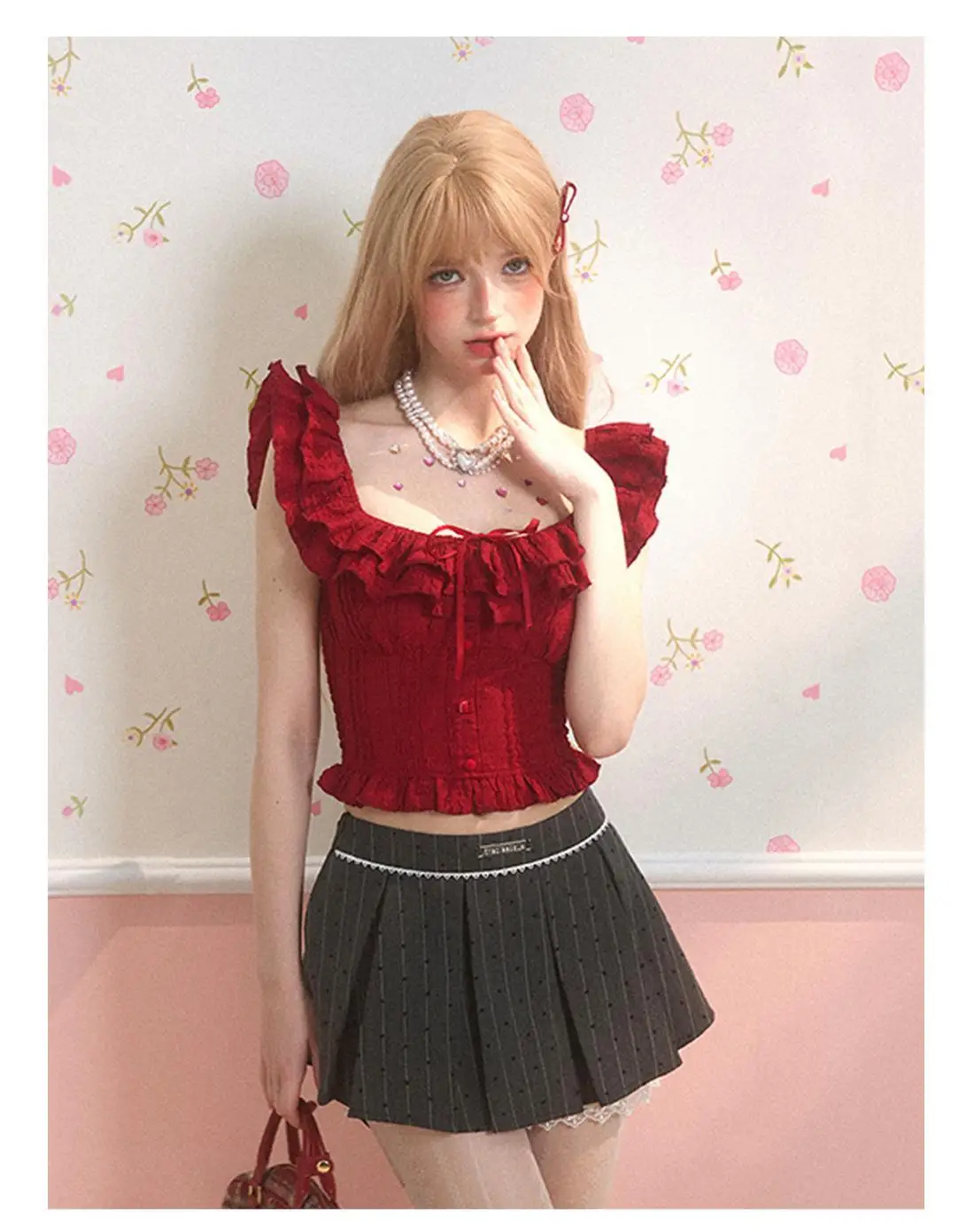 MQTIME - Red Flying Sleeve T-shirts for Women Ruffled Off Shoulder Crop Top Korean Style Summer Fashion Y2k Bodycon Slim Clothes