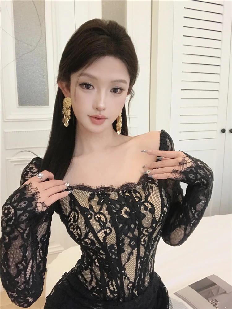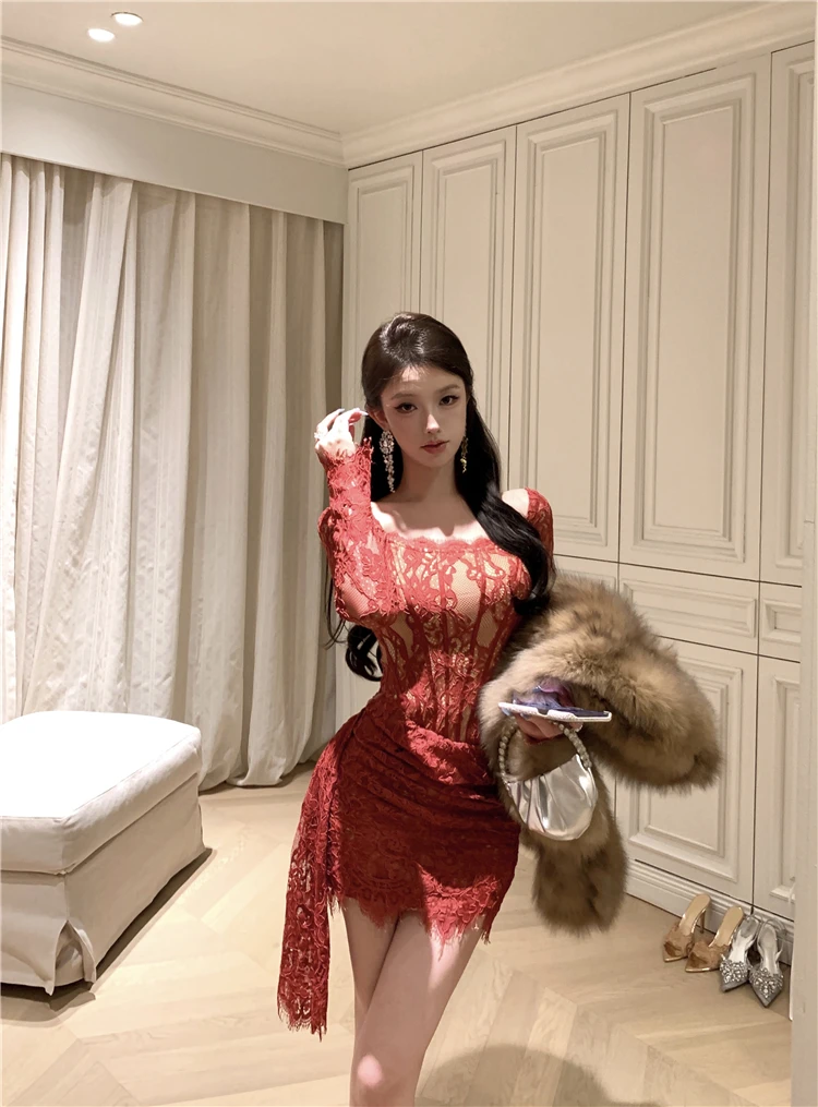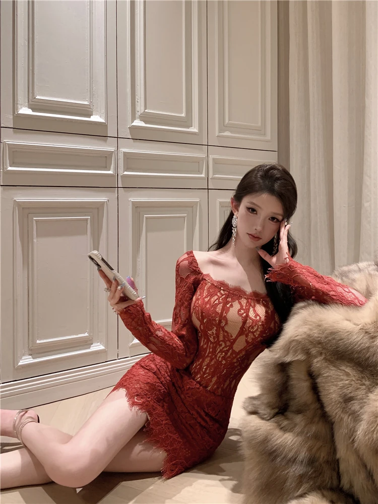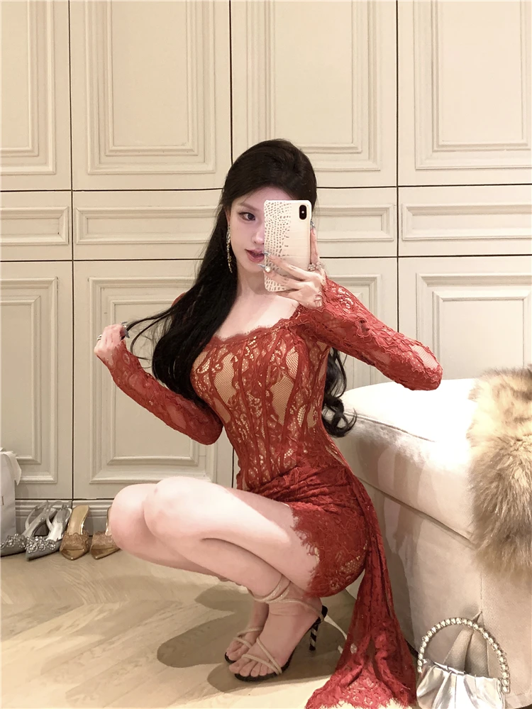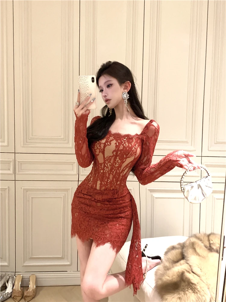 MQTIME  -  Red Lace Splice Long Sve Women's Dr Summer Tight Bodycon ort Skirt High Waist Commute Sle Faion Chinese Brand