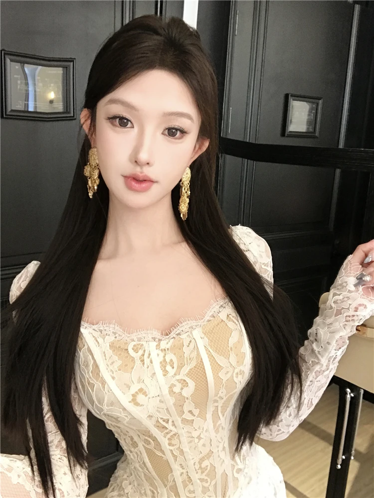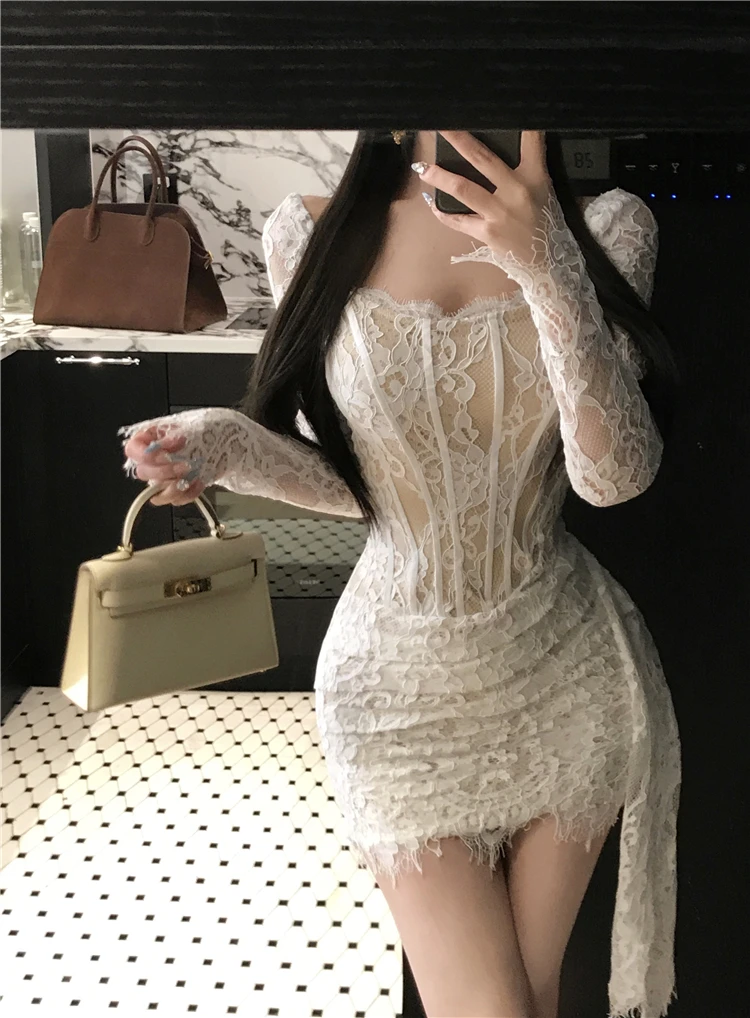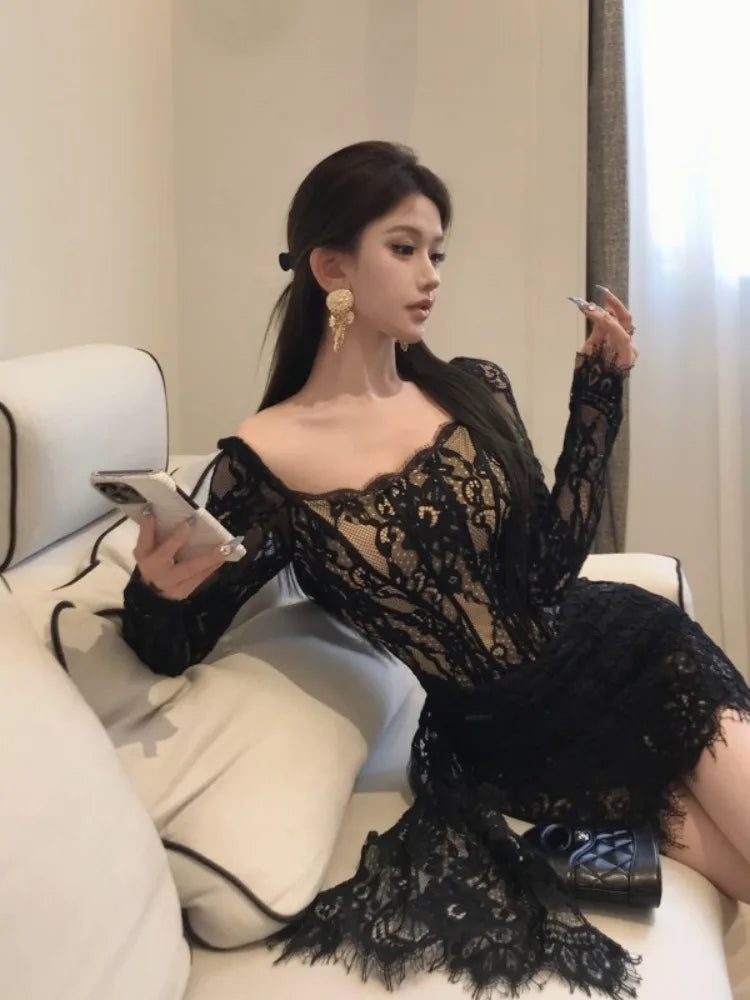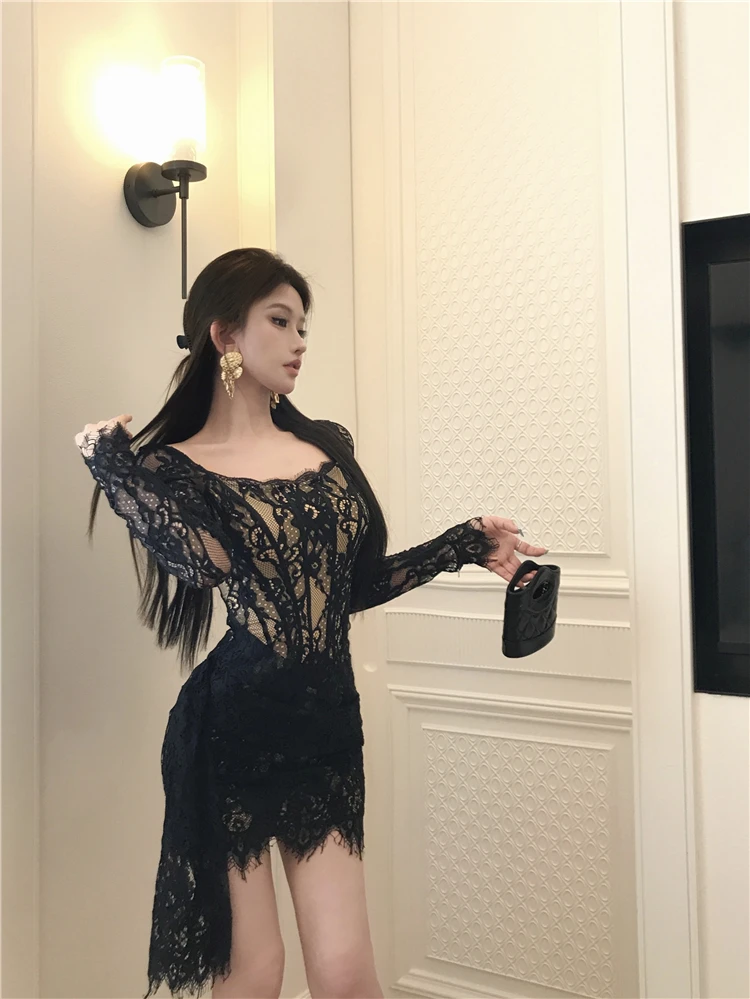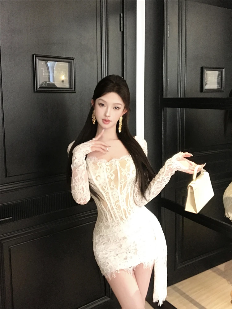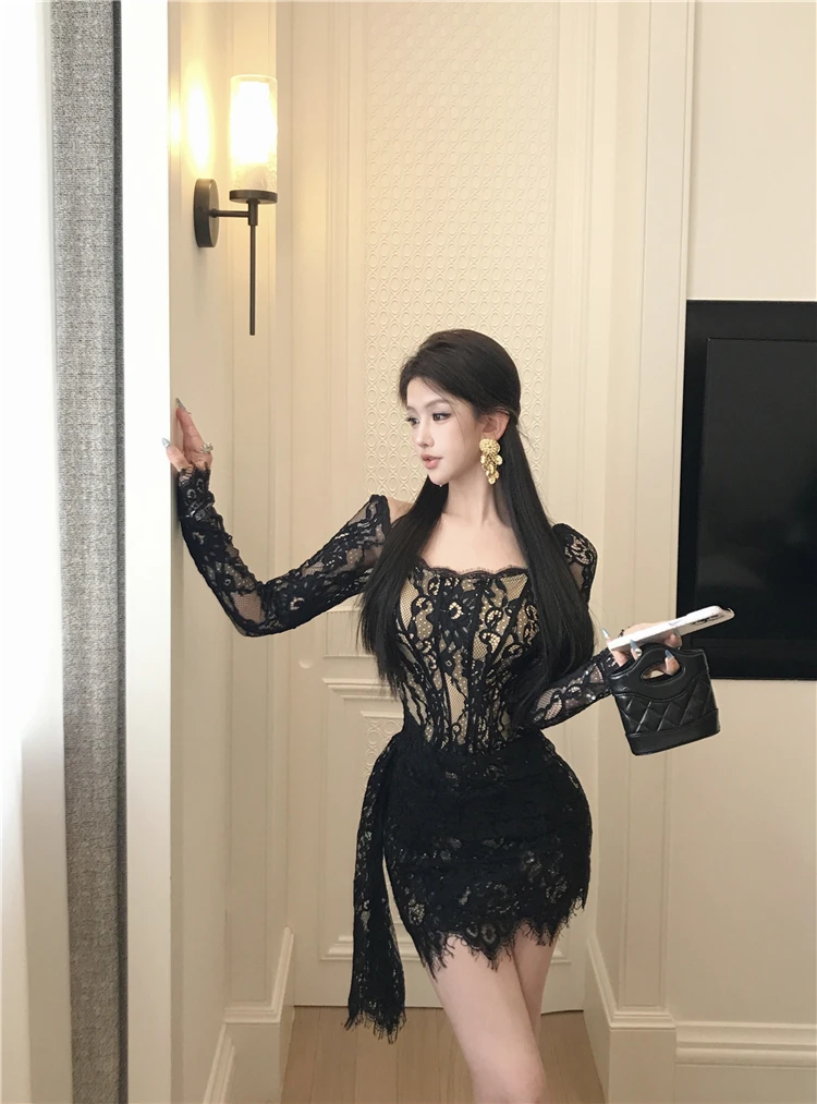 MQTIME  -  Red Lace Splice Long Sve Women's Dr Summer Tight Bodycon ort Skirt High Waist Commute Sle Faion Chinese Brand
