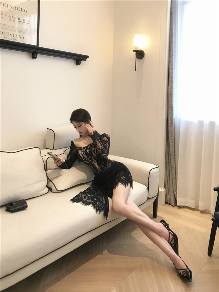 MQTIME - Red Lace Splice Long Sve Women's Dr Summer Tight Bodycon ort Skirt High Waist Commute Sle Faion Chinese Brand