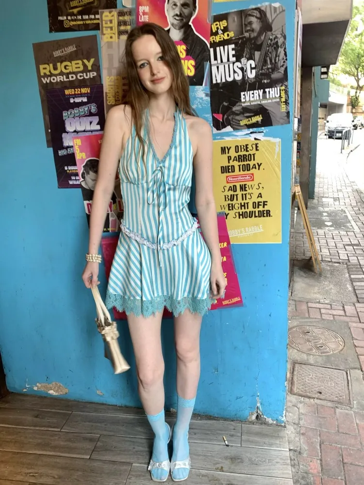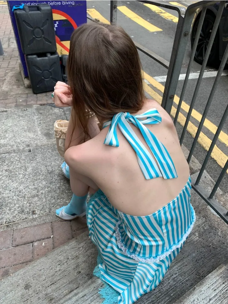 MQTIME - Retro Contrasting Green Striped Dress For Women's Summer New High-End Design With Lace Strap Hanging Neck And Backless Dress