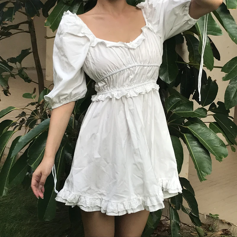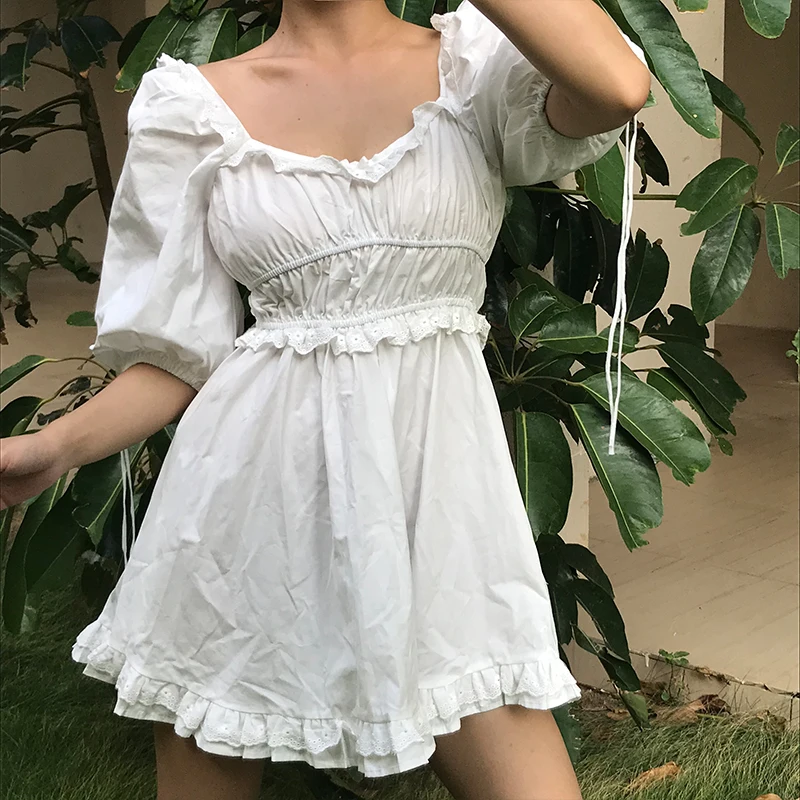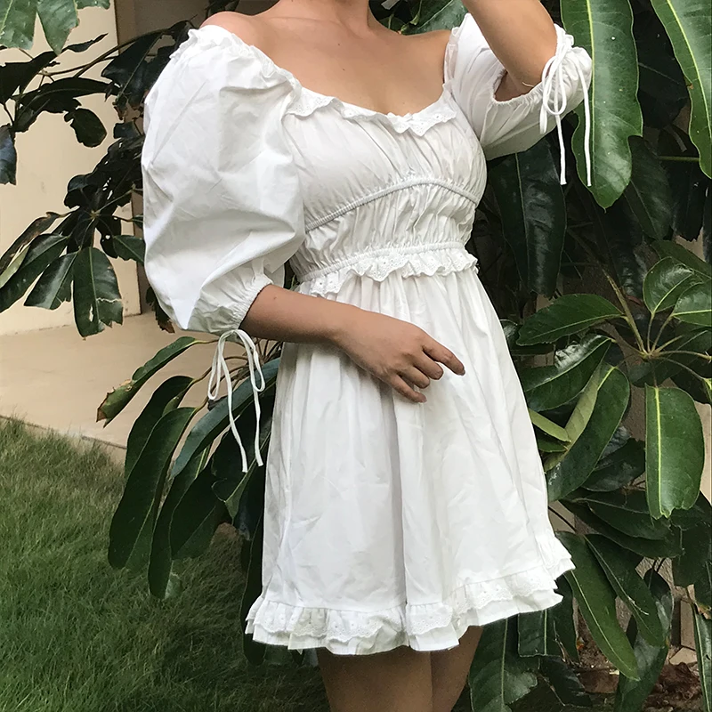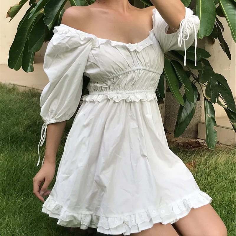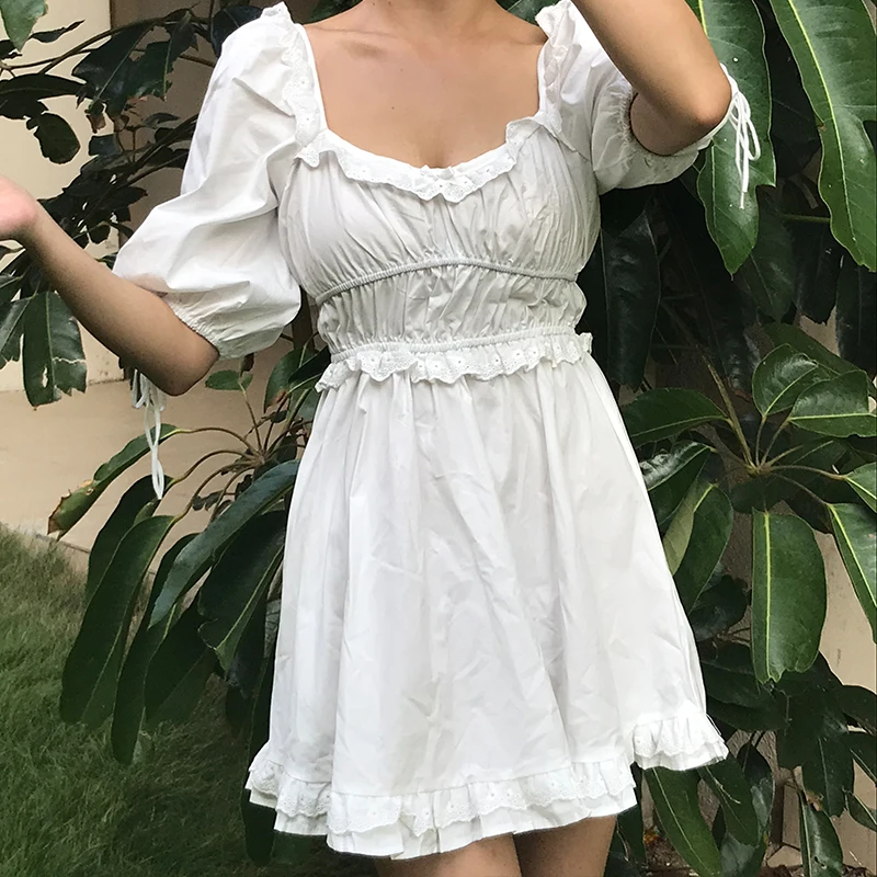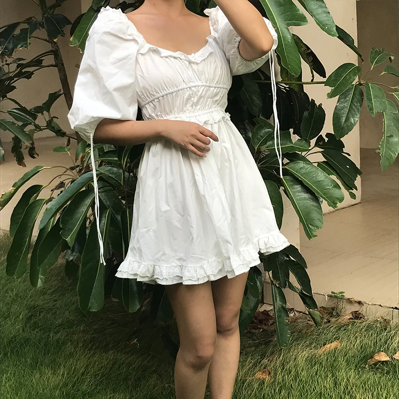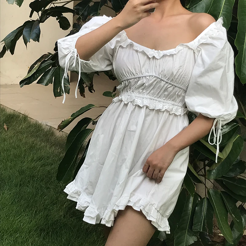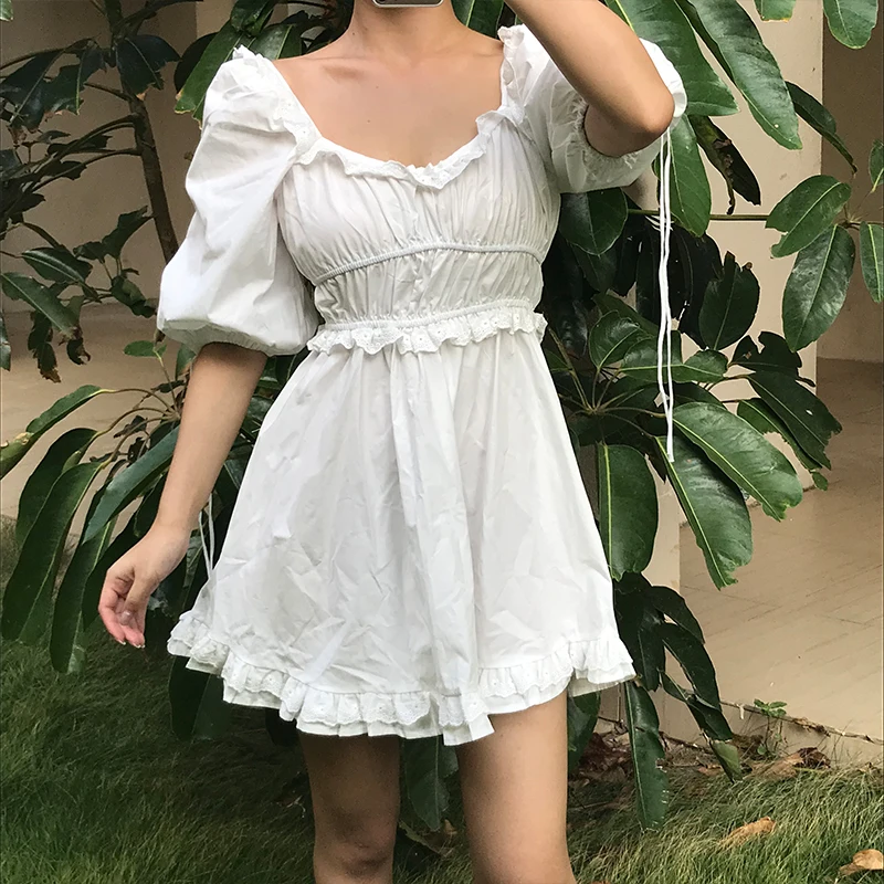 MQTIME - Retro French Lovely Princess Ear Lace Bubble Sleeve Waist Loose Dress