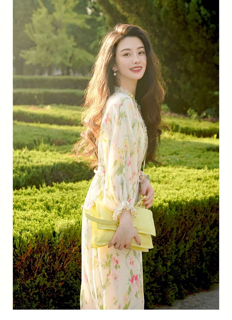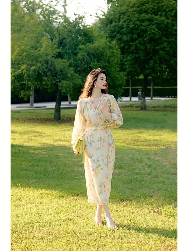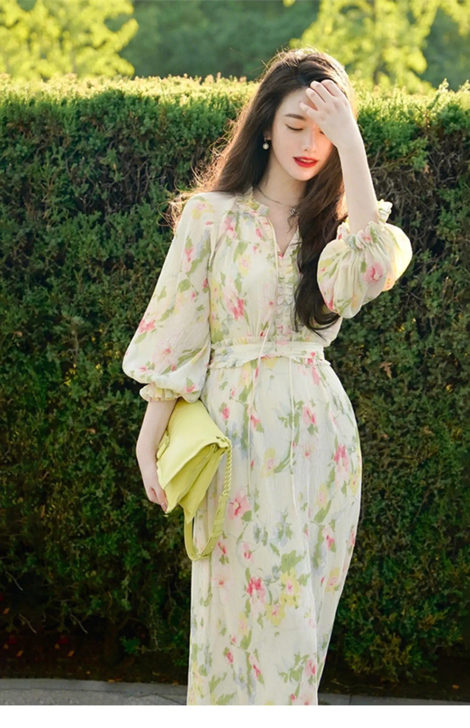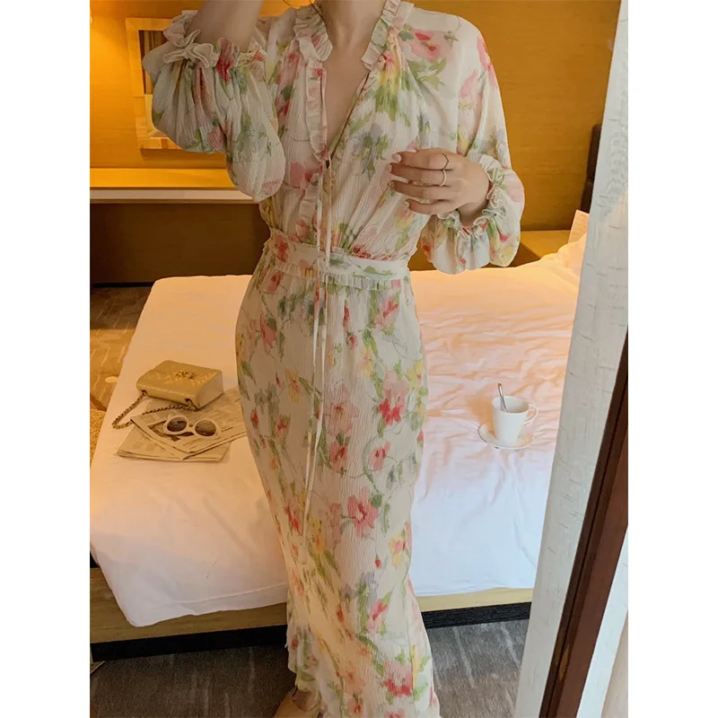 MQTIME  - Retro Loose Casual Dress Women Prarie Style V-Neck Tunic Waist Ruffled Long Dresses Summer Vintage Elegant Flower Dress Holiday
