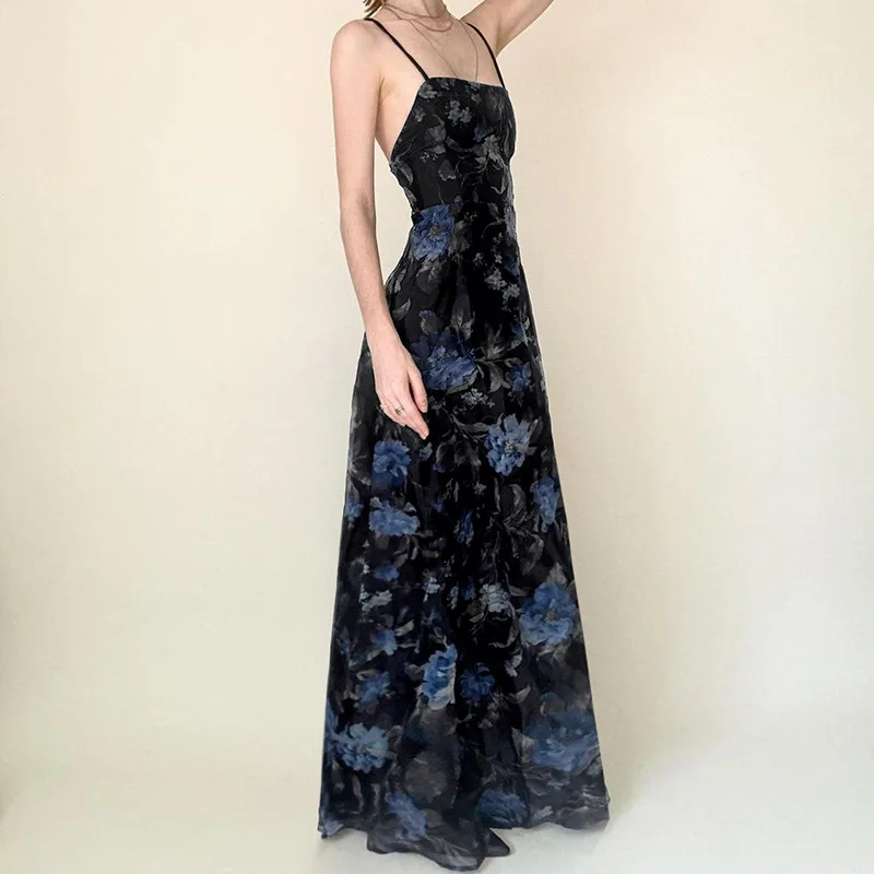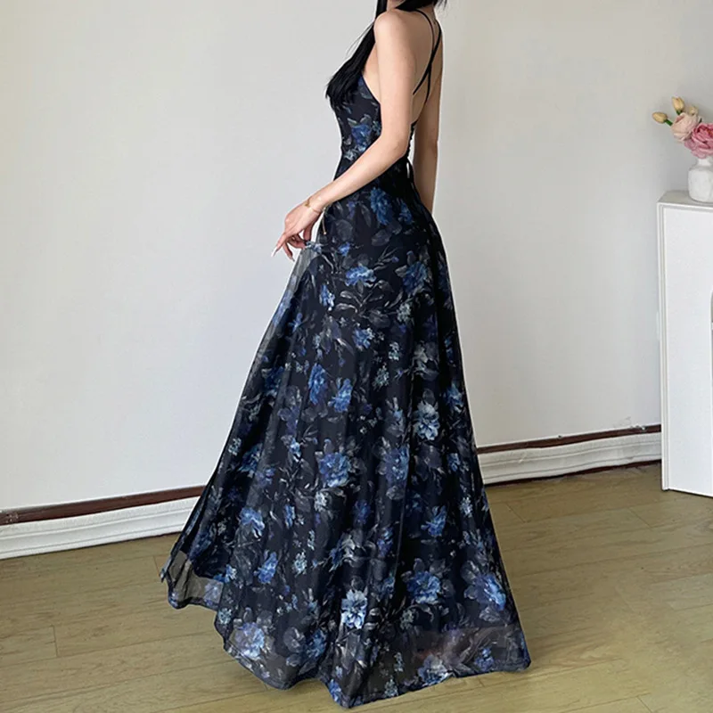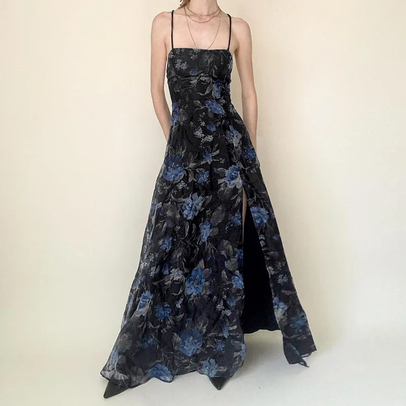 MQTIME - Retro printed cross backless mesh double-layer camisole skirt, sexy sexy slit waist long skirt for spicy girls