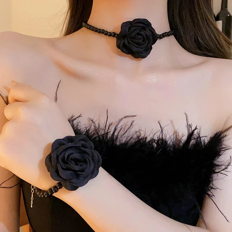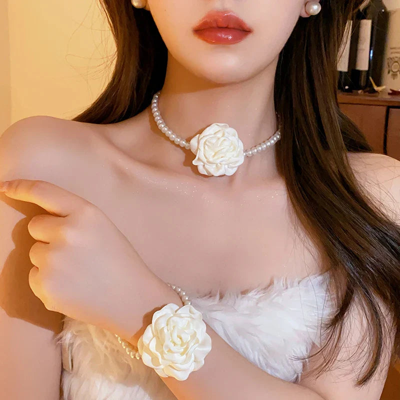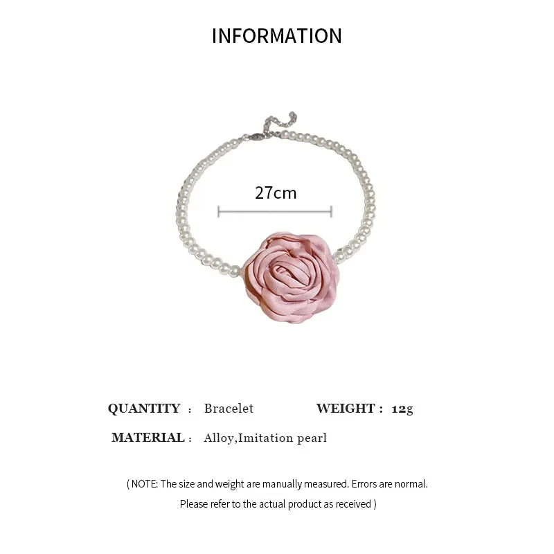 Mqtime Romantic Pink Rose Flower Necklace Bracelet Jewelry Set Elegant Imitation Pearl Chain Choker Necklaces Bangles For Party Wedding
