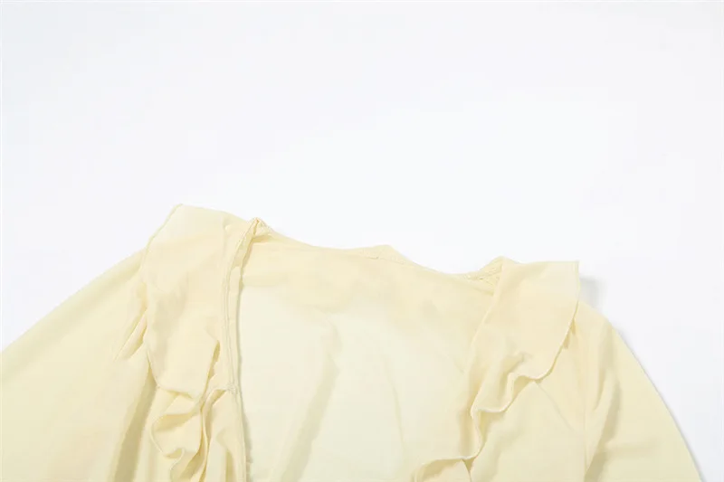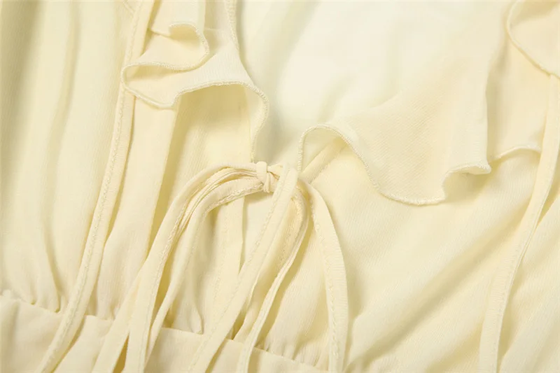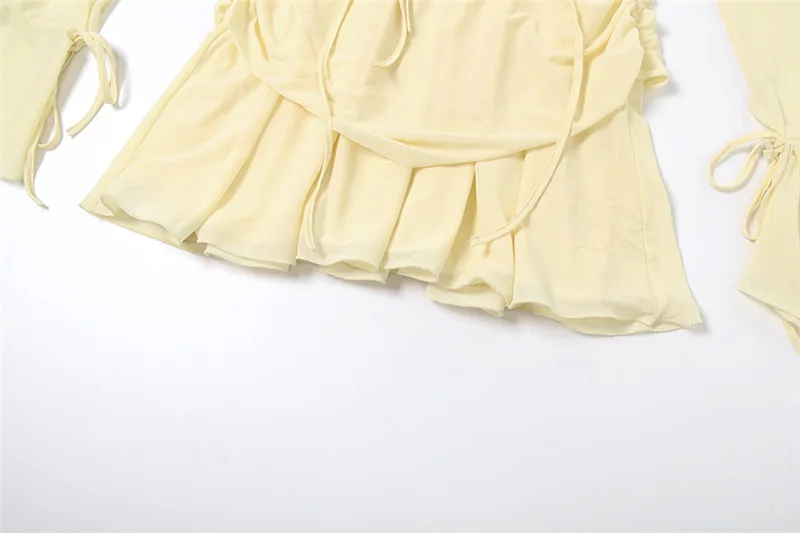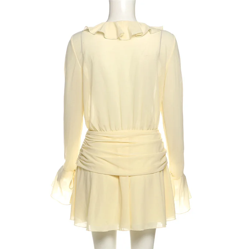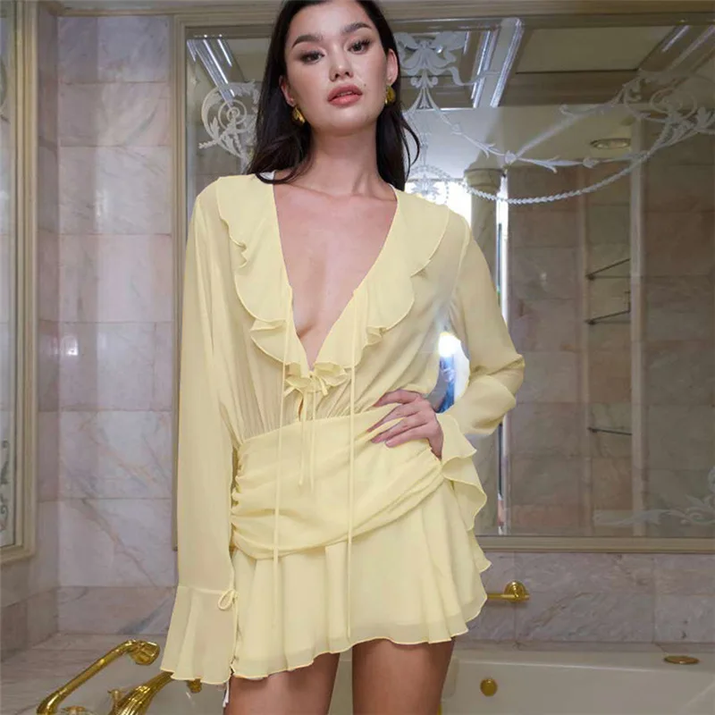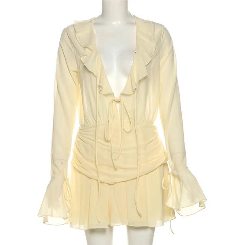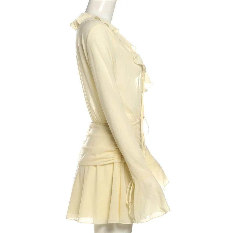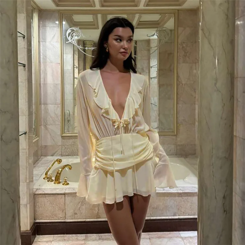 MQTIME - Ruffled V-Neck Lace-Up MIni Dress Women's Sexy Mesh See-Through Patchwork Bandage Autumn Dress Female Autumn Dress 2024