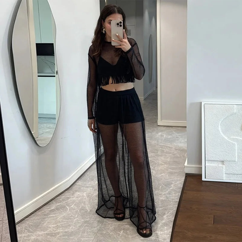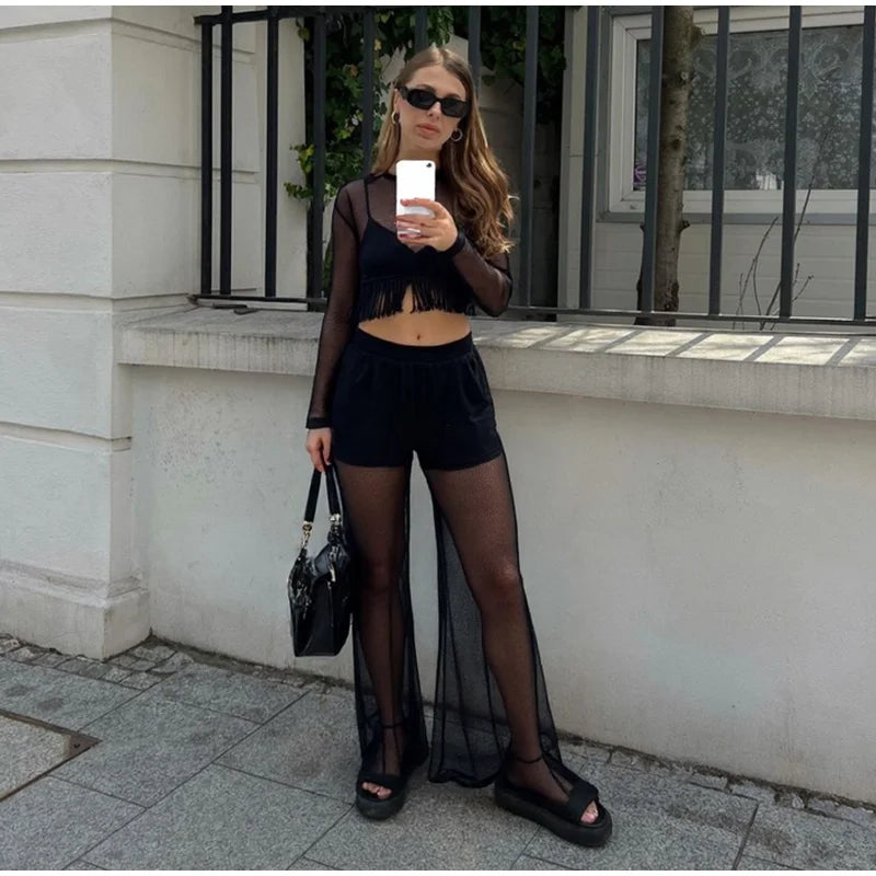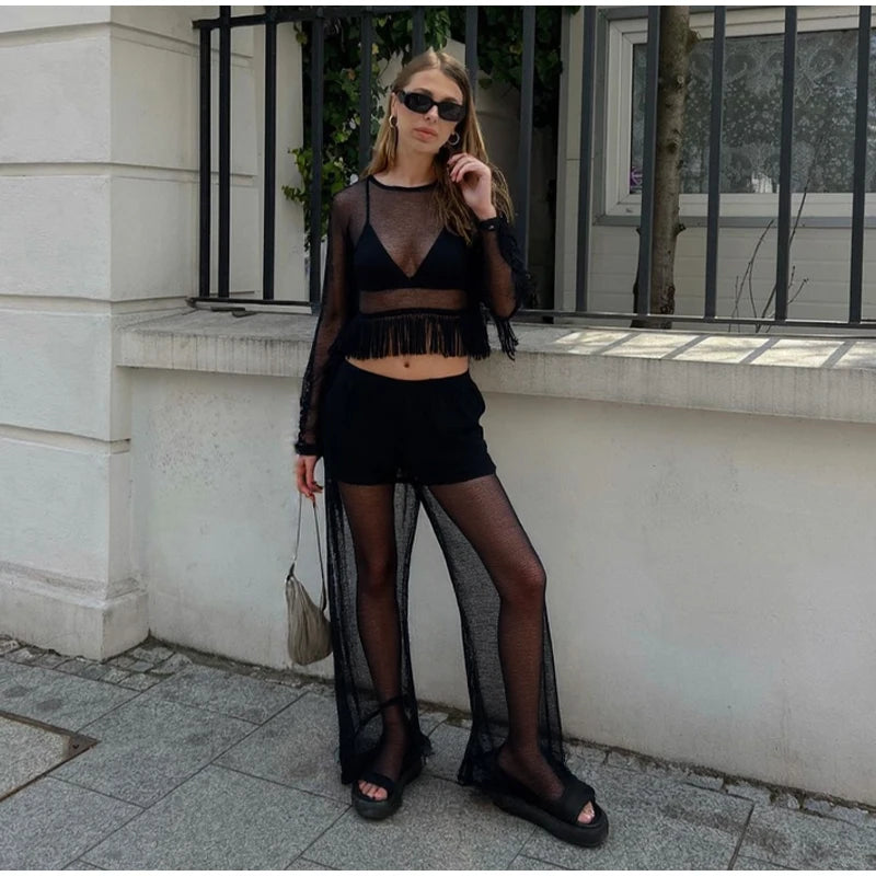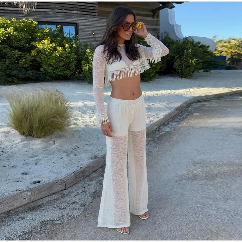 MQTIME - See Through Women's Pant Suit Two Piece Set Sexy Tassel Patchwork Full Sleeve Tank Top Wide Leg Pants Female Sets Beach Outfit