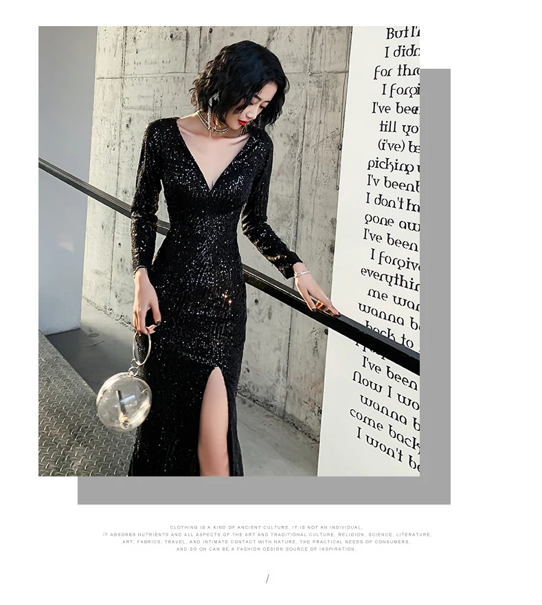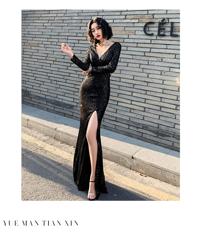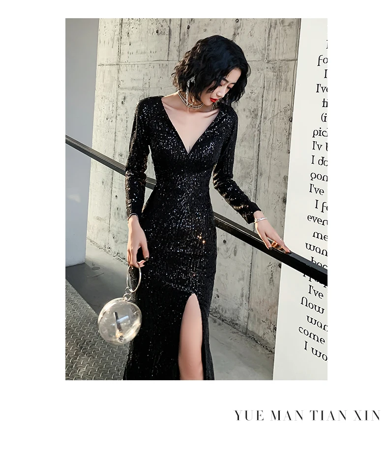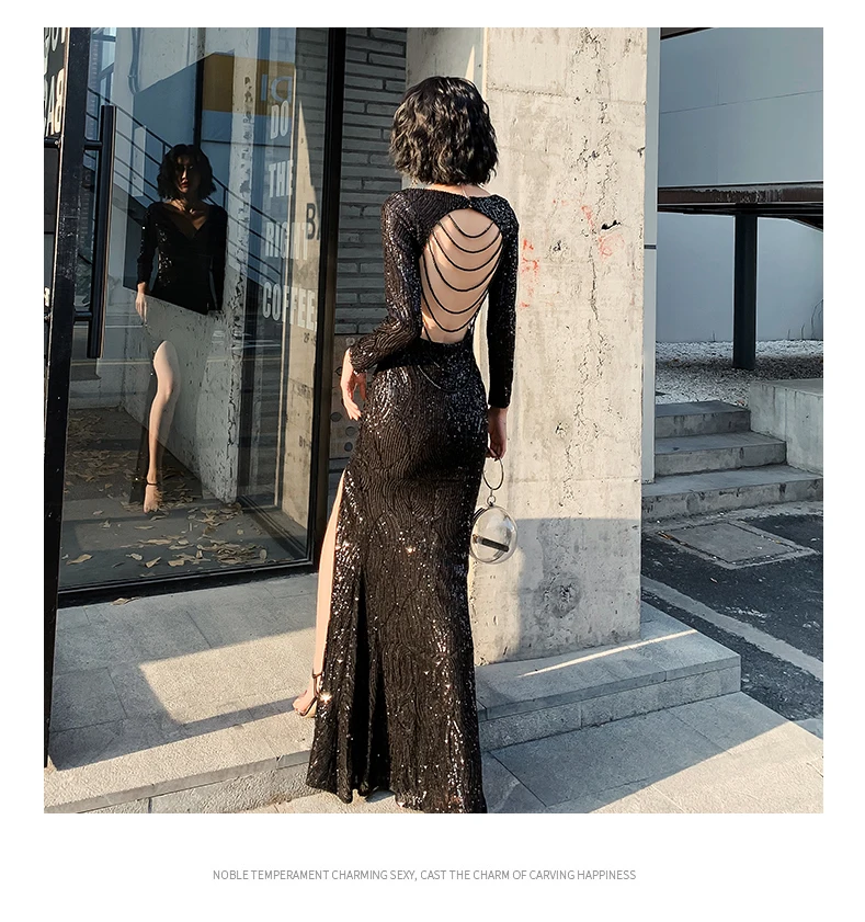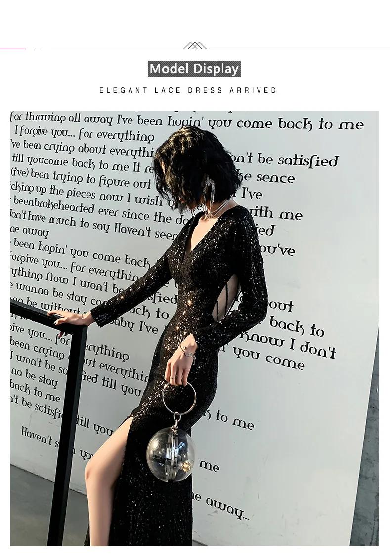 MQTIME - Sexy Black Mermaid Banquet Dress Deep V-Neck Beading Backless High Slit Floor Length Formal Evening Dresses Maxi Vestido