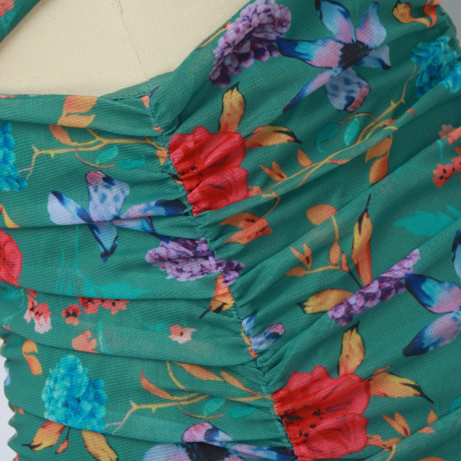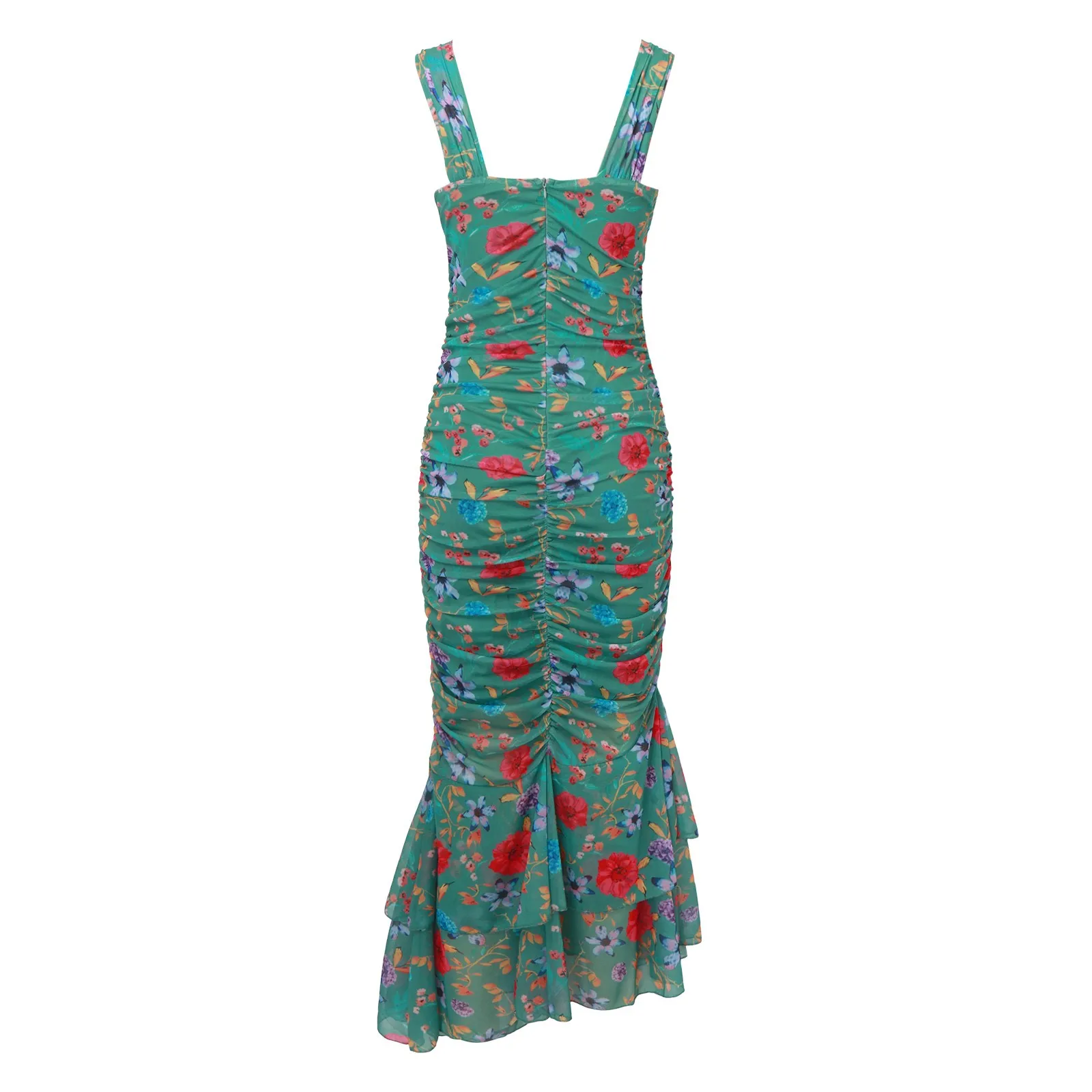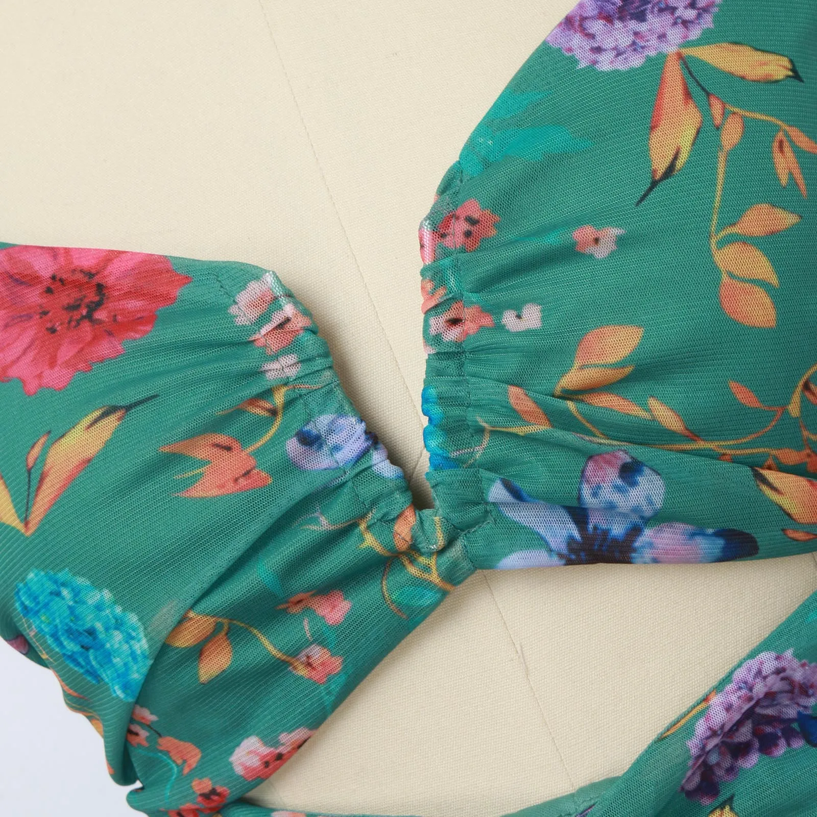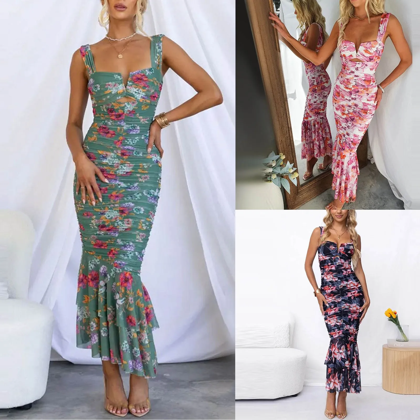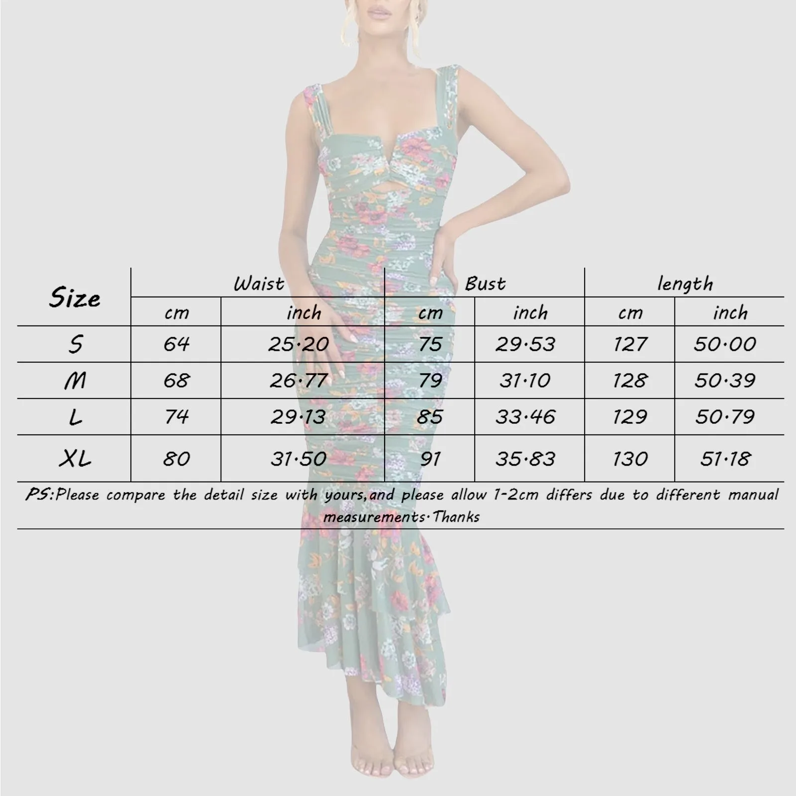 MQTIME - Sexy Deep V Ruffled Slim Hem Long Dress Summer Sweet Fashion Floral Print Long Sleeved Dress New Elegant Irregular Party Dress