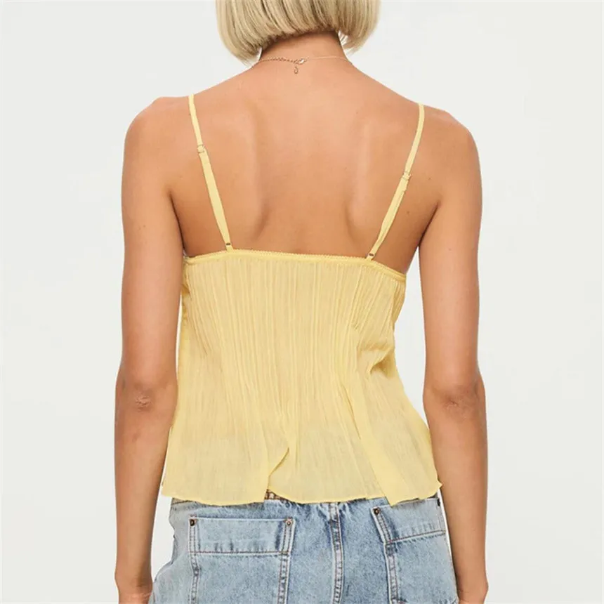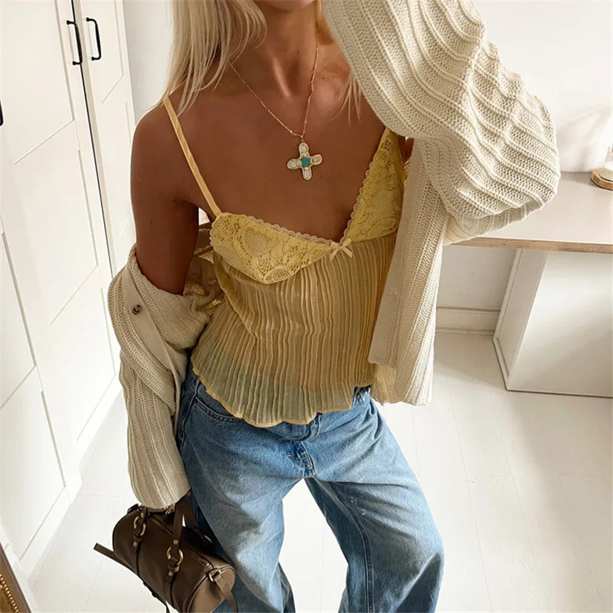 MQTIME - Sexy Flowy Crinkle Texture Camisole Top Lace Trim Y2K Adjustable Spaghetti Strap Bow Front Babydoll Tank Top Ladies Crop Vest