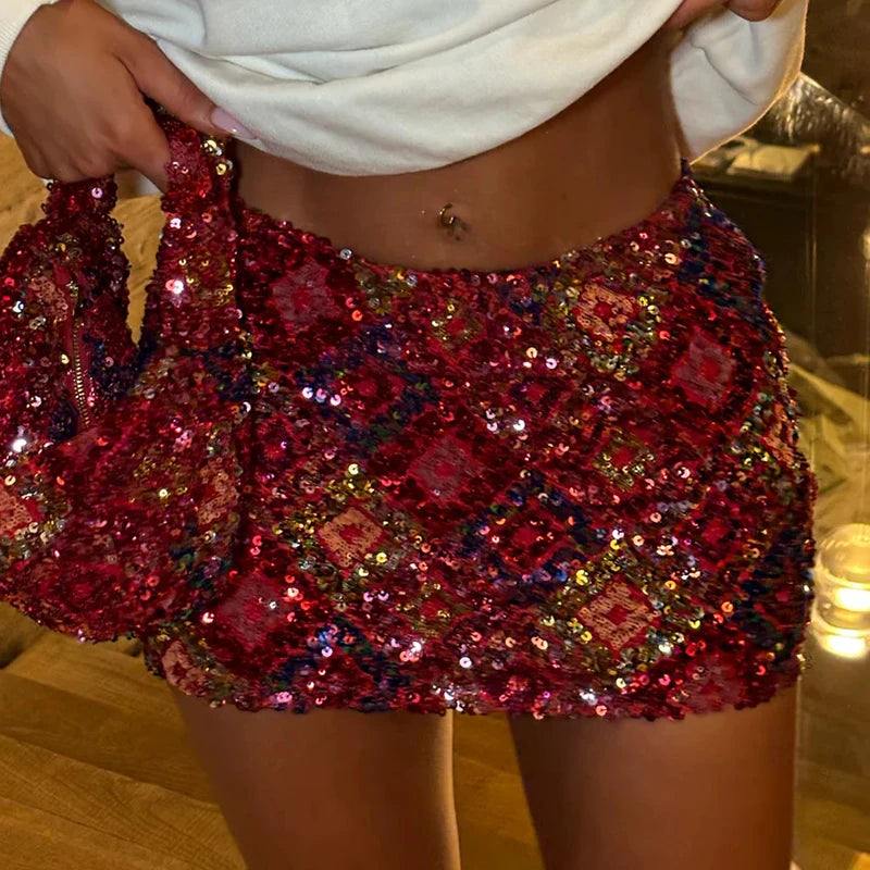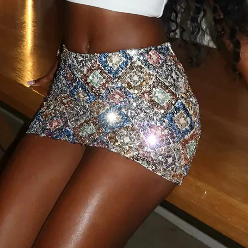 MQTIME - Sexy Geometric Print Glitters Mini Skirts Midnight Party Multi-color Skirts Women 2025 Summer New Sequins Wrap Hips Short Skirts
