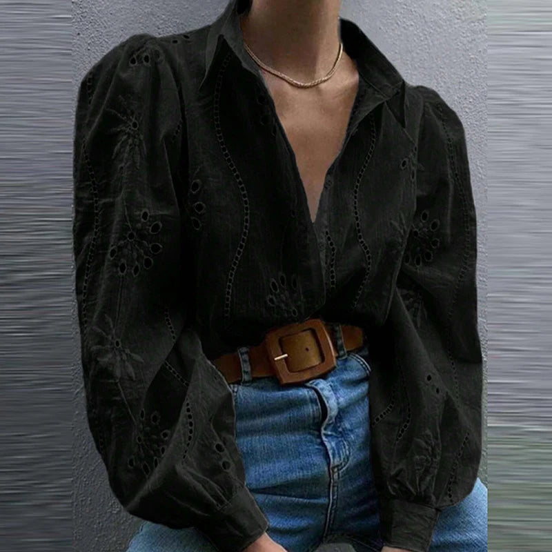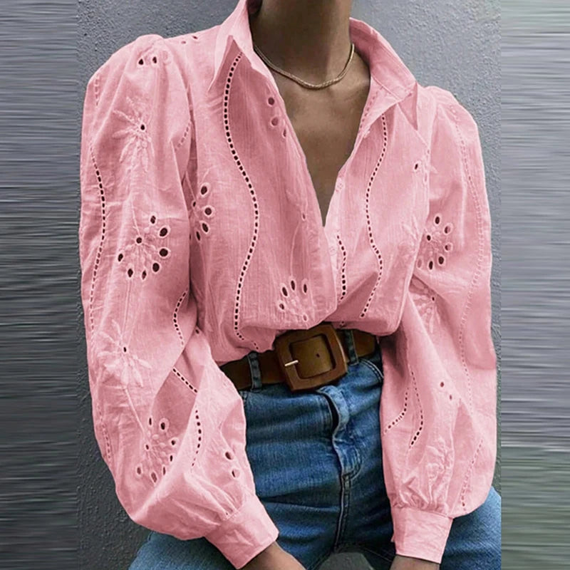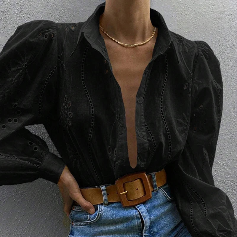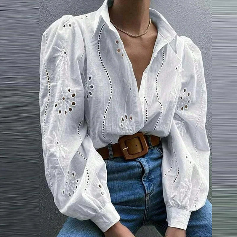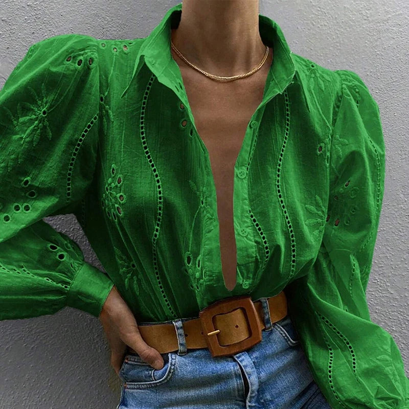MQTIME - Sexy Hollow Loose T Shirt New Women Turn-down Collar Single Breasted Office Shirt Elegant Embroidery Solid Color Long Sleeve Top