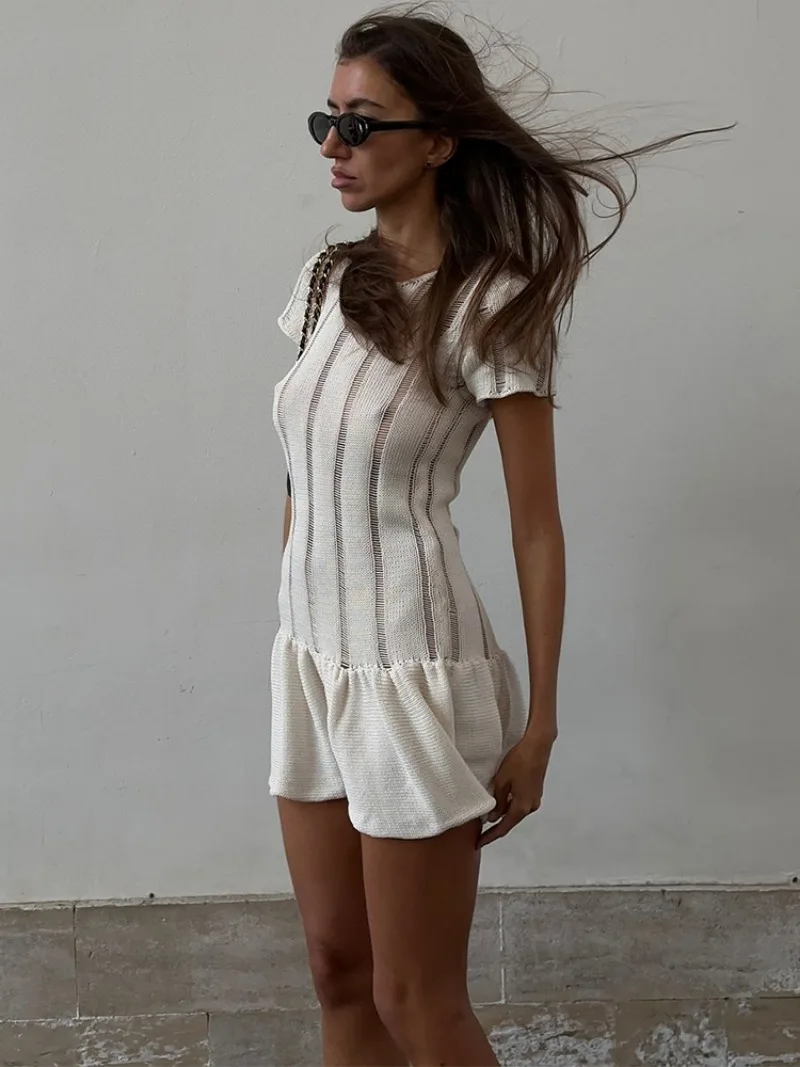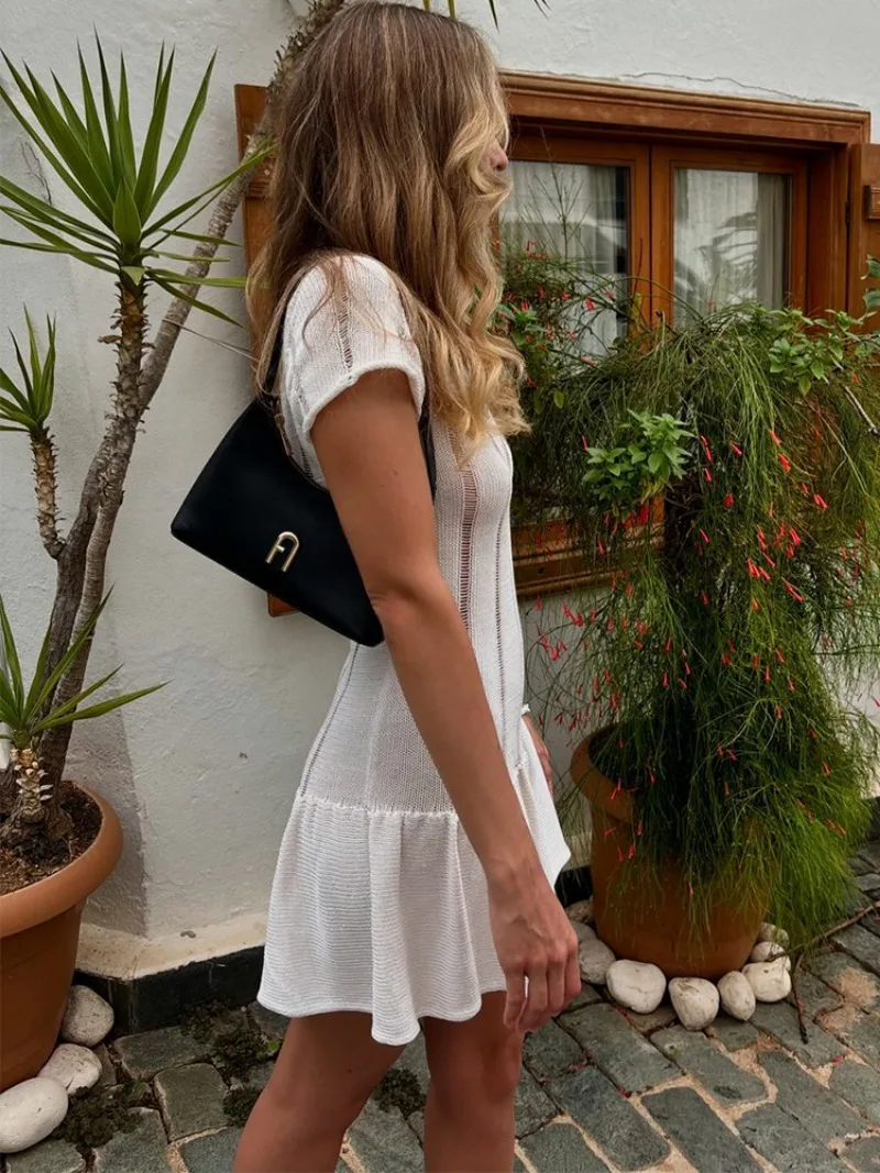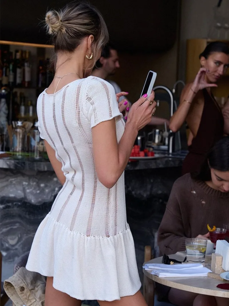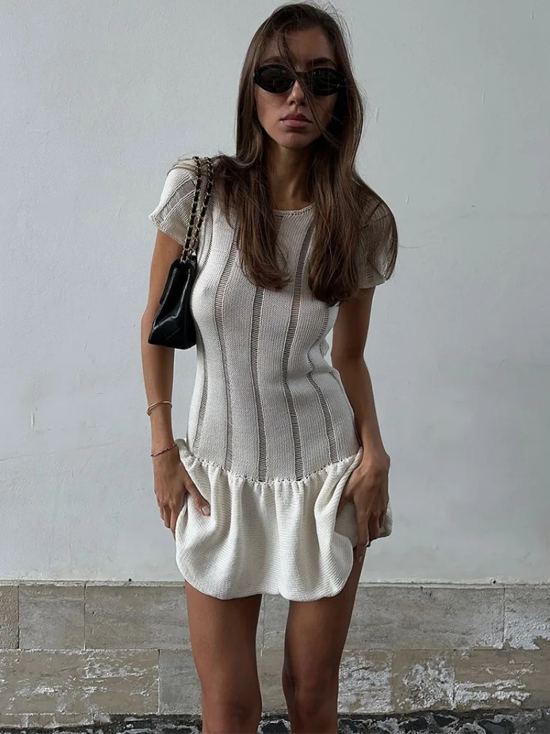 MQTIME - Sexy Hollow Out Dress For Women Summer Slim Short Sleeve Patchwork Ruffle Dresses Women's Vacation Casual Party Dress