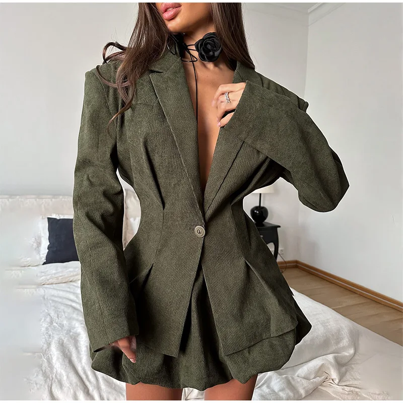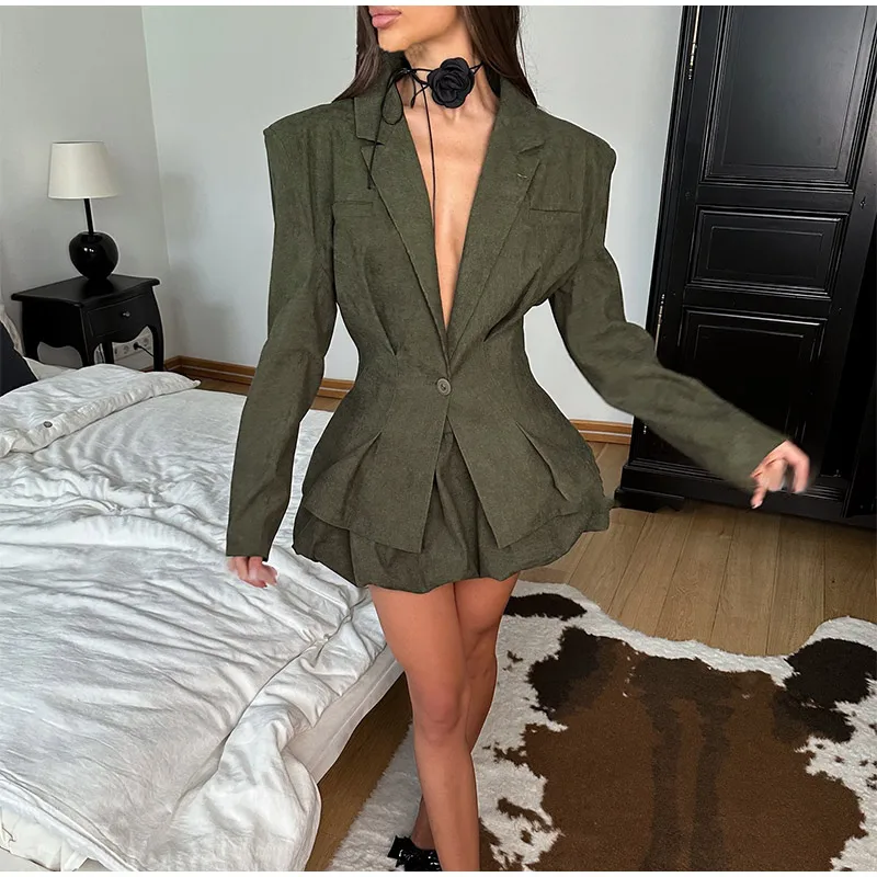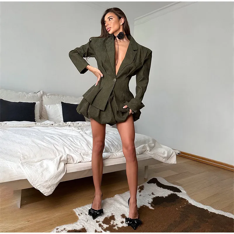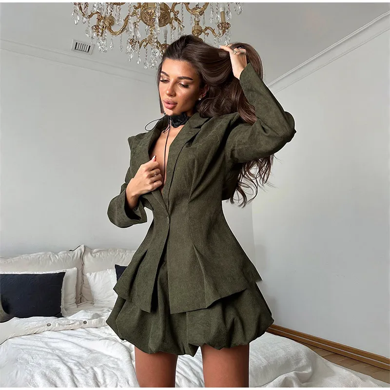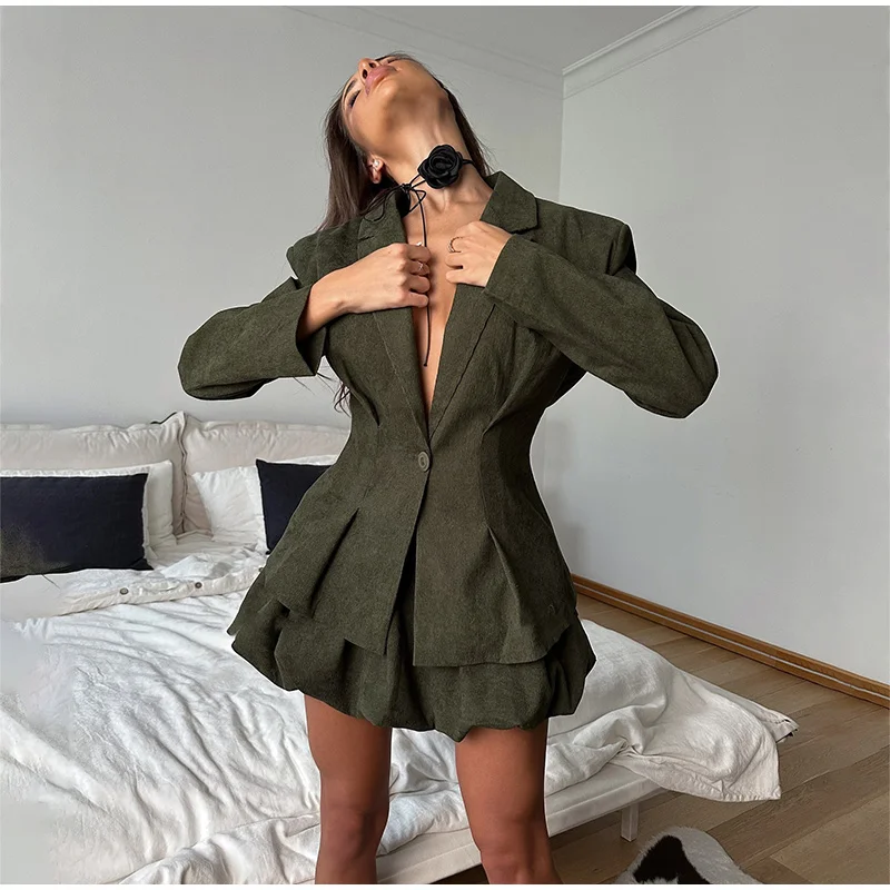 MQTIME - Sexy Lapel Jackets Bubble Skirt Woman's Set Retro Deep V-neck Single Button Suit Jacket Mini Skirts Sets Female Chic Outfits