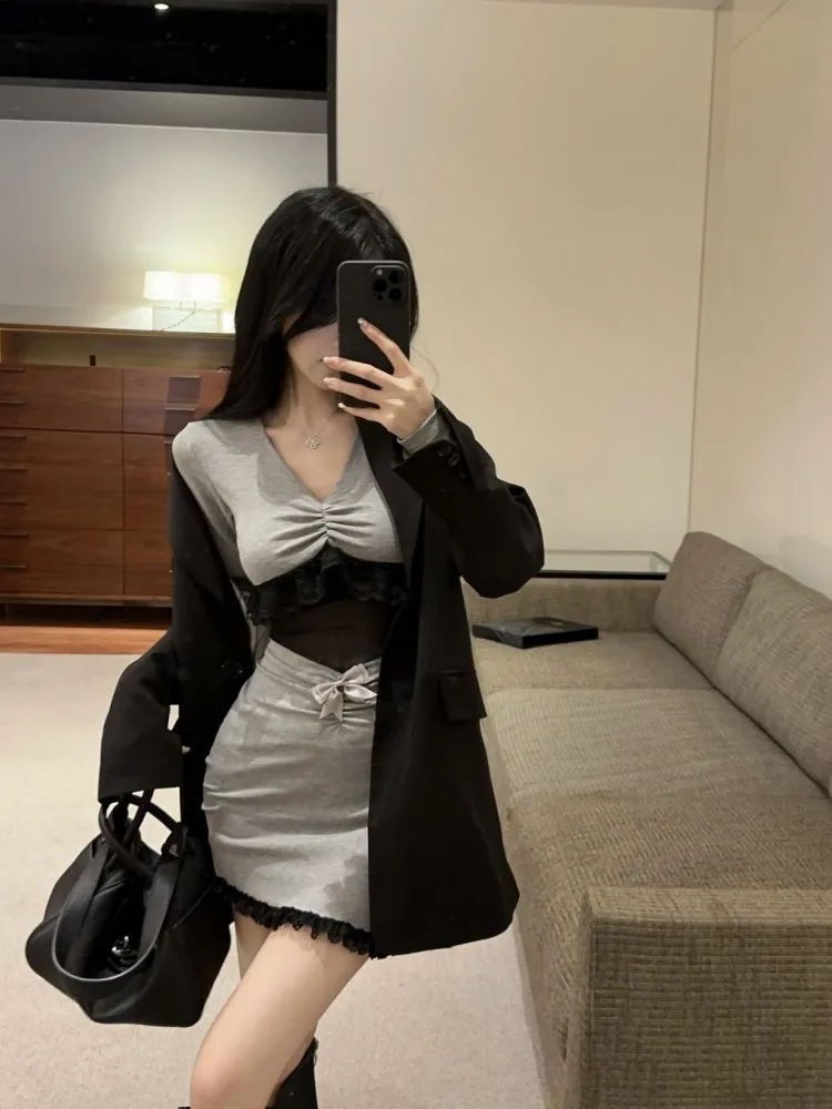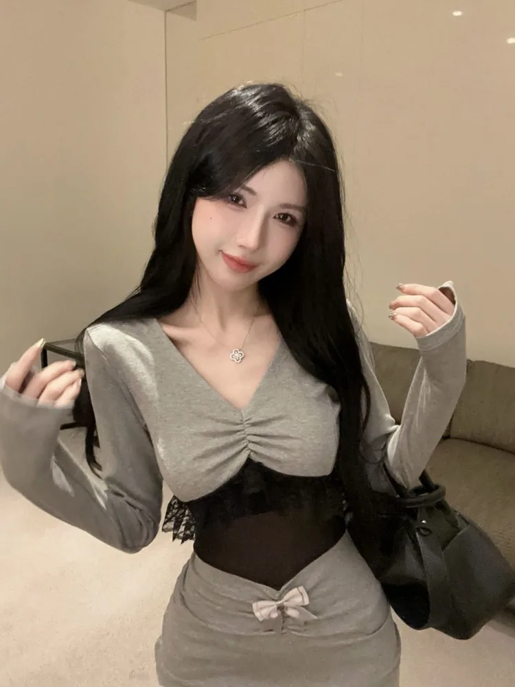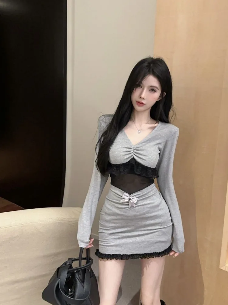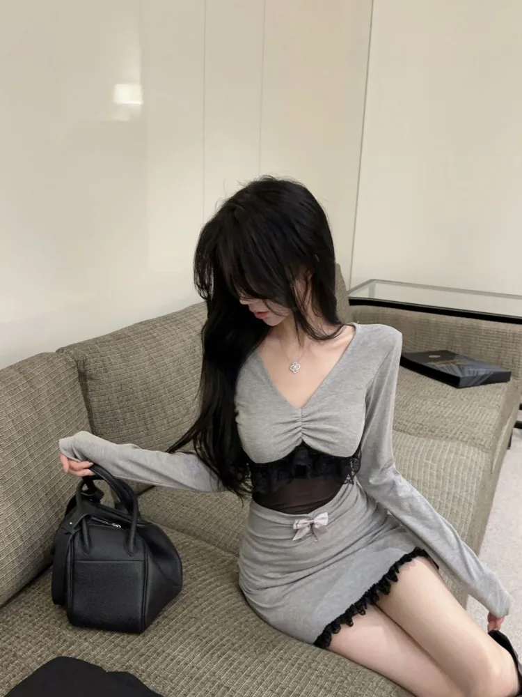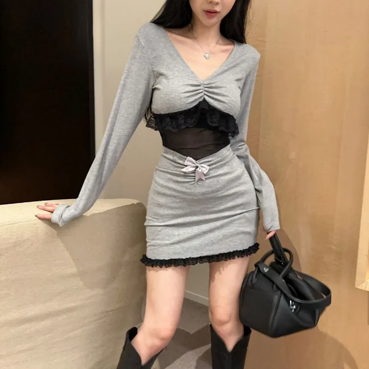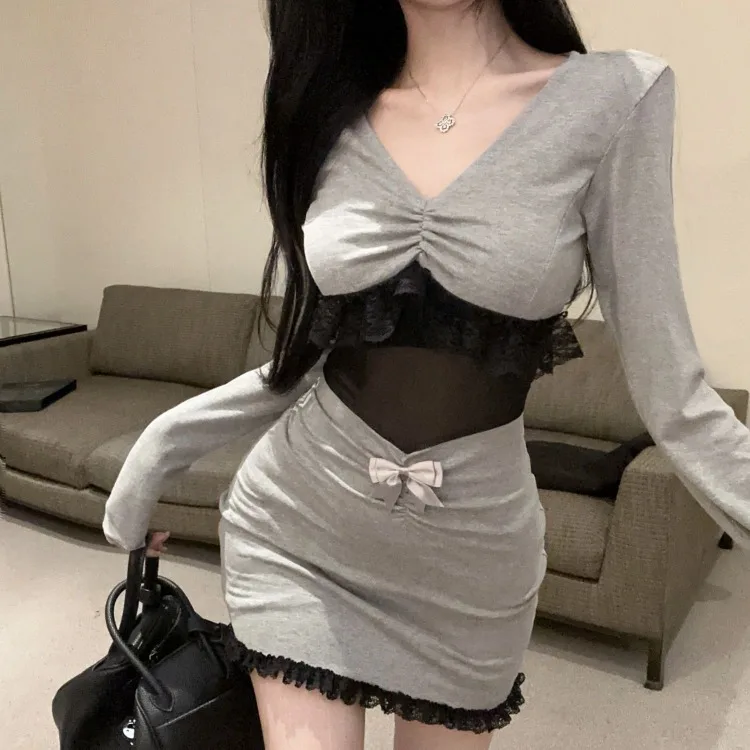 MQTIME  -  Sexy Low Chest V-Neck Lace Long Sleeve Dress Pure Lust Spice Girl Skinny Hollow Pleated Tights Hip Wrap Dress