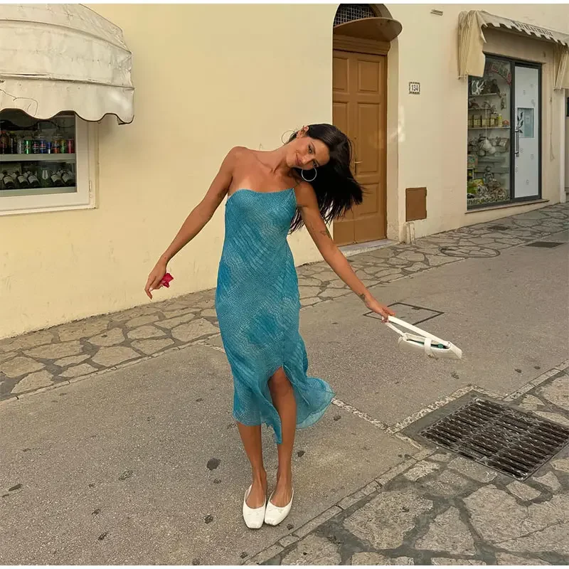 MQTIME  -  Sexy Printed Mesh Sleeveless Sling Women Dress Sexy Oblique Collar Backless Slim Fit Dresses 2024 Female Beach Vacation Vestidos