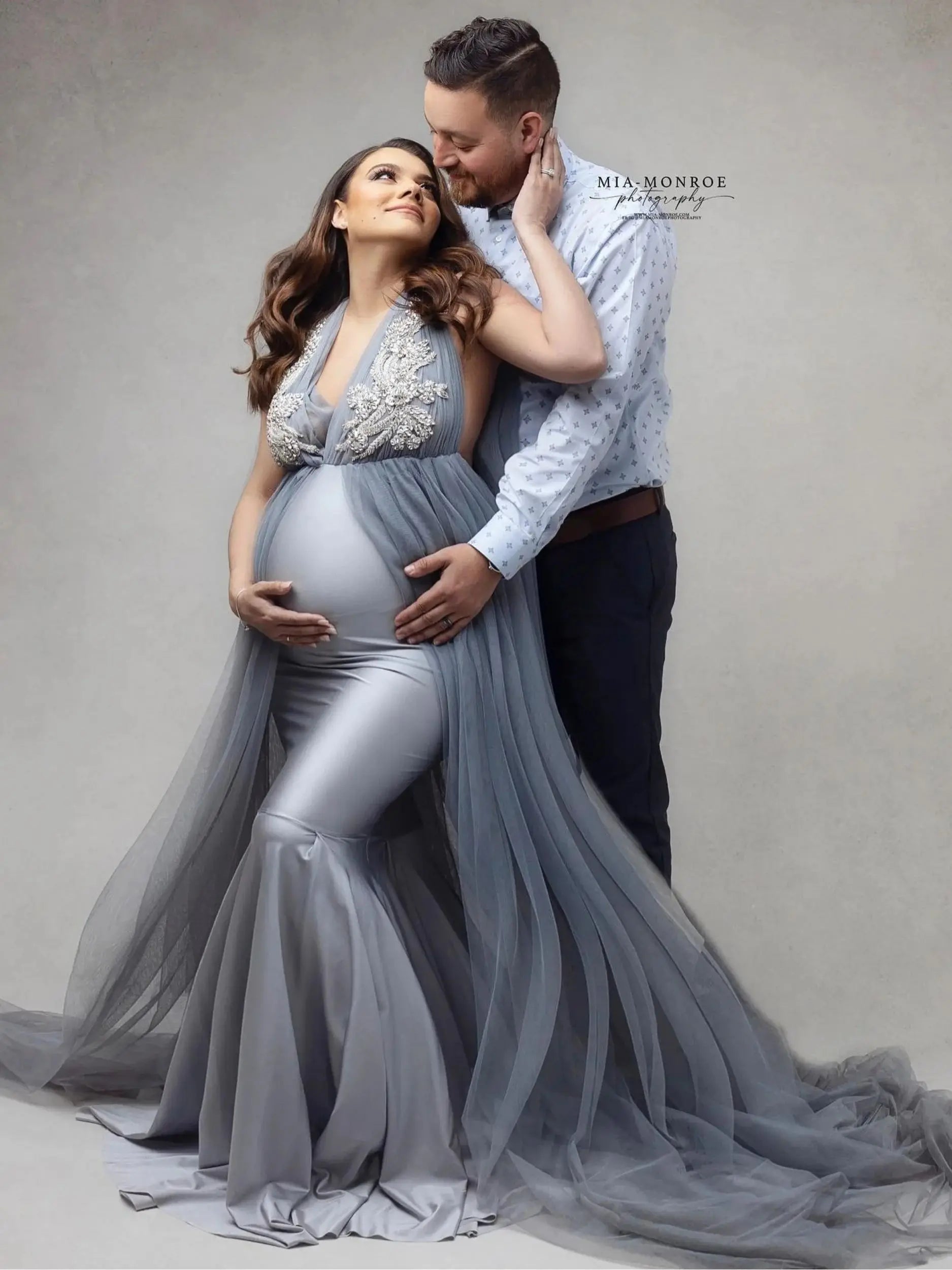 MQTIME - Sexy Silver Maternity Dresses for Photography Halter Mermaid Pregnancy Photshoot Customized Lace Appliques Babyshower Gowns