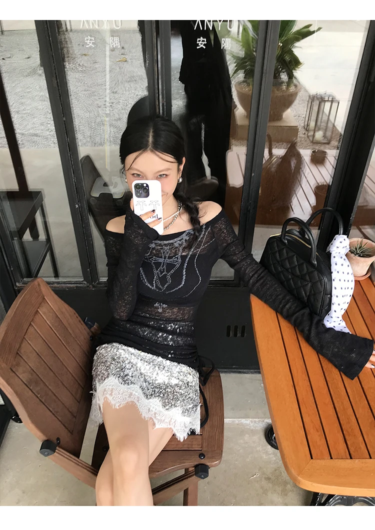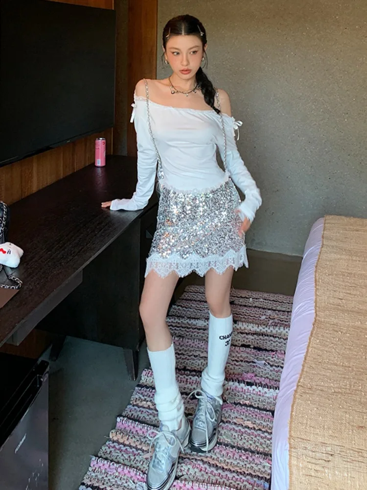 MQTIME - Sexy Silvery Sequin Mini Skirt Lace Patchwork Tight Hip Wrap Skirt for Women Summer Fashion Lady Party Club A-line Skirt