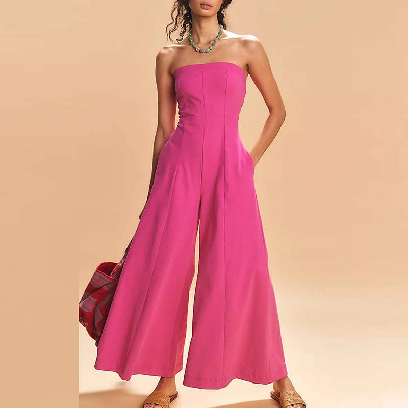 MQTIME - Sexy Tube Top High Waist Pocket Jumpsuits Elegant Lady Summer Sleeveless Playsuits Overalls High Street Commute Wide Leg Rompers