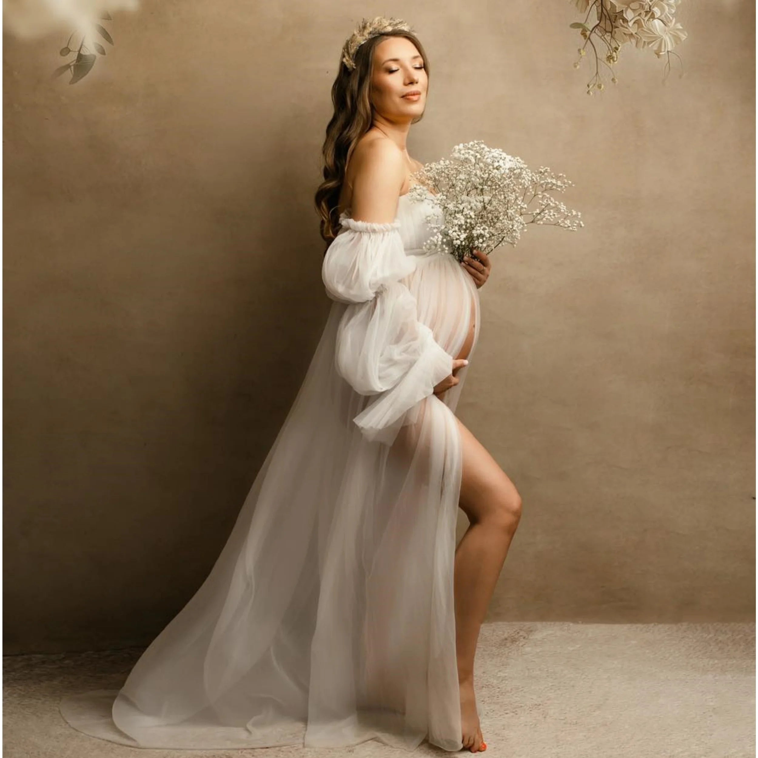 MQTIME - Sexy White Maternity Dress for Photoshoot  Sweetheart Sheer Tulle Prom Gown Customized Slit  Babyshower Gowns Pregnancy Wear