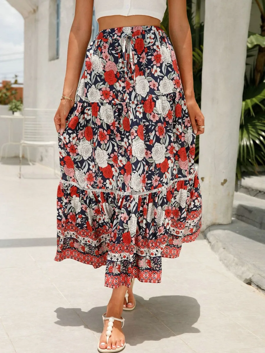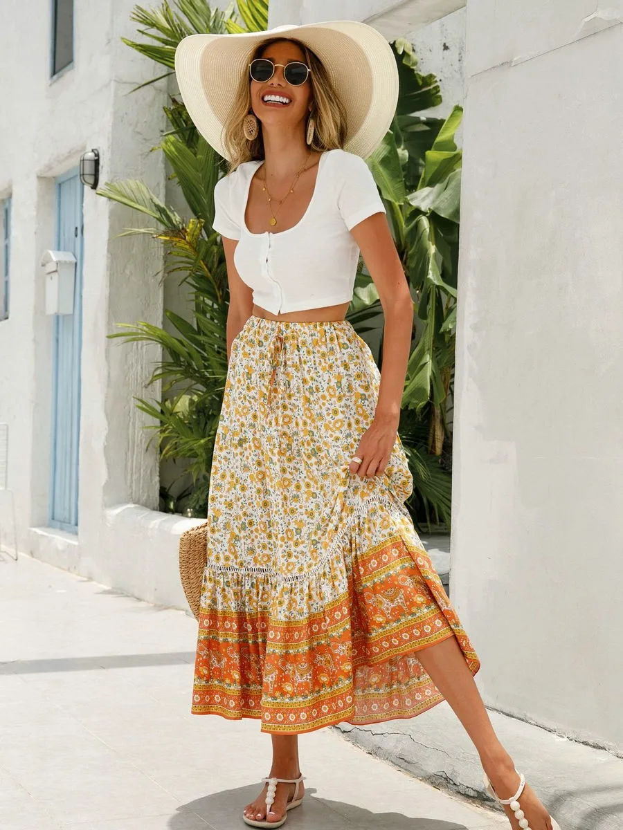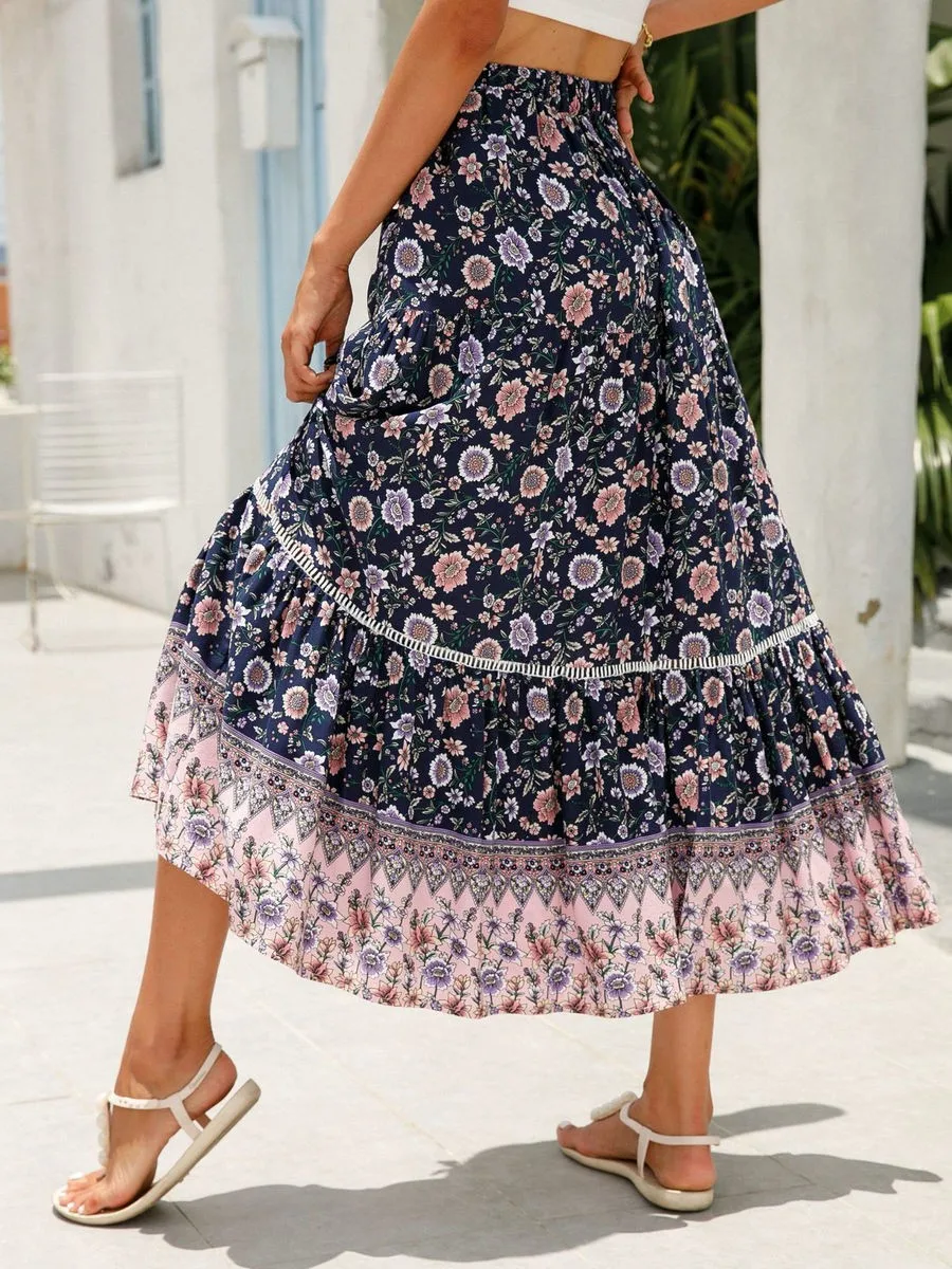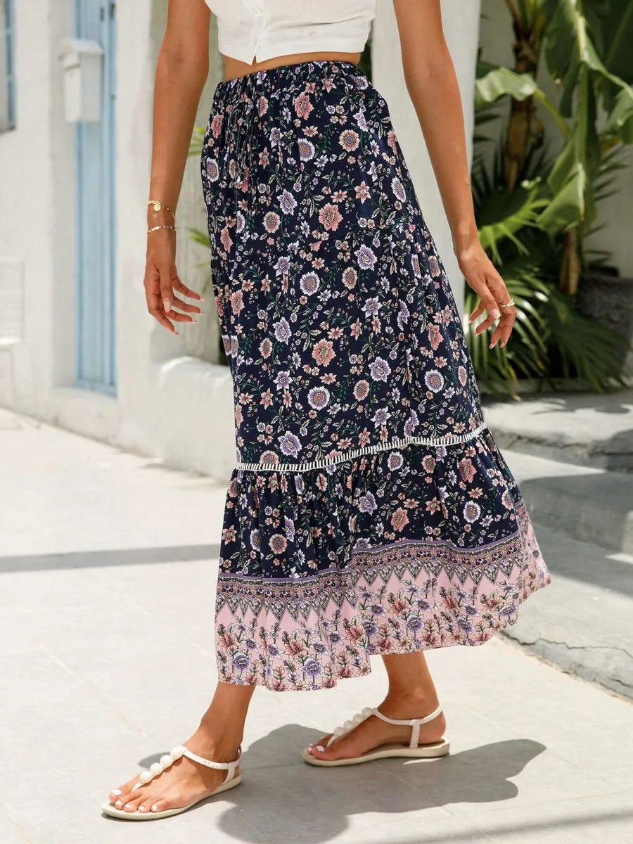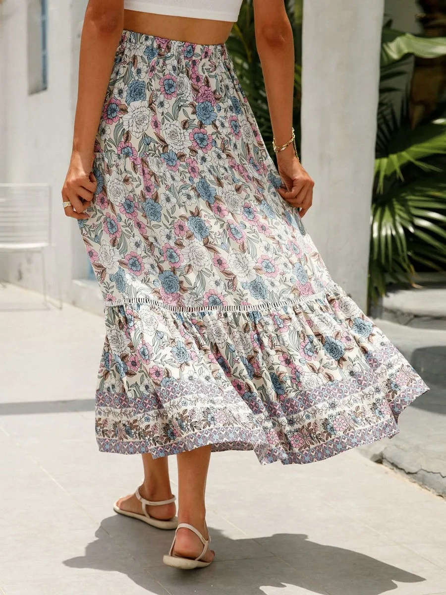 Mqtime Skirts For Women Trendy Summer Skirt Floral Printed Lace Stitching Long Skirt Viscose Bohemian Beach Holiday Skirt A-line