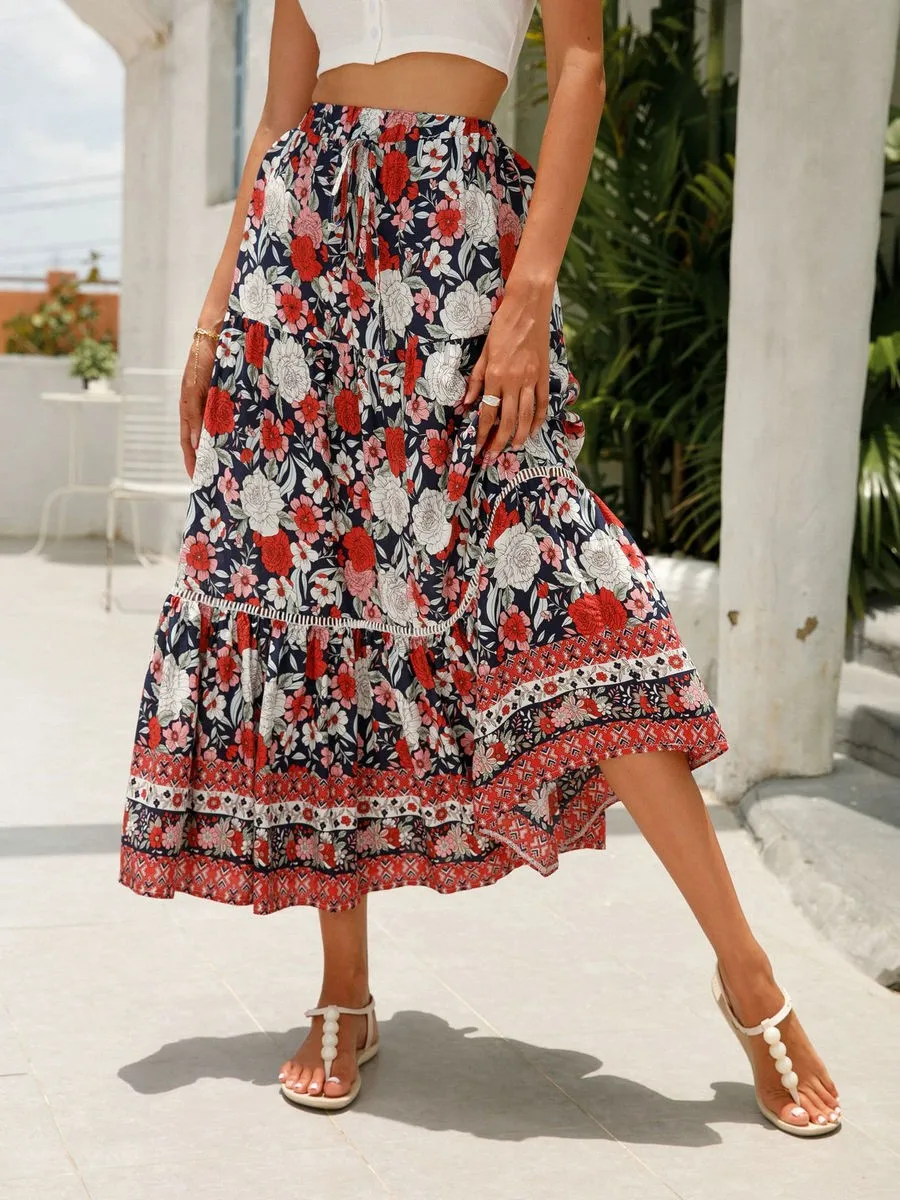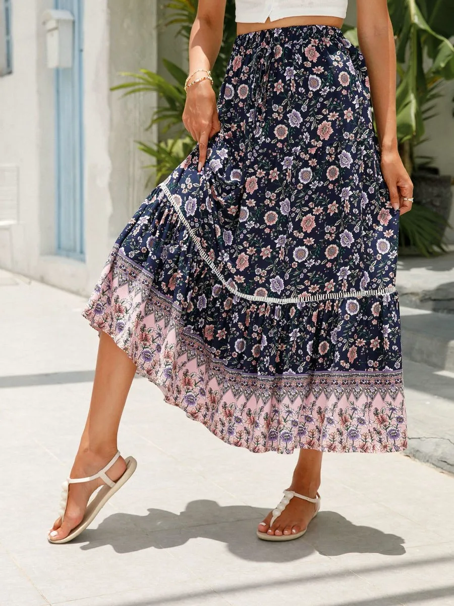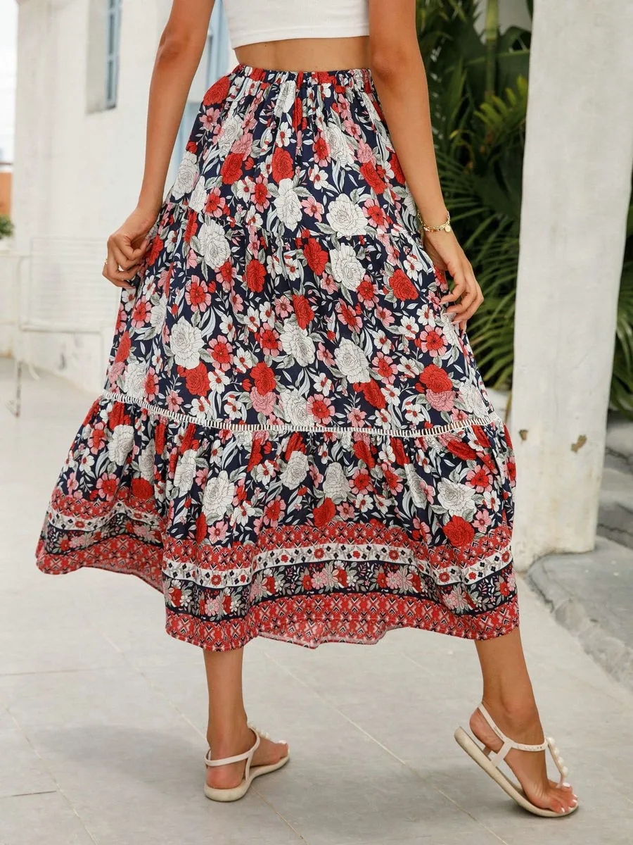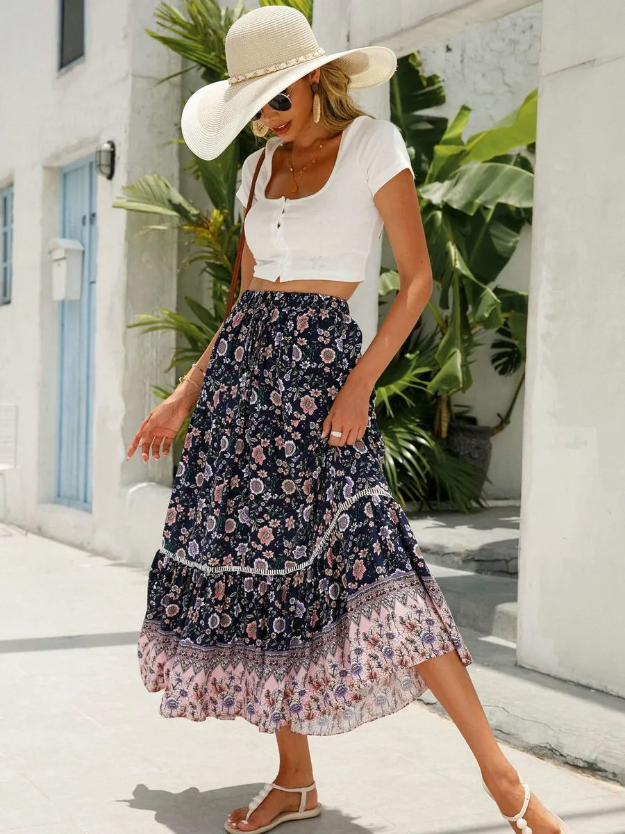 Mqtime Skirts For Women Trendy Summer Skirt Floral Printed Lace Stitching Long Skirt Viscose Bohemian Beach Holiday Skirt A-line