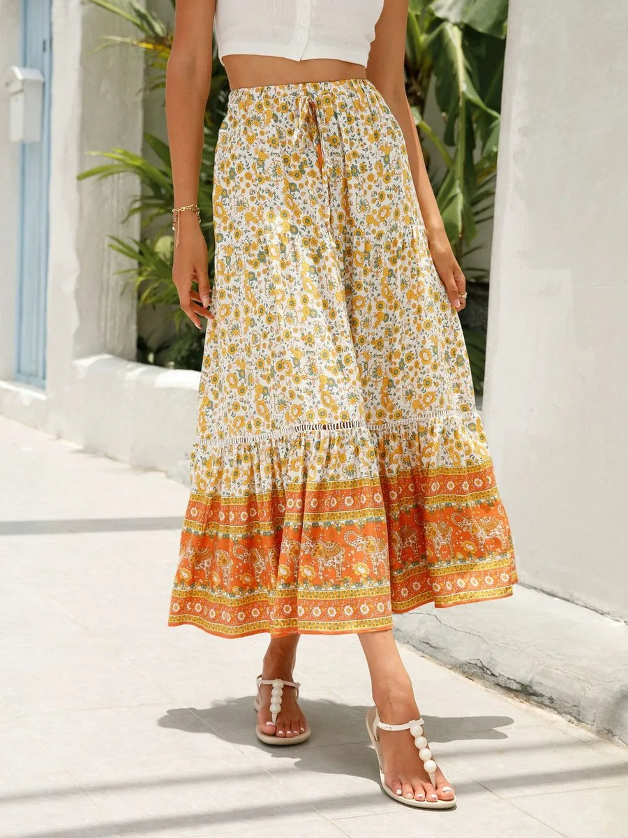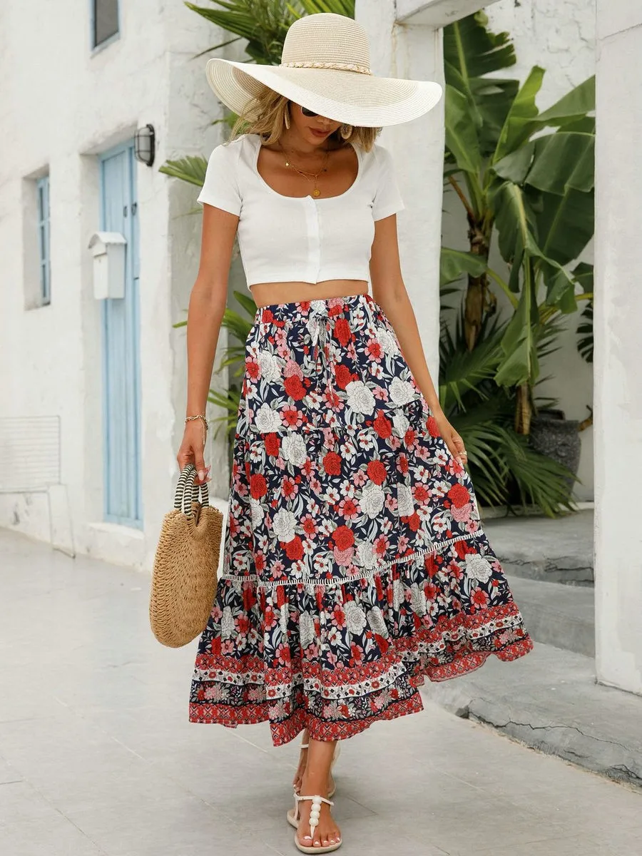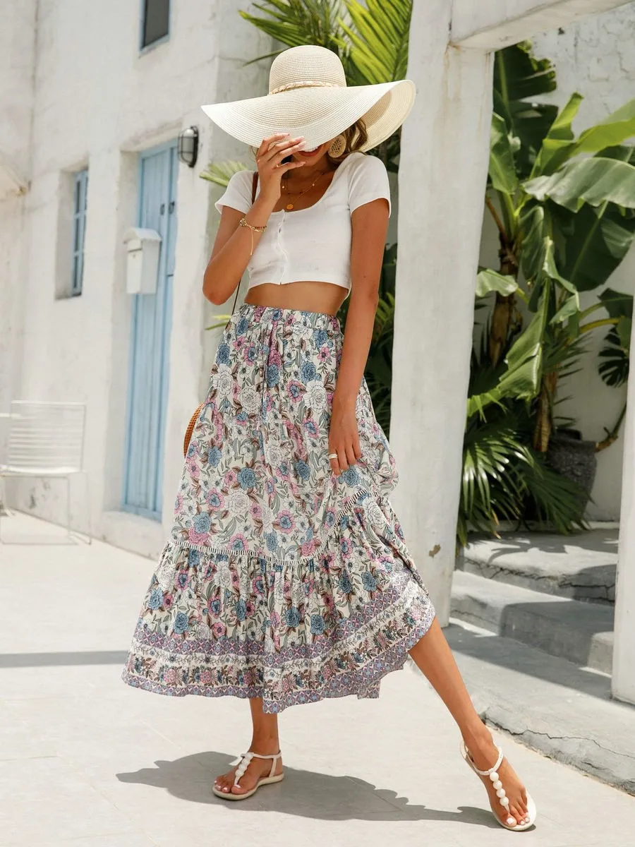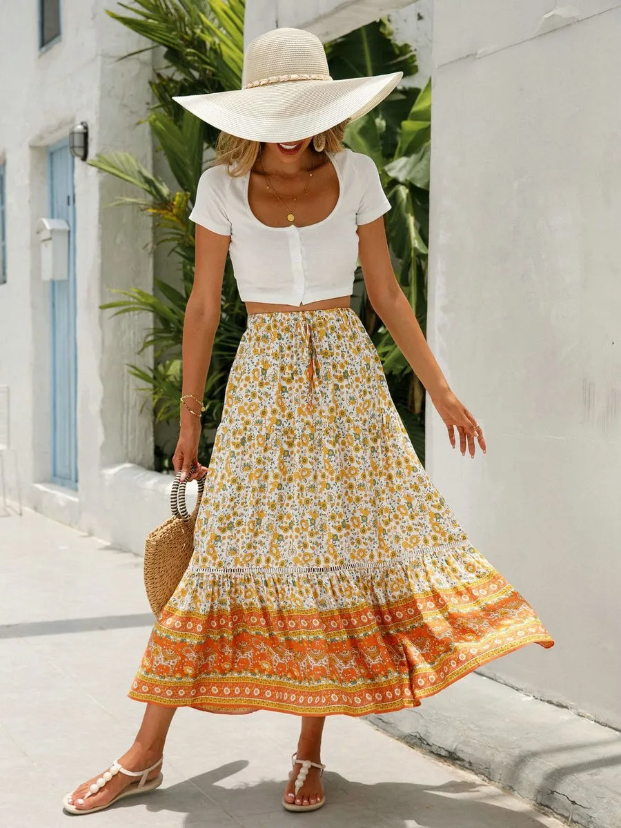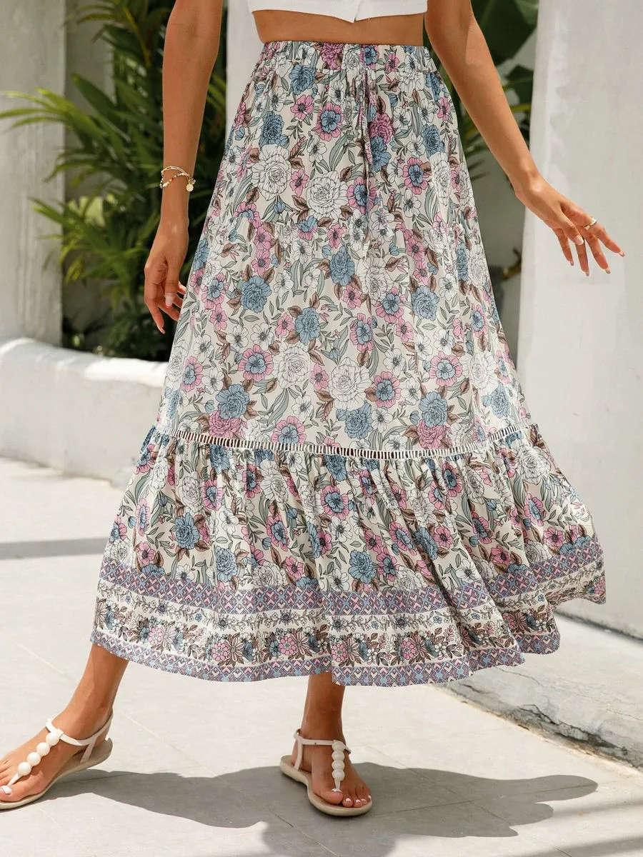 Mqtime Skirts For Women Trendy Summer Skirt Floral Printed Lace Stitching Long Skirt Viscose Bohemian Beach Holiday Skirt A-line