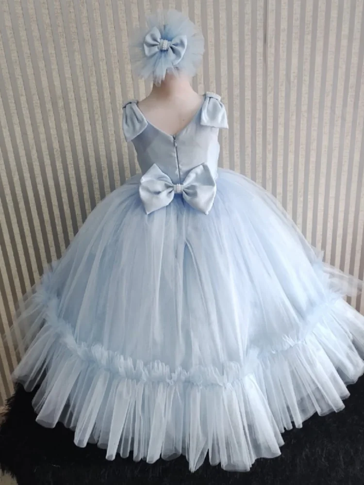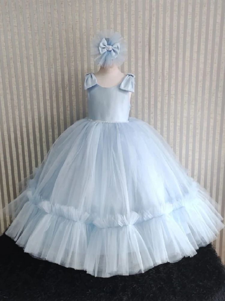 MQTIME - Sky Blue Flower Girl Dresses Tulle Puffy Pearls Belt With Bow Sleeveless For Wedding Birthday Party Banquet Princess Gowns