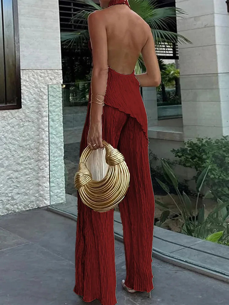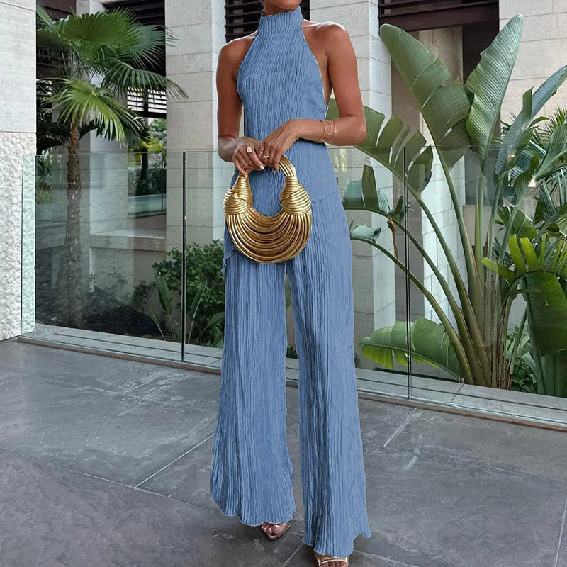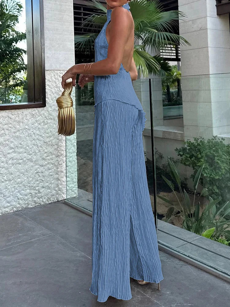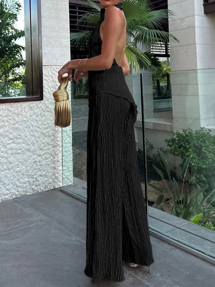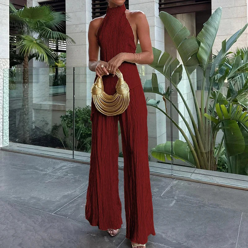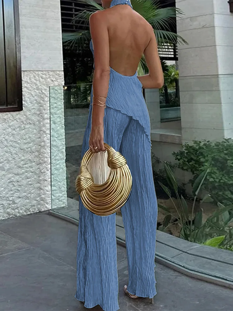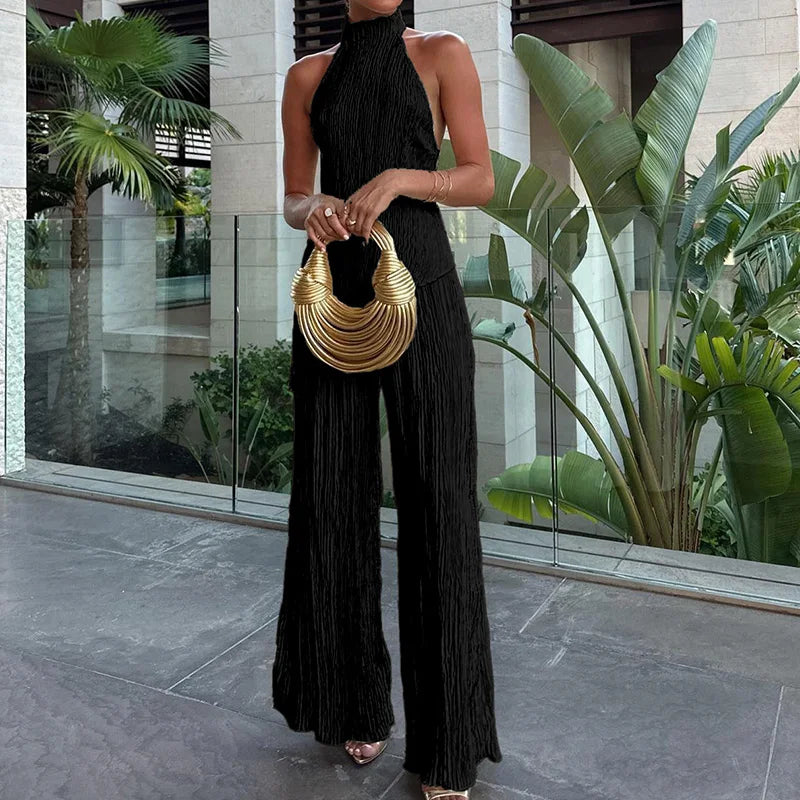 MQTIME - Sleeveless Fashion Solid Two Pieces Outfit, Women Summer Half High Collar Elegant Matching Sets, Backless Patchwork Ladies Suits