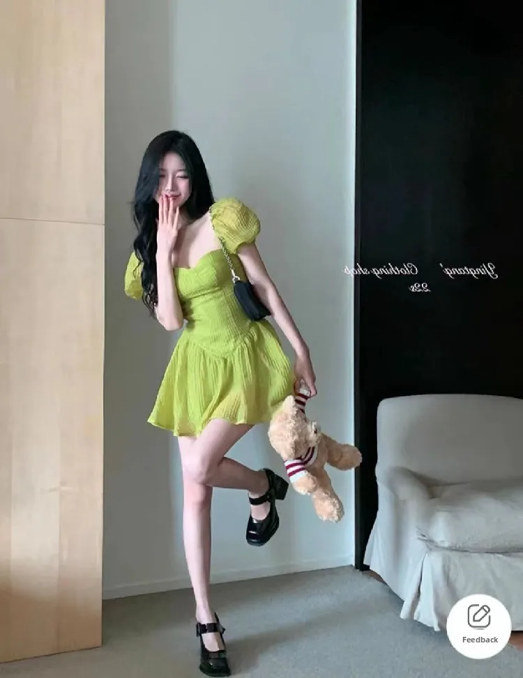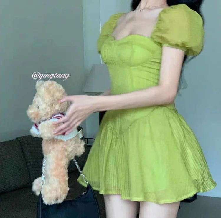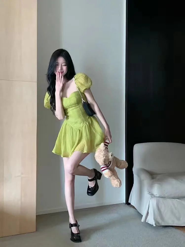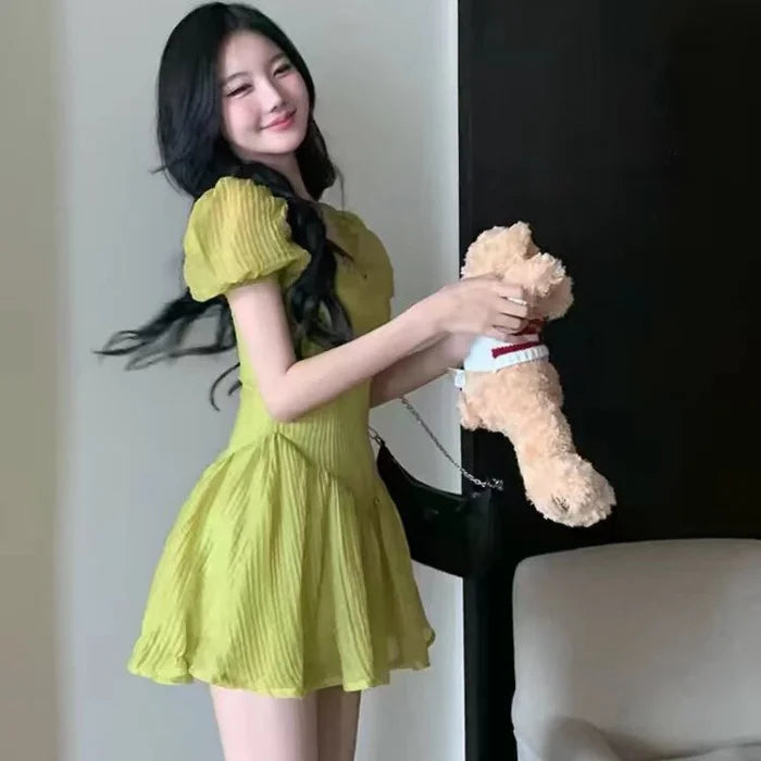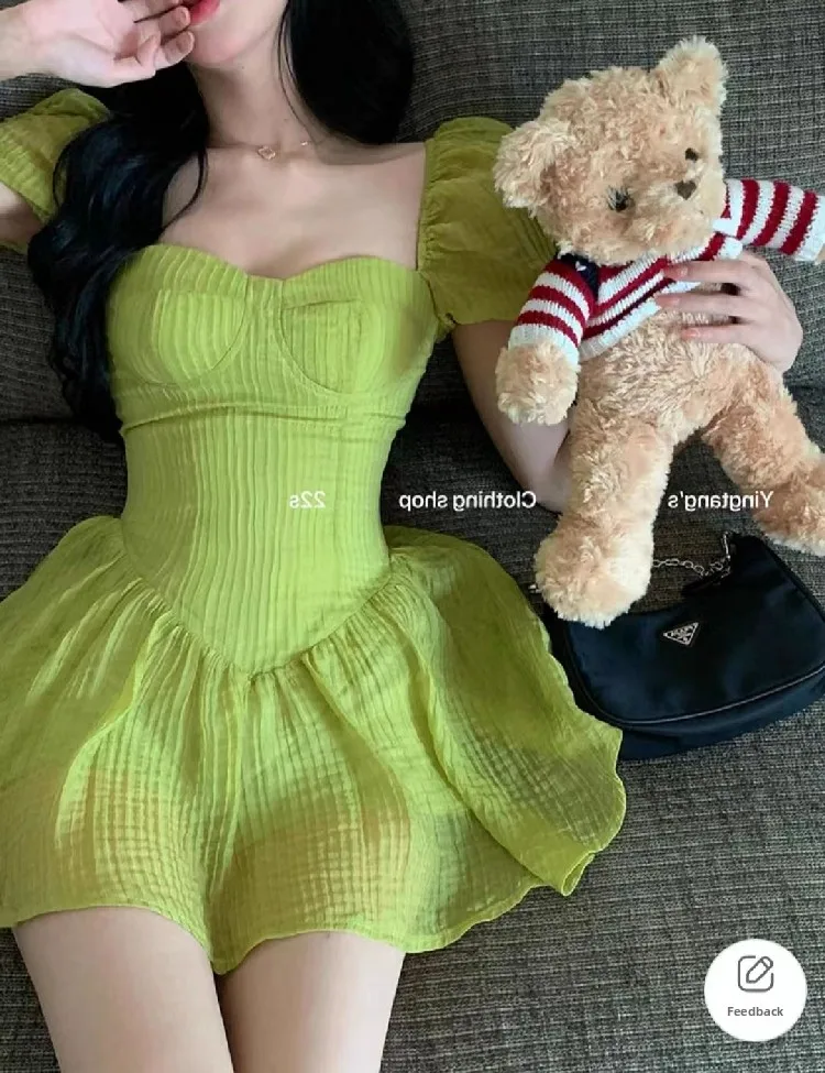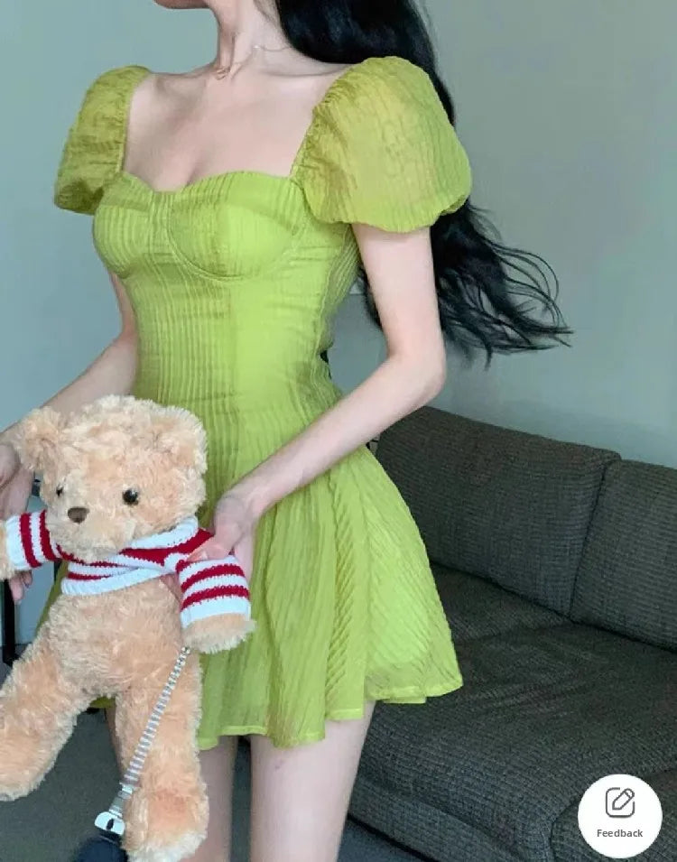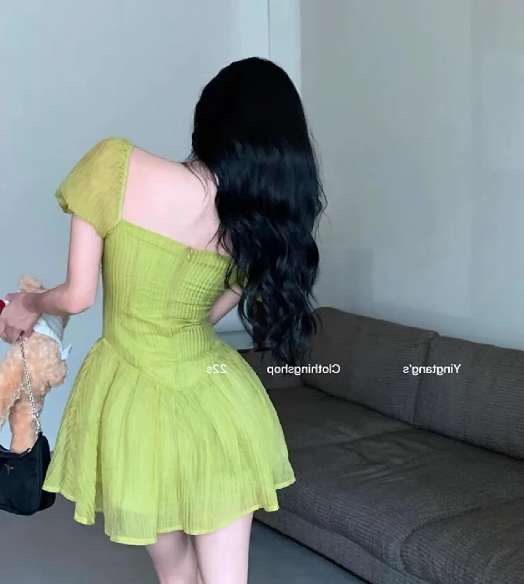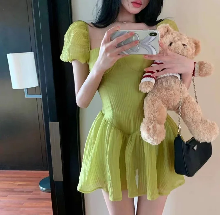 MQTIME  -  Slimming Bubble Hem Square Ne Chiffon ort Dr Women's Sexy Summer Sle Princ Waist Cinched Skirt