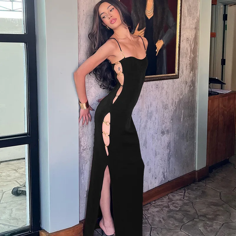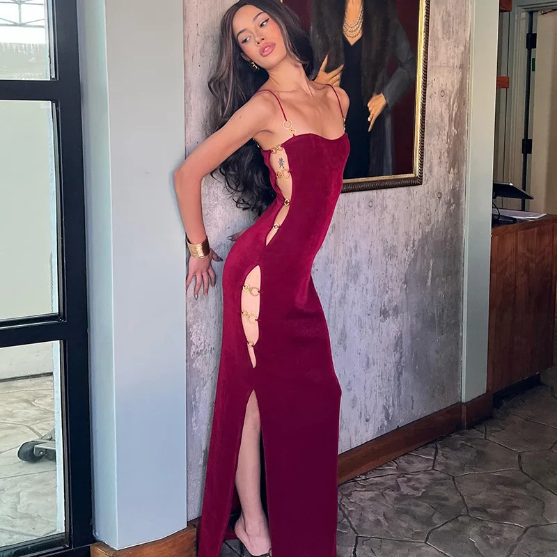 MQTIME - Spaghetti Straps Velvet Maxi Evening Party Dress Women Sexy Metal Ring Side Split Hollow Out Backless Bodycon Club Long Robe