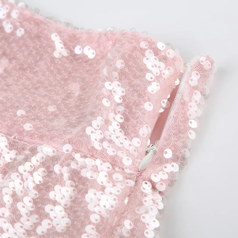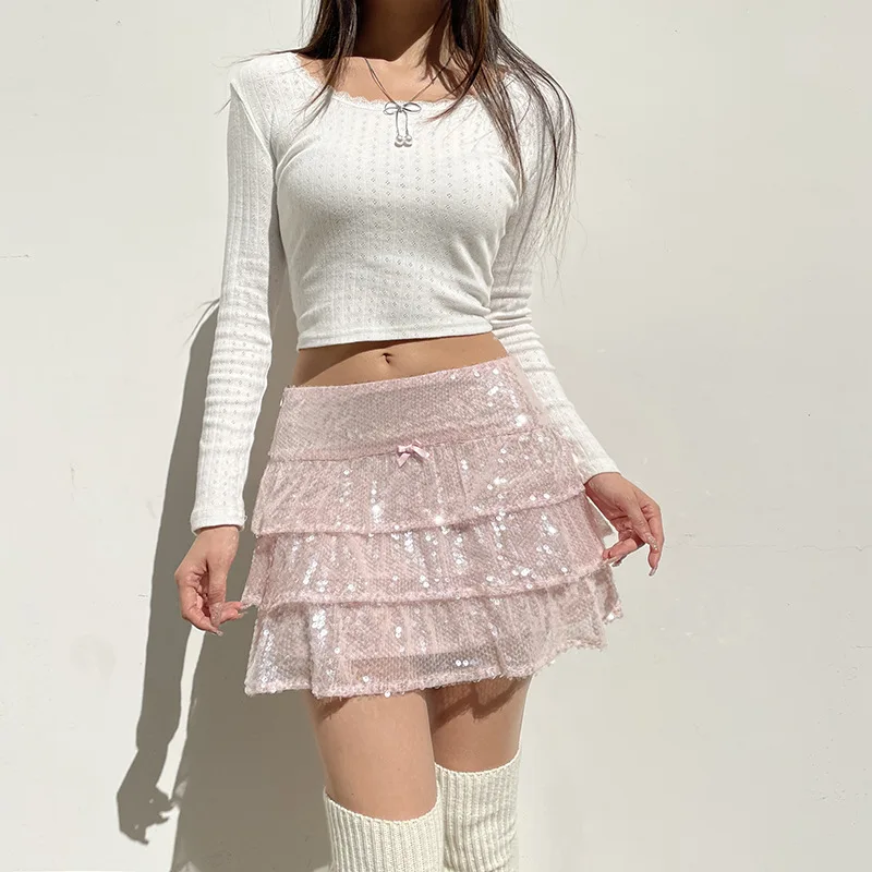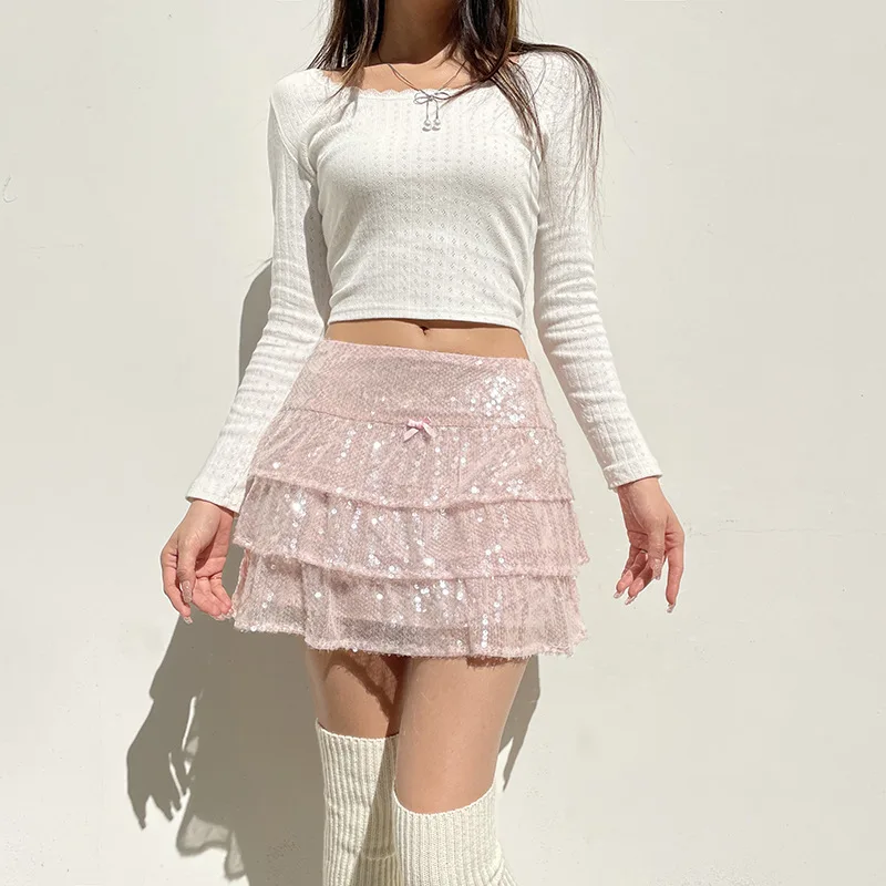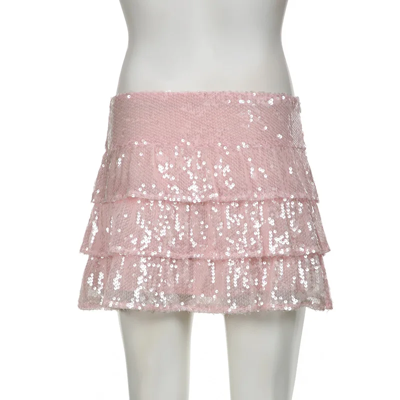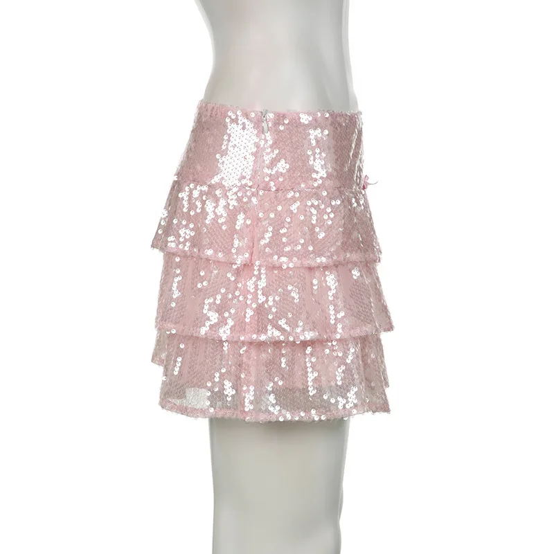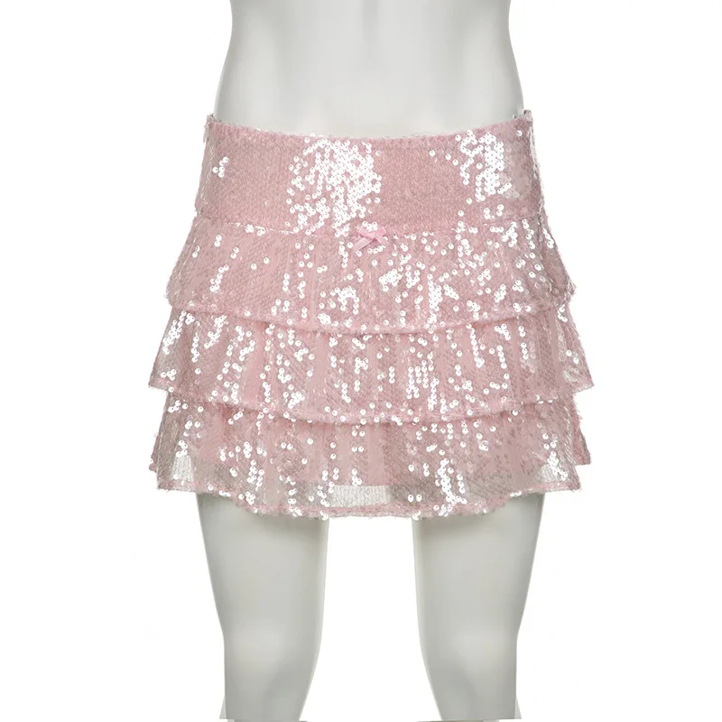 MQTIME - Spicy Girl Pure Short Mini Skirt Korean Style Pink Sequin Multi-layer Pleated Skirt Women's Bow High Waist Glossy A-line Skirts