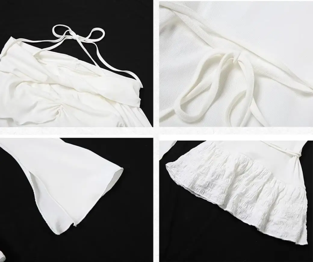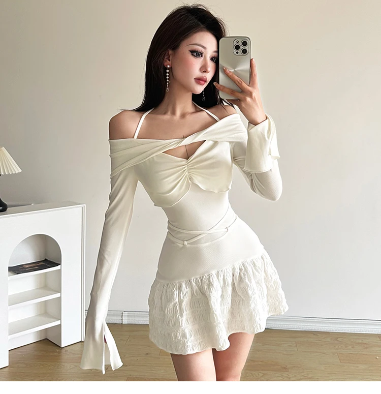 MQTIME - Spicy Girl Sexy Short Dress Women Spring Summer Hollowed Out Off Shoulder Pleated Dress Slim Waist Wrapped Hip White Dress