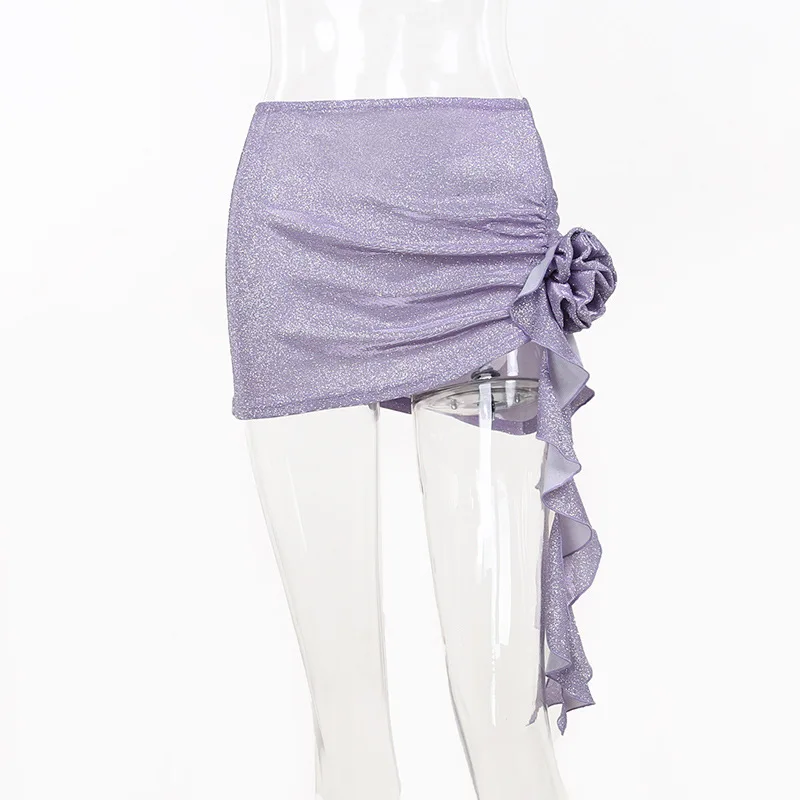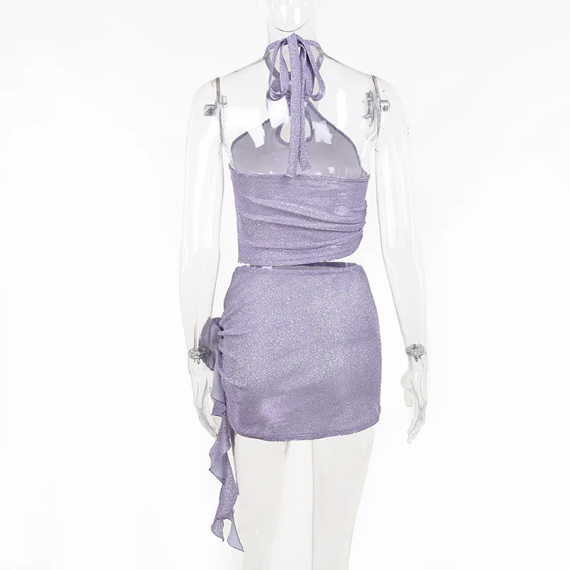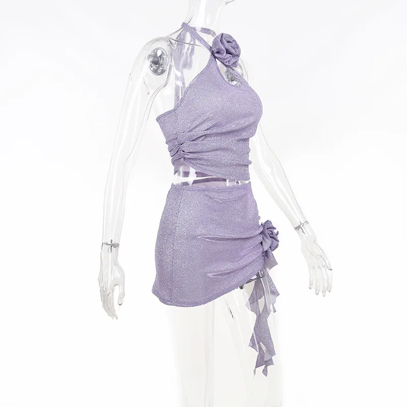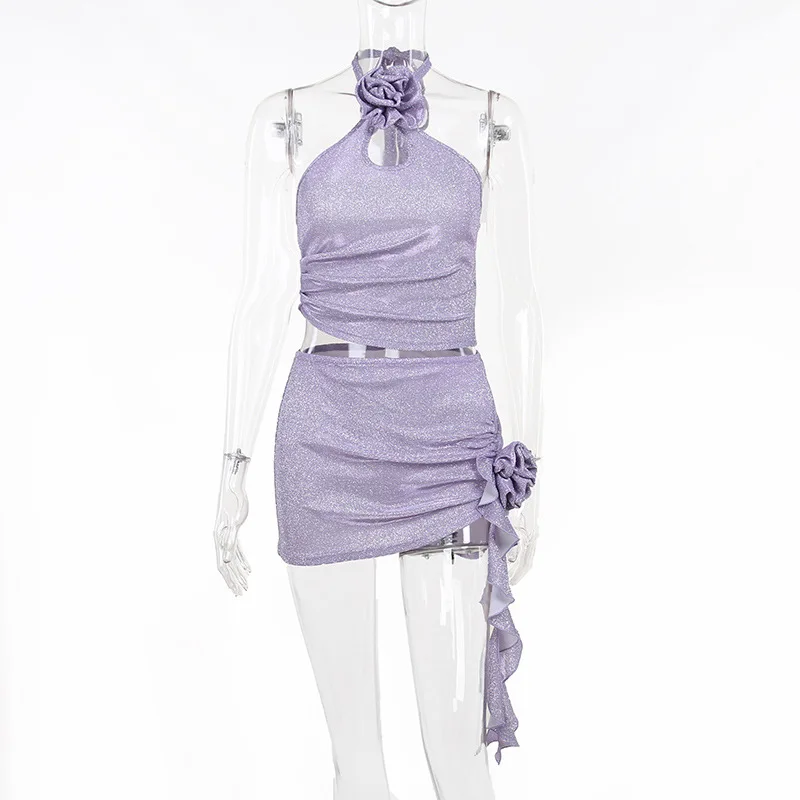 MQTIME  -  Spicy Summer Two Piece Set Women 3D Flower Halter Crop Top and Bodycon Skirts Sexy 2 Piece Suits Y2K Glitter Nightclub Outfits