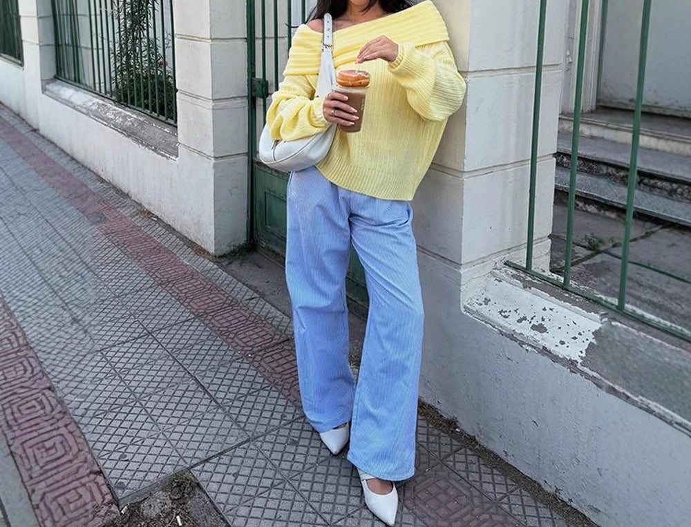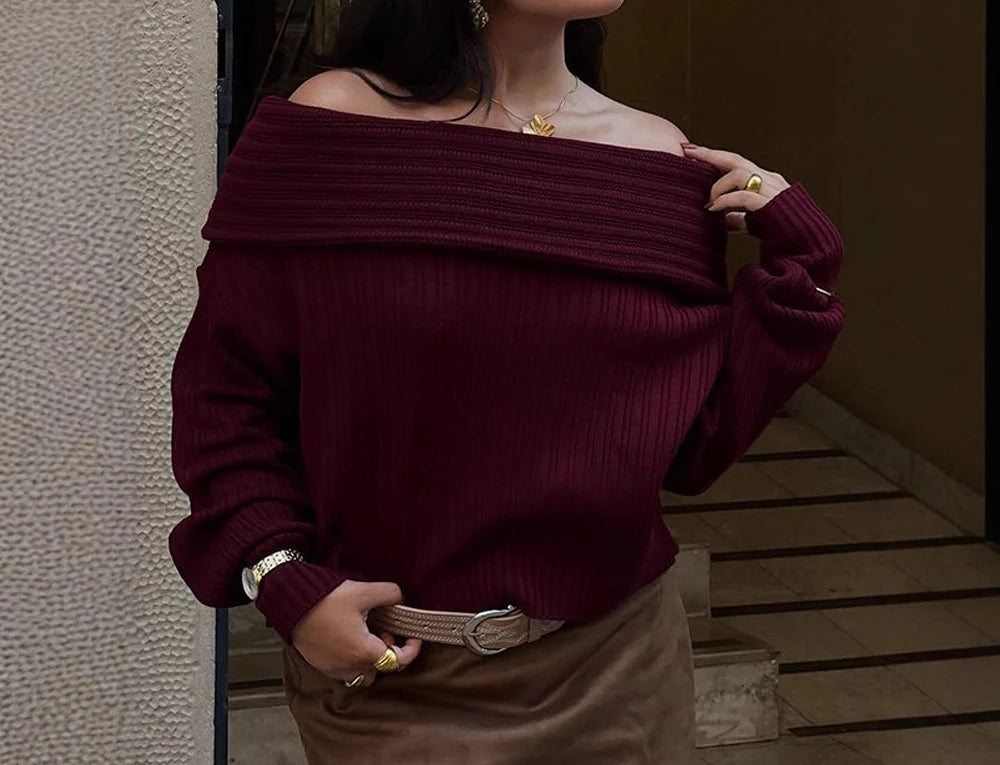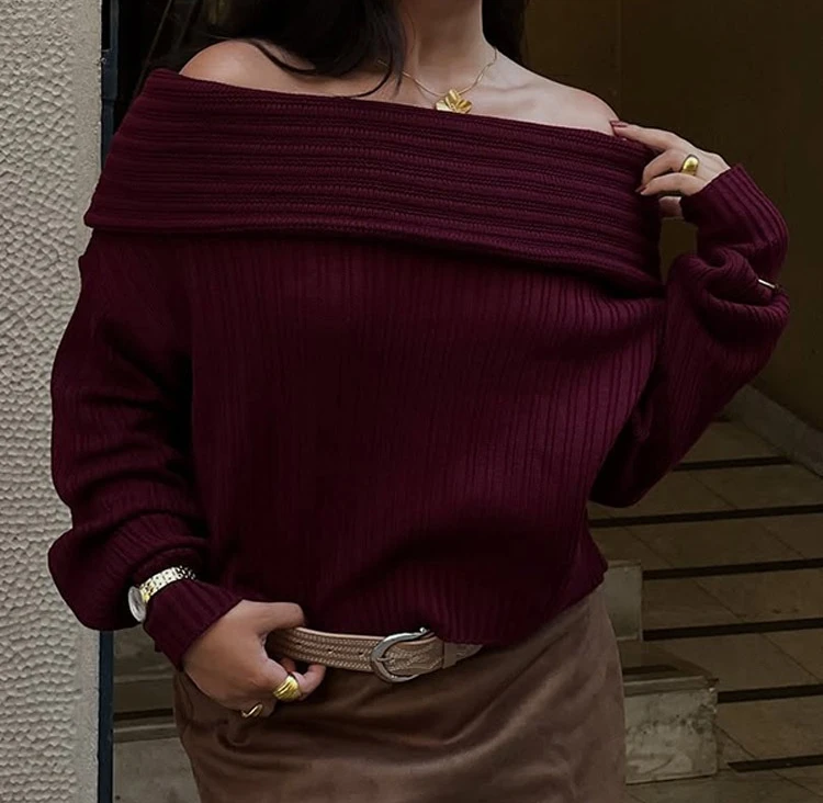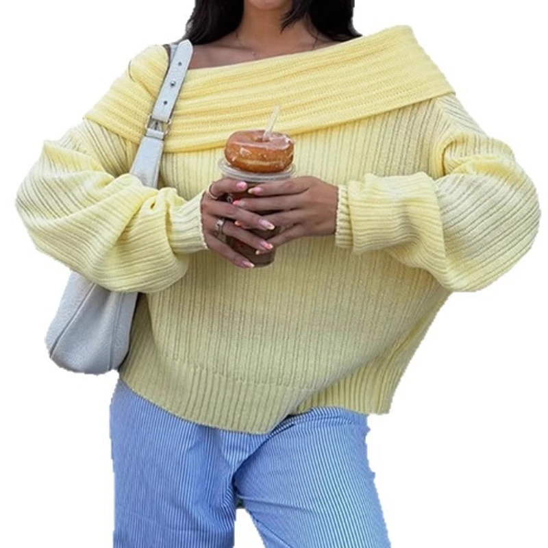 MQTIME - Spring and Autumn Foreign Fashion Fashionable Straight Neck Solid Color Off-the-shoulder Clavicle Sweater Women's 2025 New Style