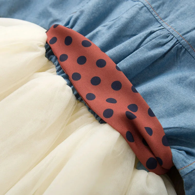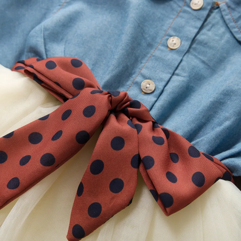 MQTIME - Spring Autumn Girls Dress Korean Version Denim Stitching Mesh Dress + Detachable Polka Dot Belt Suit Dress