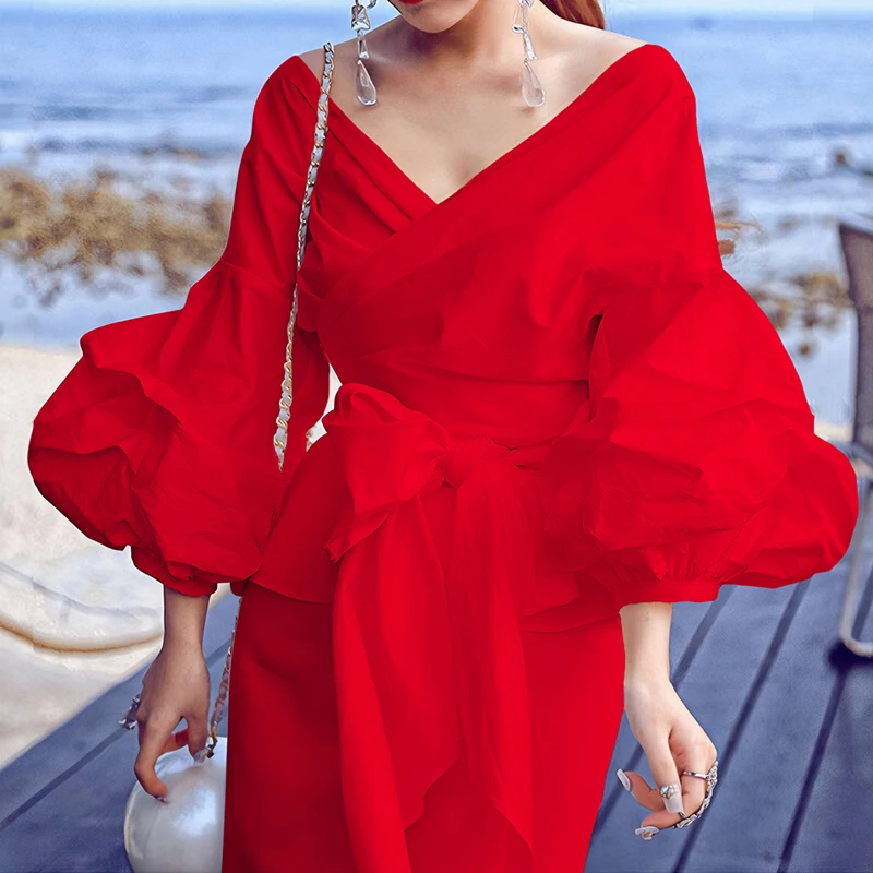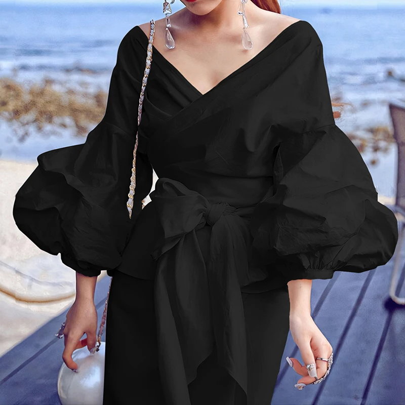 MQTIME - Spring Elegant V-Neck Puff Sleeve Office Blouse Women Fashion High Street Office Pullover French Style Solid Lace-up Shirts