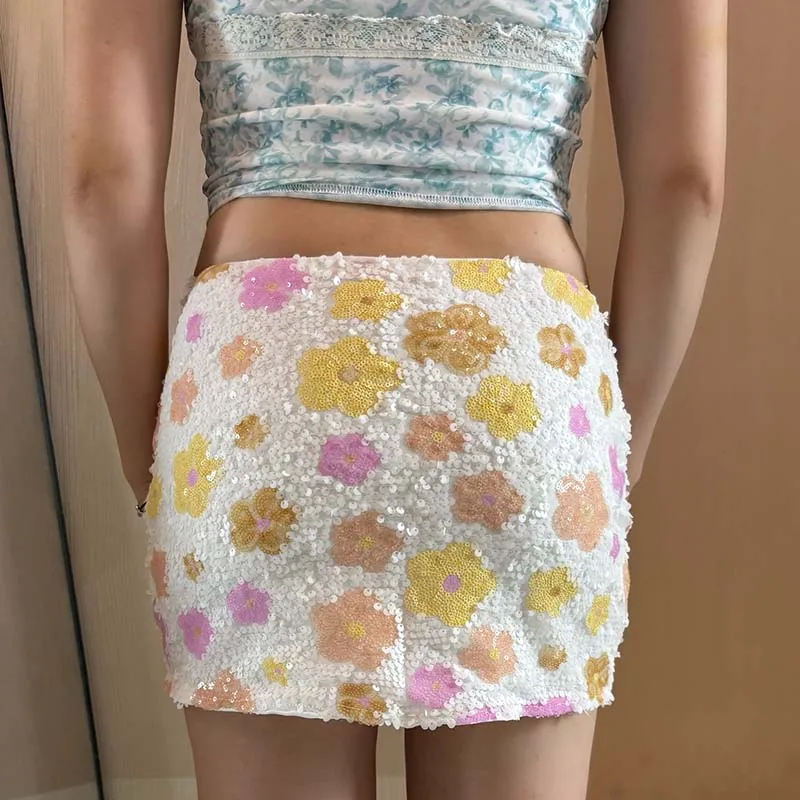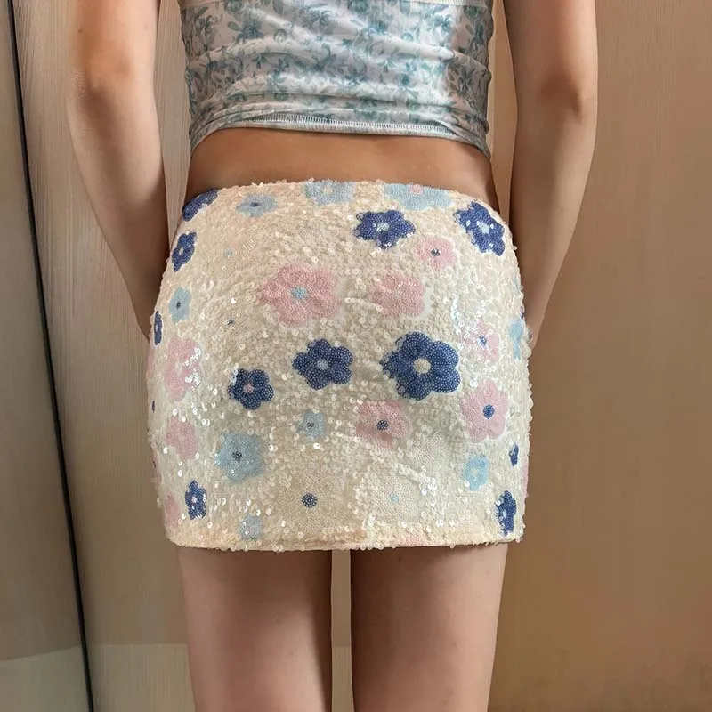 MQTIME - Spring Fashion Flower Print Sequin Skirts for Women Sexy High Waist Slim Hips Short Skirt Summer Chic Clubwear Party Mini Skirts