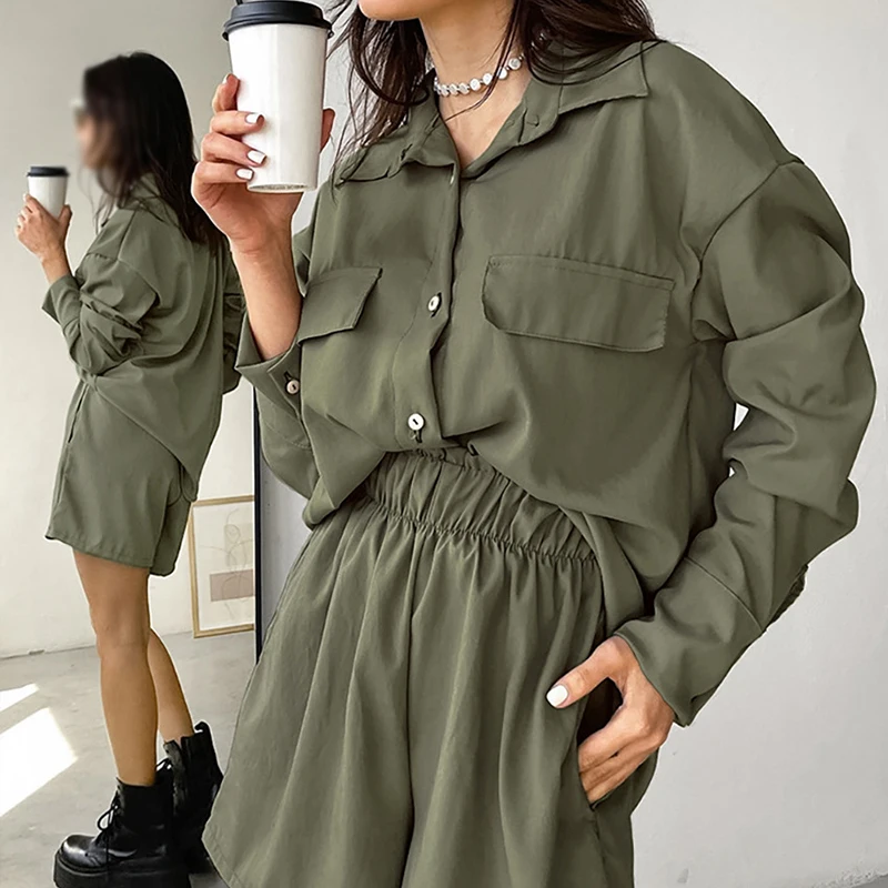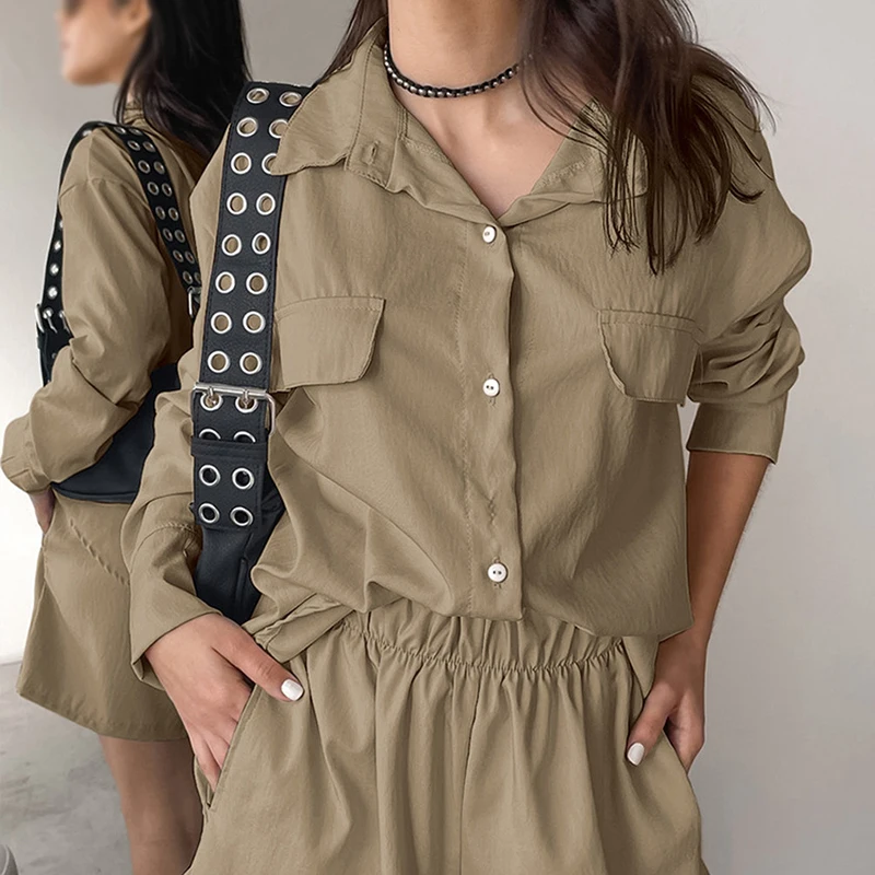 MQTIME - Spring Simple Solid Women's Two Piece Set Casual Lapel Long Sleeved Shirt and Shorts Suit Fashion High Street Personality Outfit