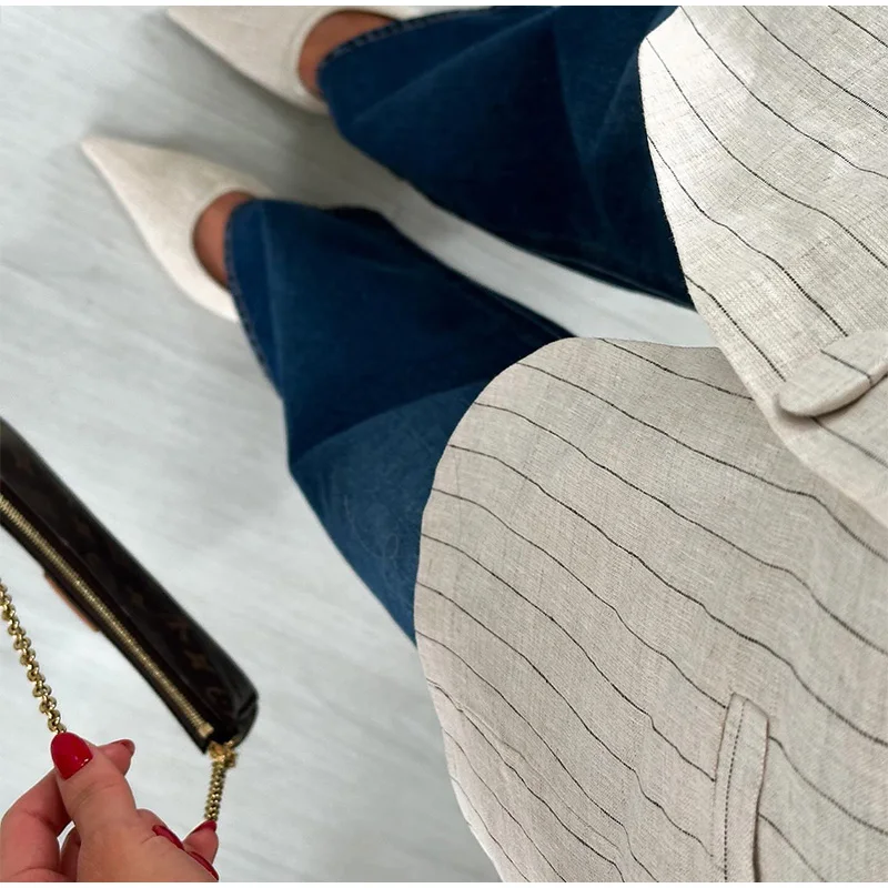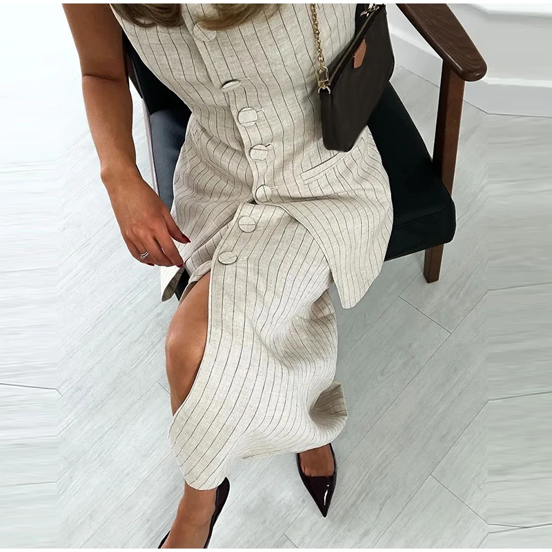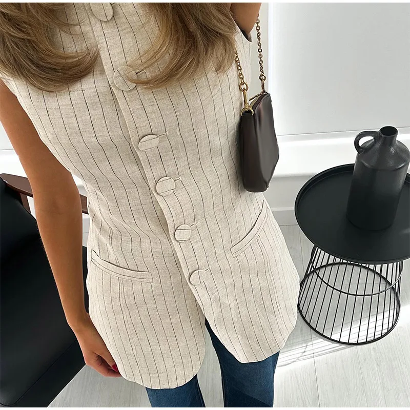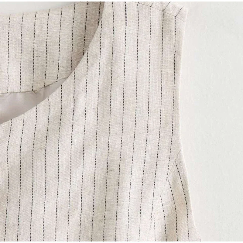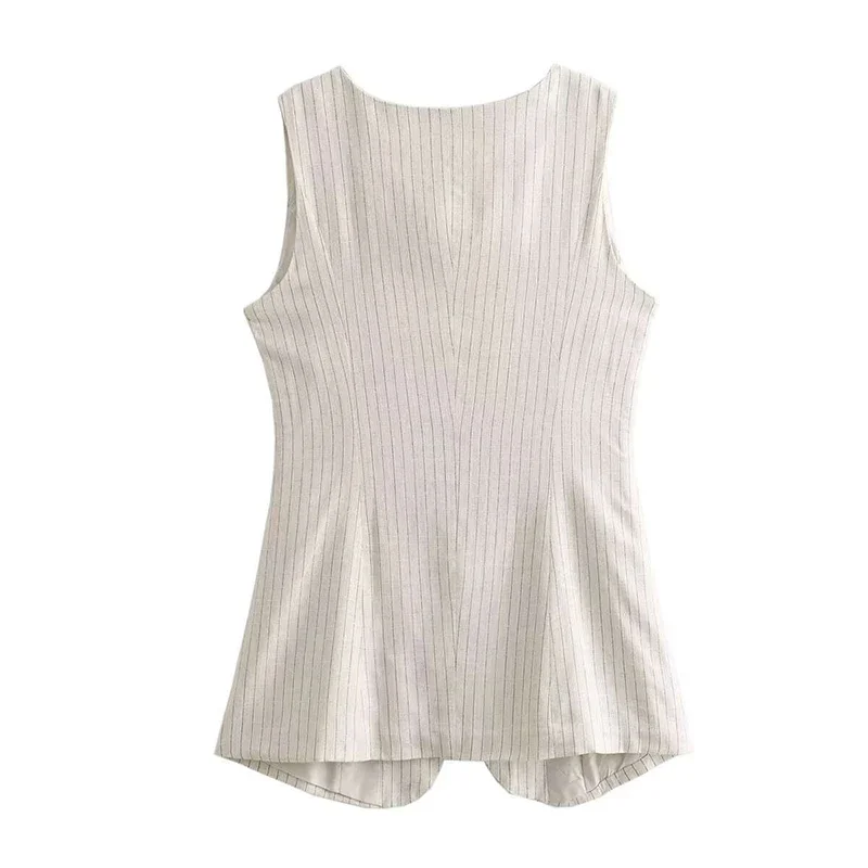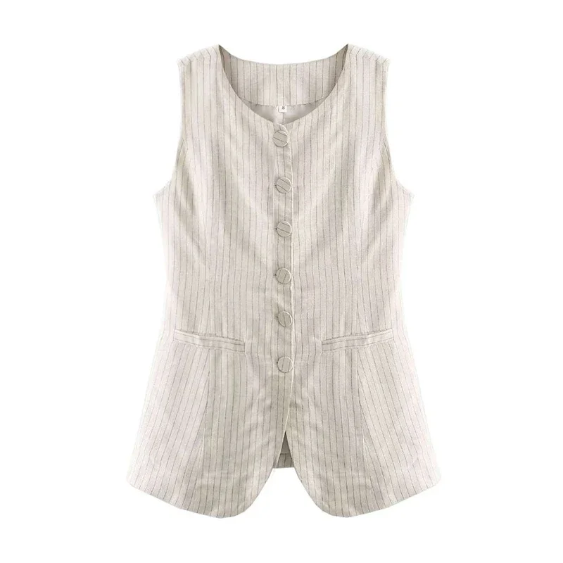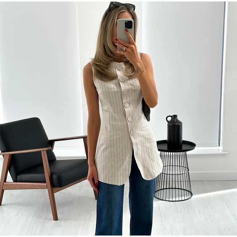 MQTIME  -  Striped Sleeveless Vest Women Casual O-neck Slim Single-breasted Long Jackets Female Vintage Offiice Lady Top Fashion Streetwear