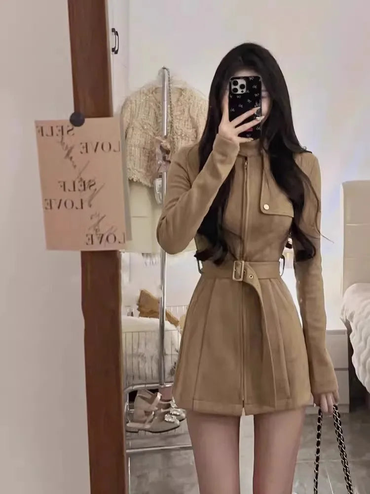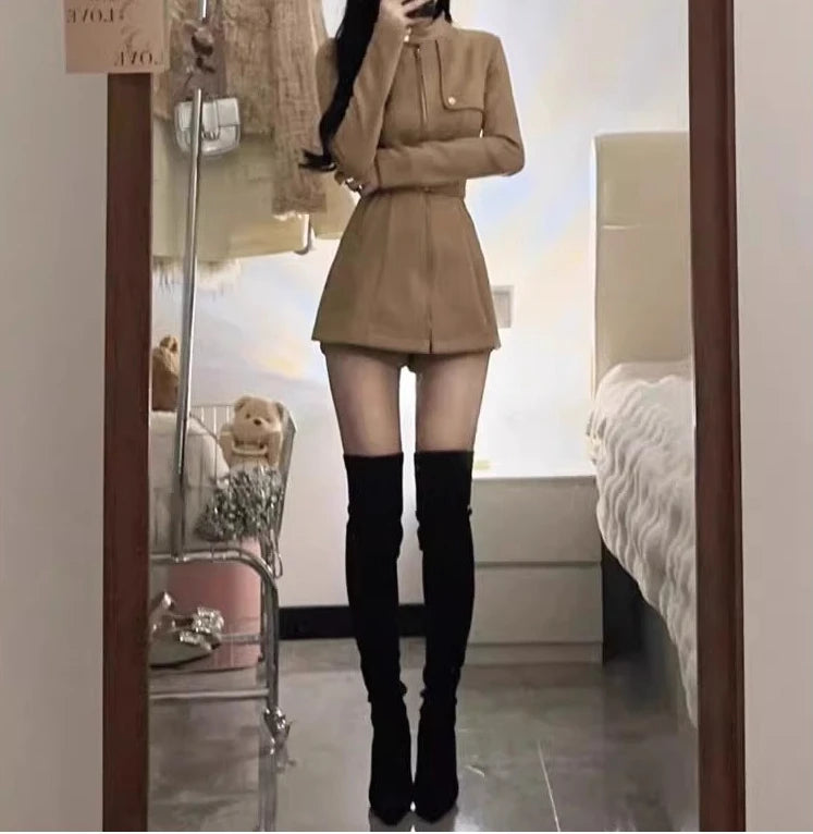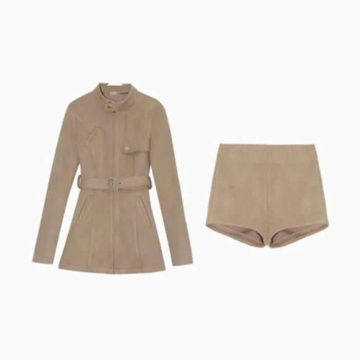 MQTIME - Suede Suit, Women's Autumn and Winter Waist Slim Fit, Hot Girl High-end Stand-up Collar Jacket, Thin Shorts Two-piece Set