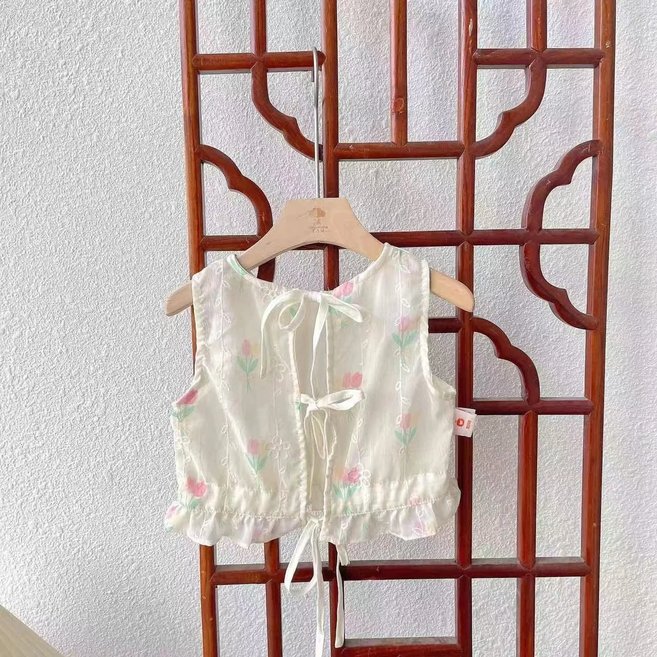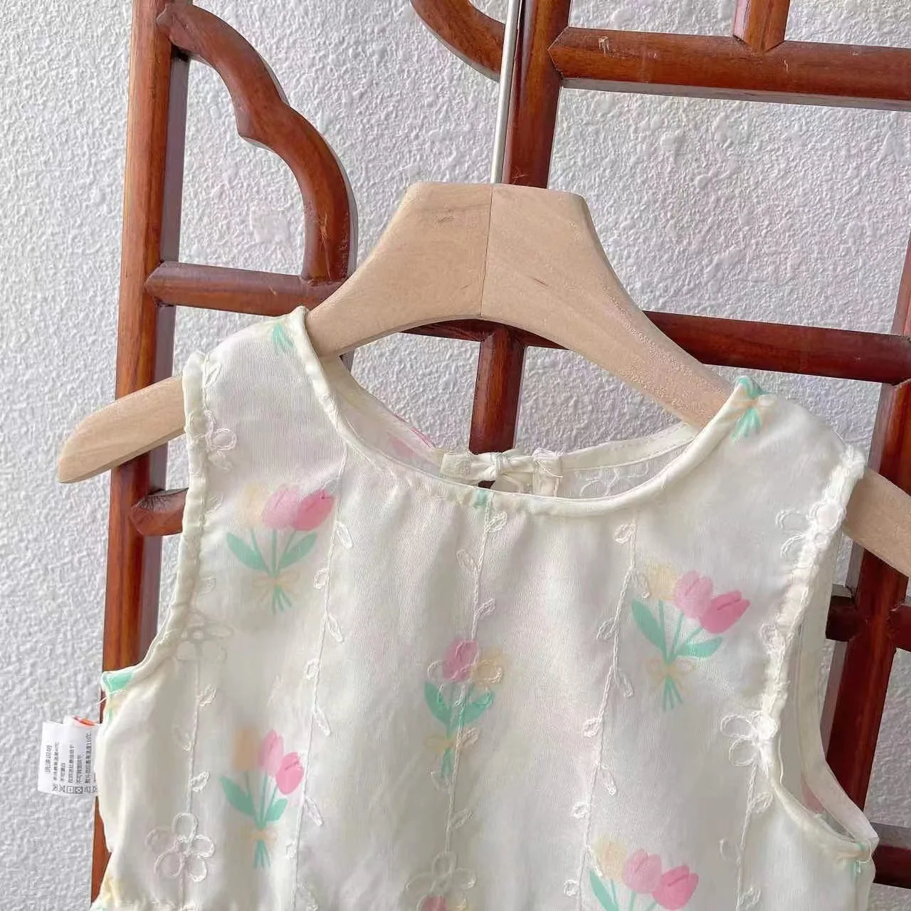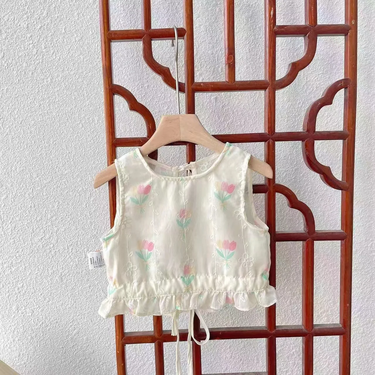 MQTIME - Summer Baby Girl Outfits 2024 Tulip Full Printed Kid Girl Vest+cool Pant Suits Cool Muslin Rainbow Slip Top Solid Flare Pant Set