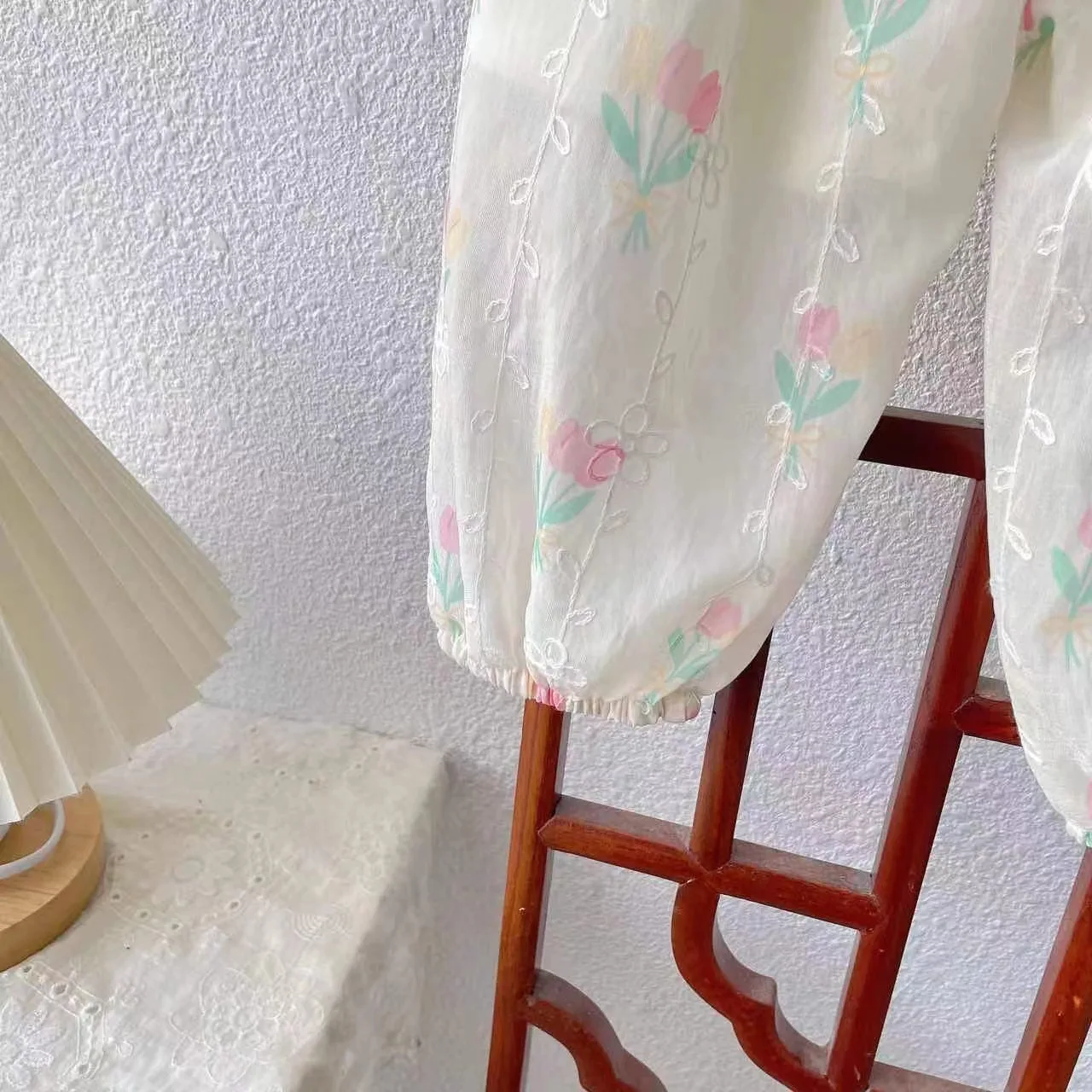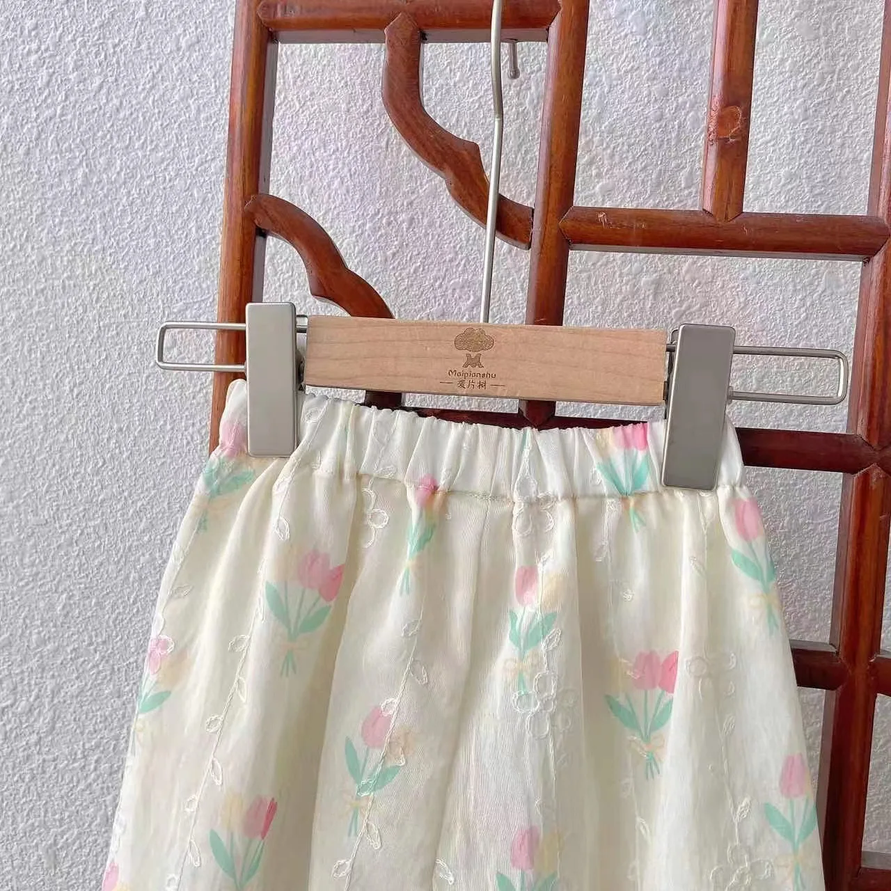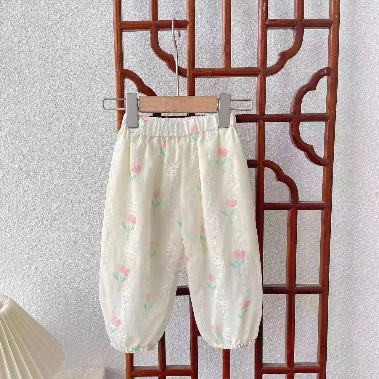 MQTIME - Summer Baby Girl Outfits 2024 Tulip Full Printed Kid Girl Vest+cool Pant Suits Cool Muslin Rainbow Slip Top Solid Flare Pant Set