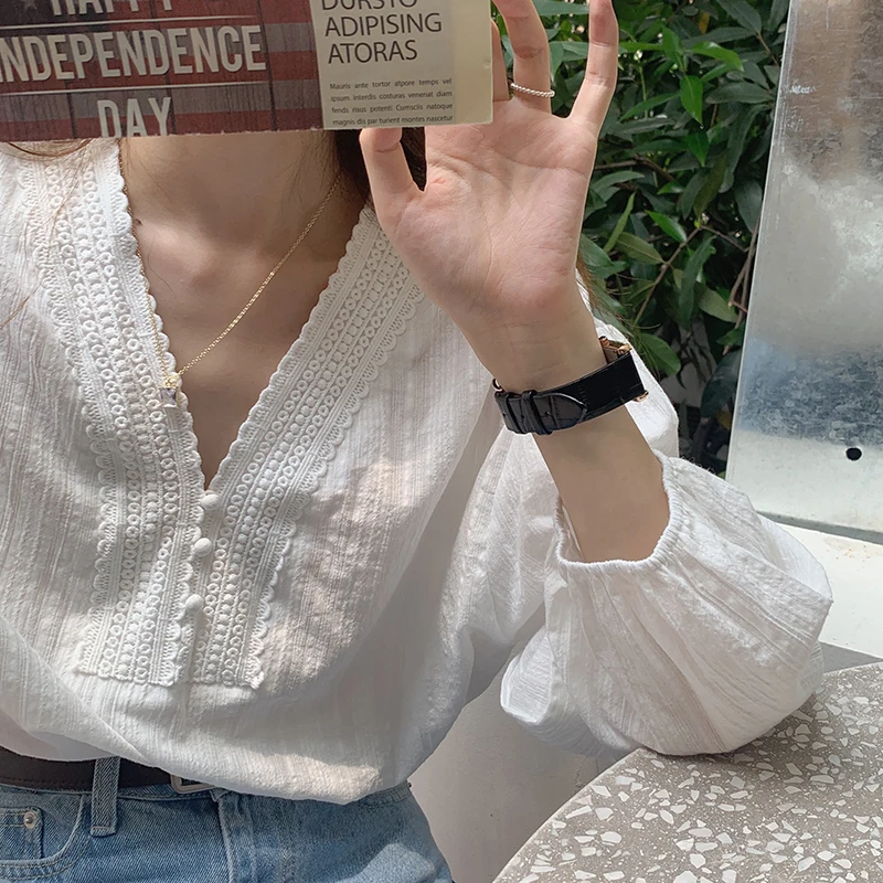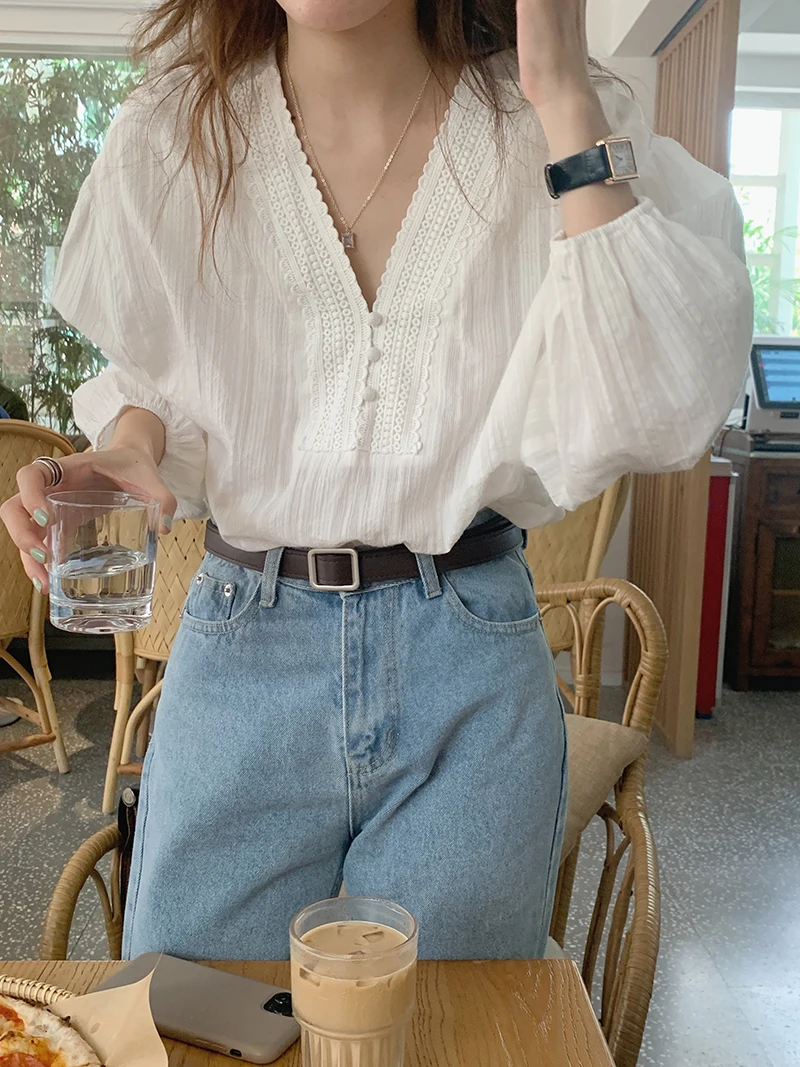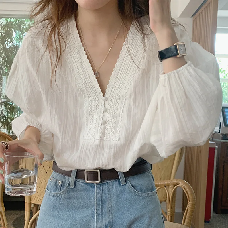 MQTIME - Summer Boho Style White Blouse for Women Elegant V-neck Hollowed Out Lace Hook Flower Loose Shirt Vacation Beach Chemises