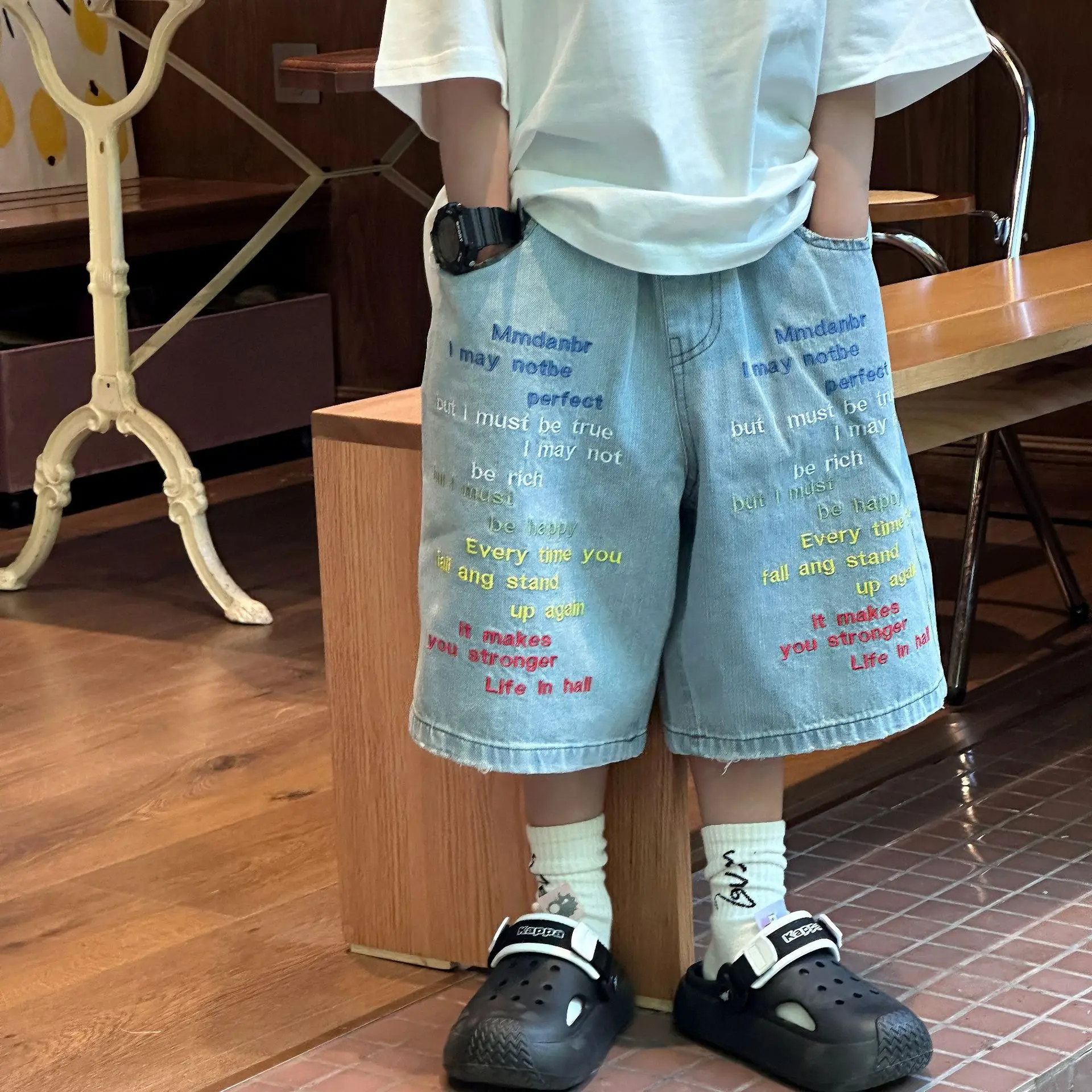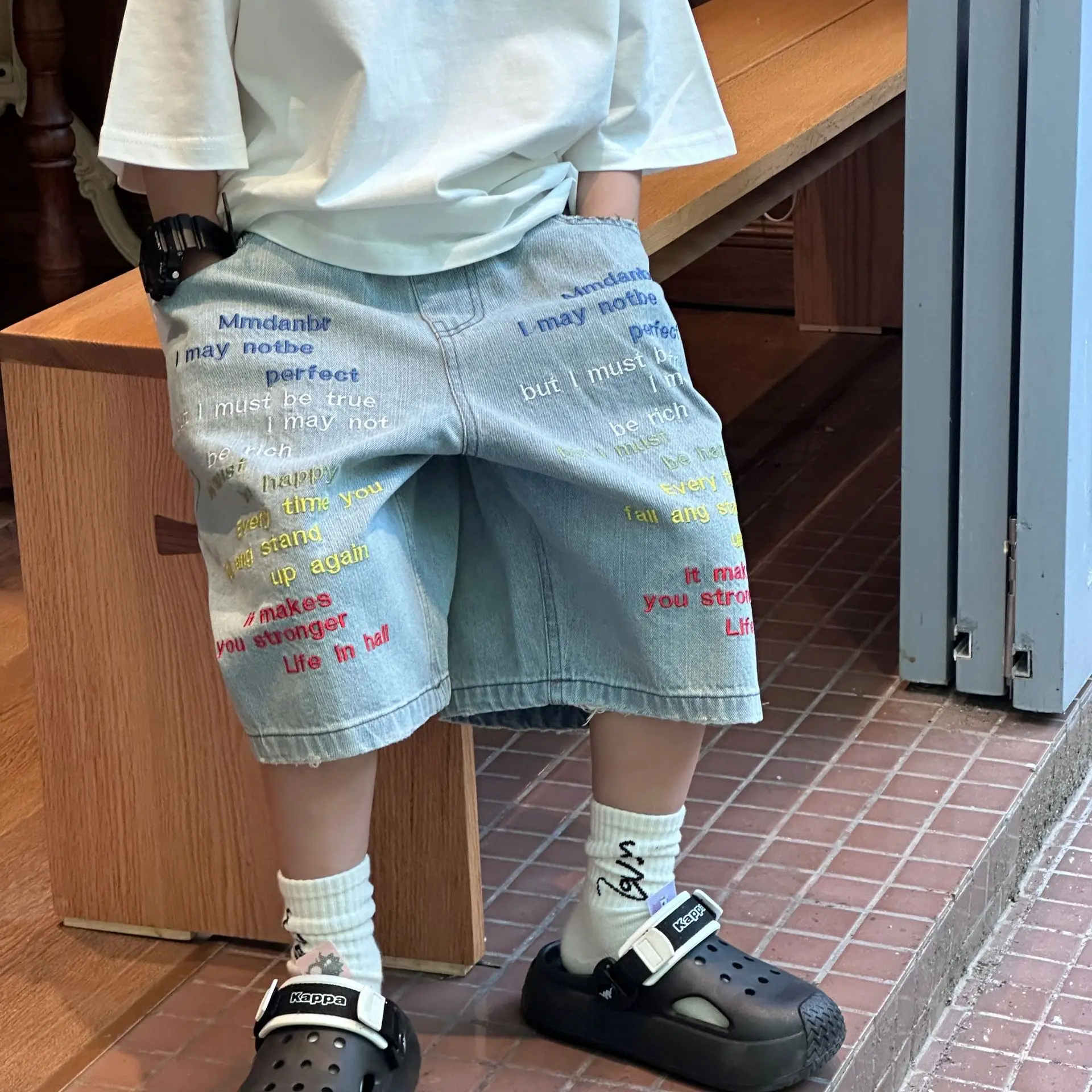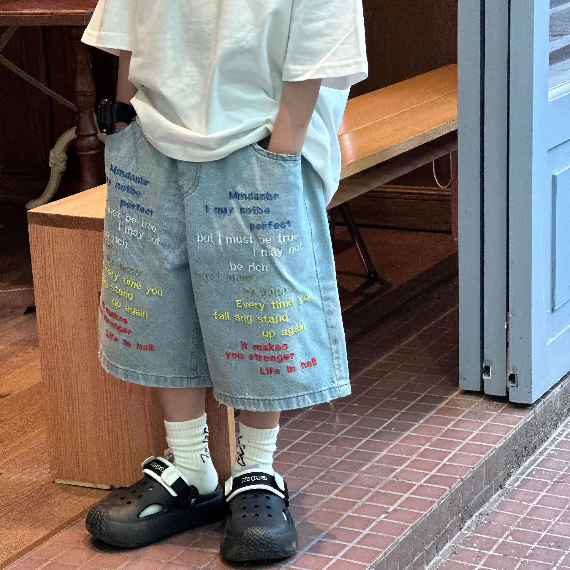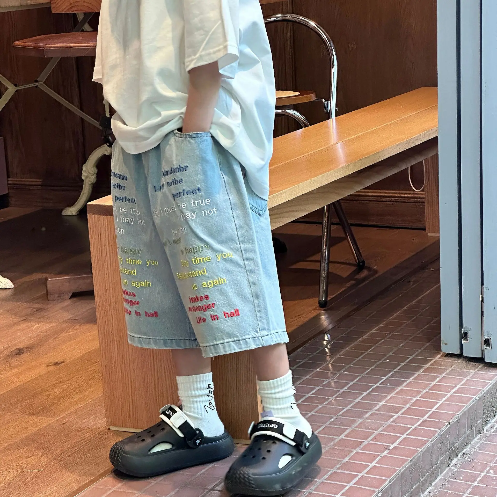 MQTIME - Summer Children Boys Denim Shorts Thin Rainbow Letter Printed Baby Boys Board Shorts Loose Versatile Knee-length Kids Boys Jeans