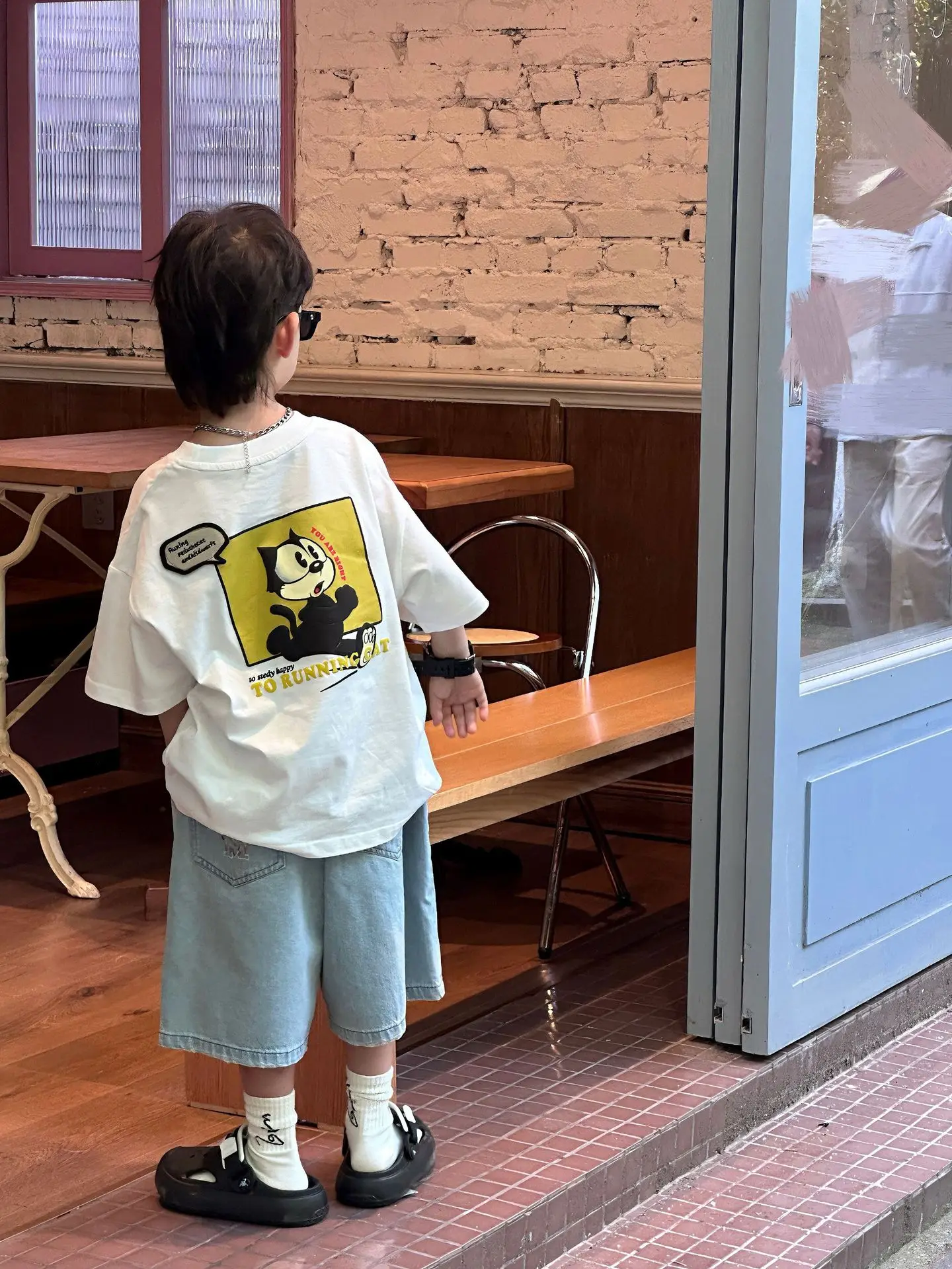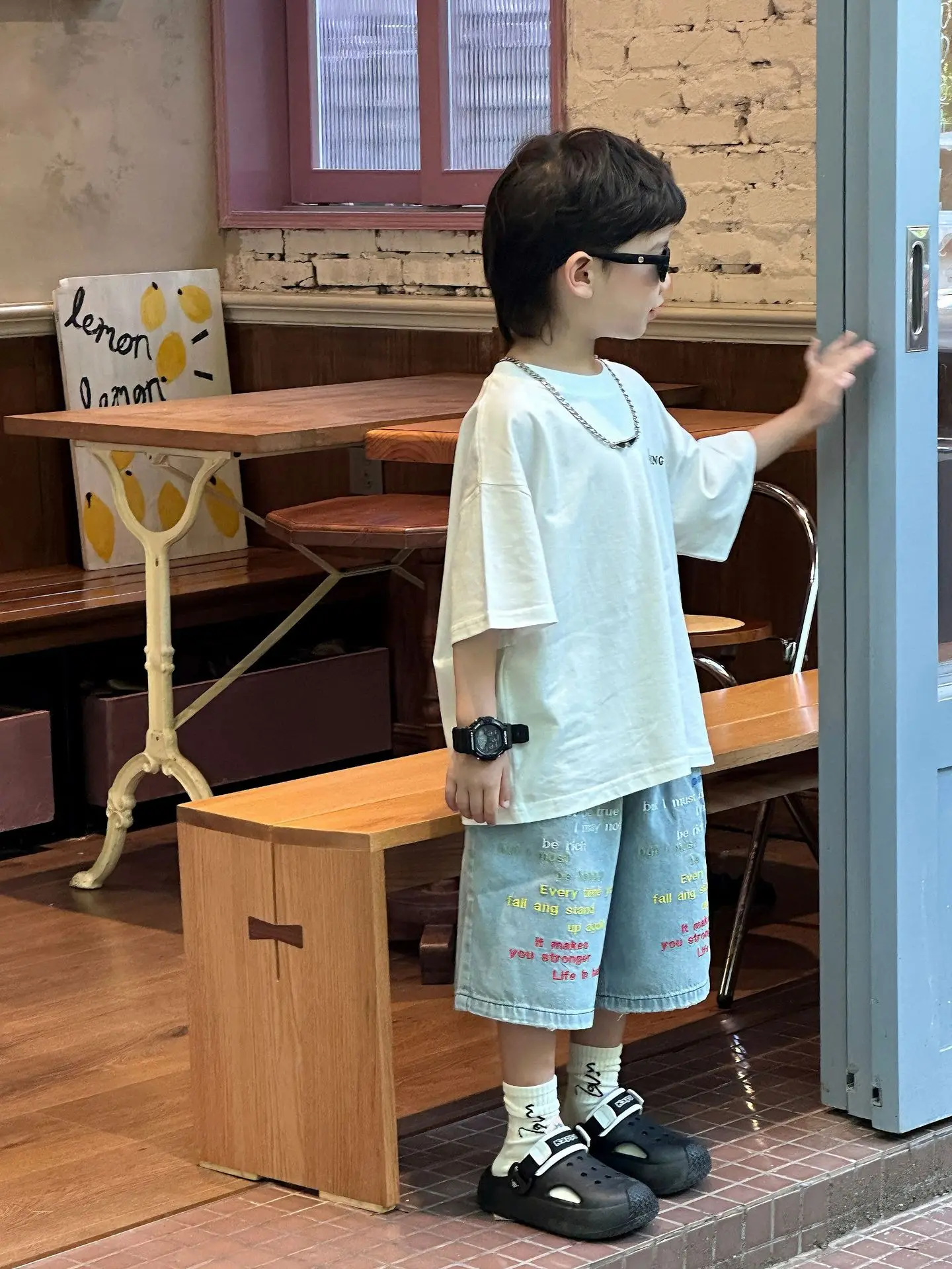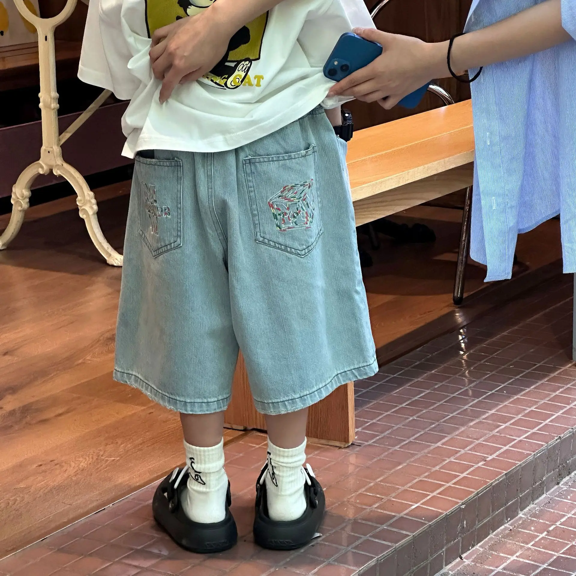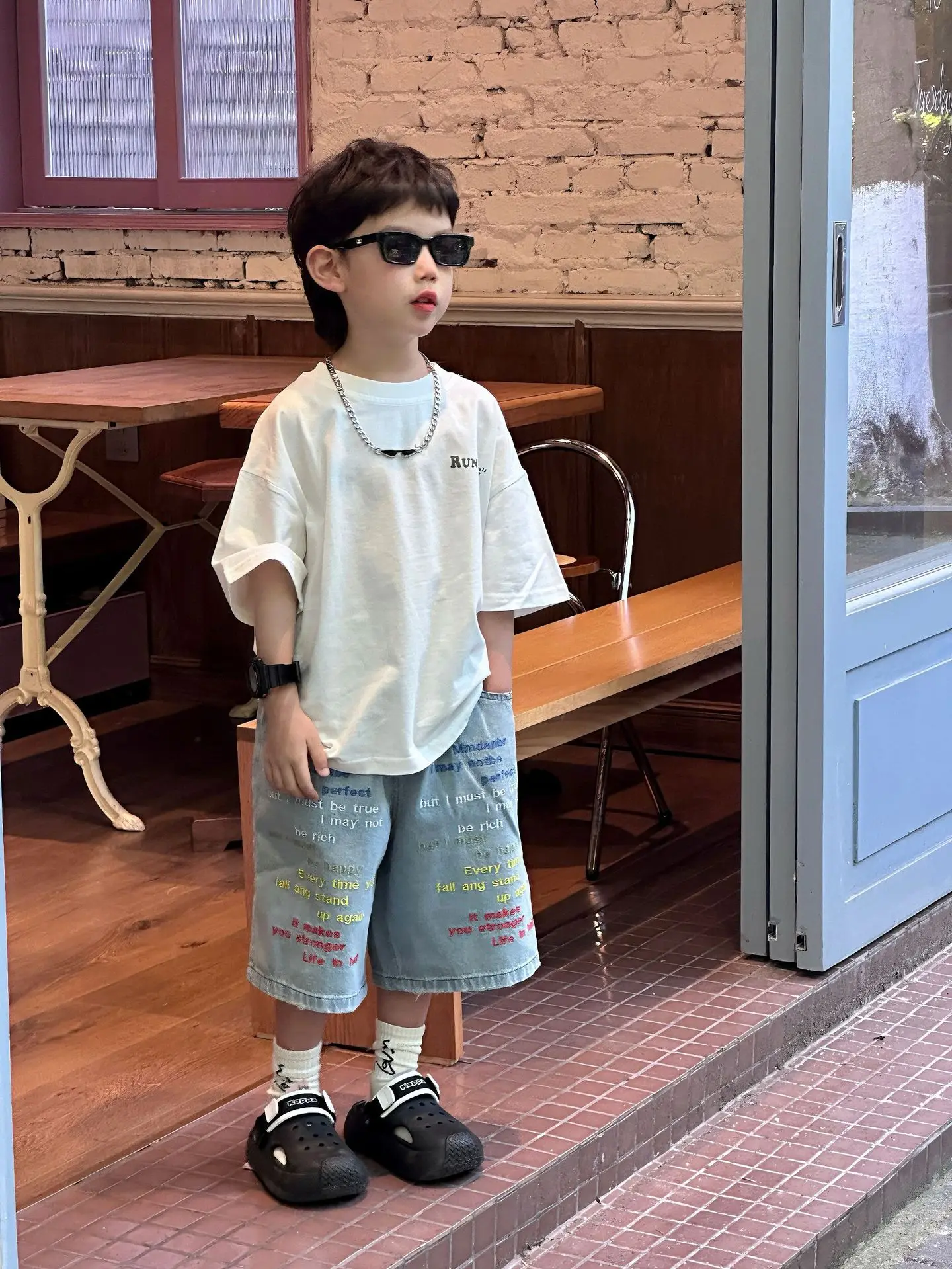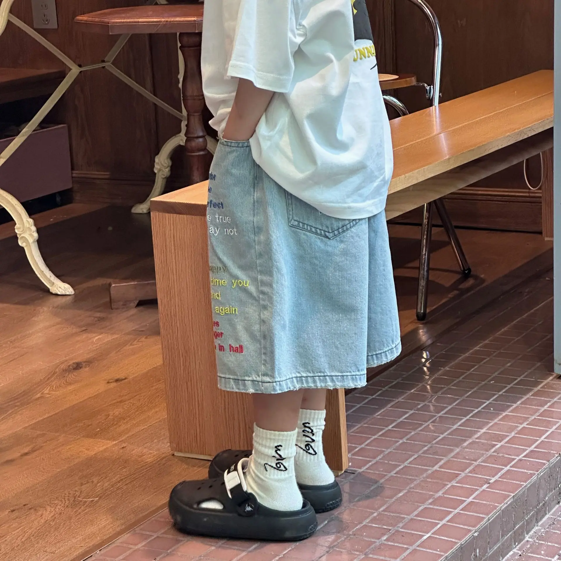 MQTIME - Summer Children Boys Denim Shorts Thin Rainbow Letter Printed Baby Boys Board Shorts Loose Versatile Knee-length Kids Boys Jeans