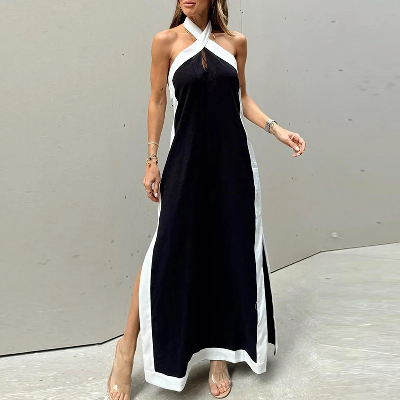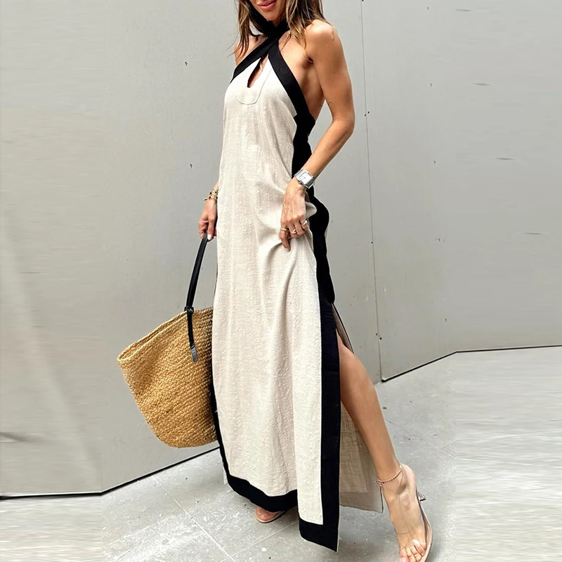 MQTIME  -  Summer Cotton Linen Loose Sleeveless Dress Fashion Color Blocking Halter Lady Party Dress New Casual High Waist Split Long Dress