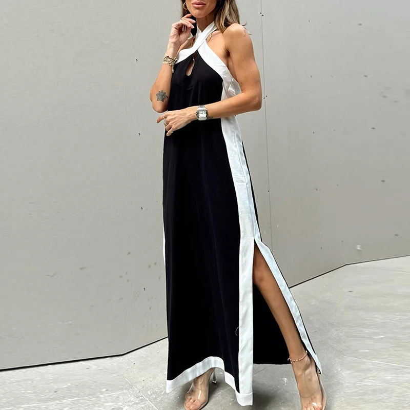 MQTIME - Summer Cotton Linen Loose Sleeveless Dress Fashion Color Blocking Halter Lady Party Dress New Casual High Waist Split Long Dress