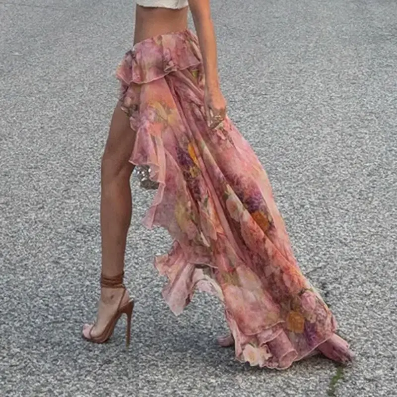 MQTIME  -  Summer French Fairy Vacation Style Ruffle Edge Mesh Skirt Summer Irregular Fragmented Flower Spicy Girl Long Skirts for Women