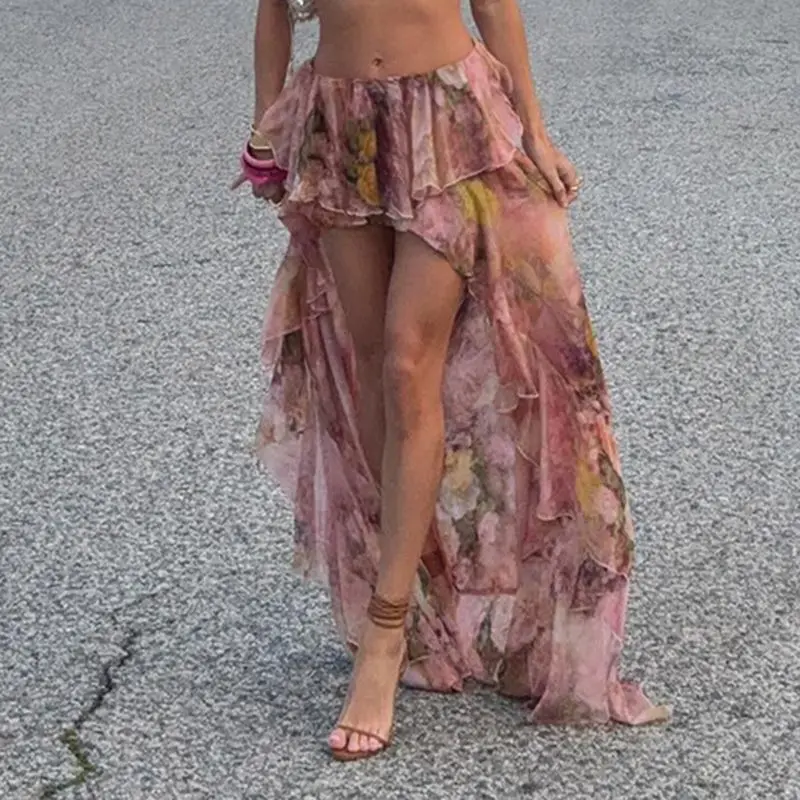 MQTIME - Summer French Fairy Vacation Style Ruffle Edge Mesh Skirt Summer Irregular Fragmented Flower Spicy Girl Long Skirts for Women